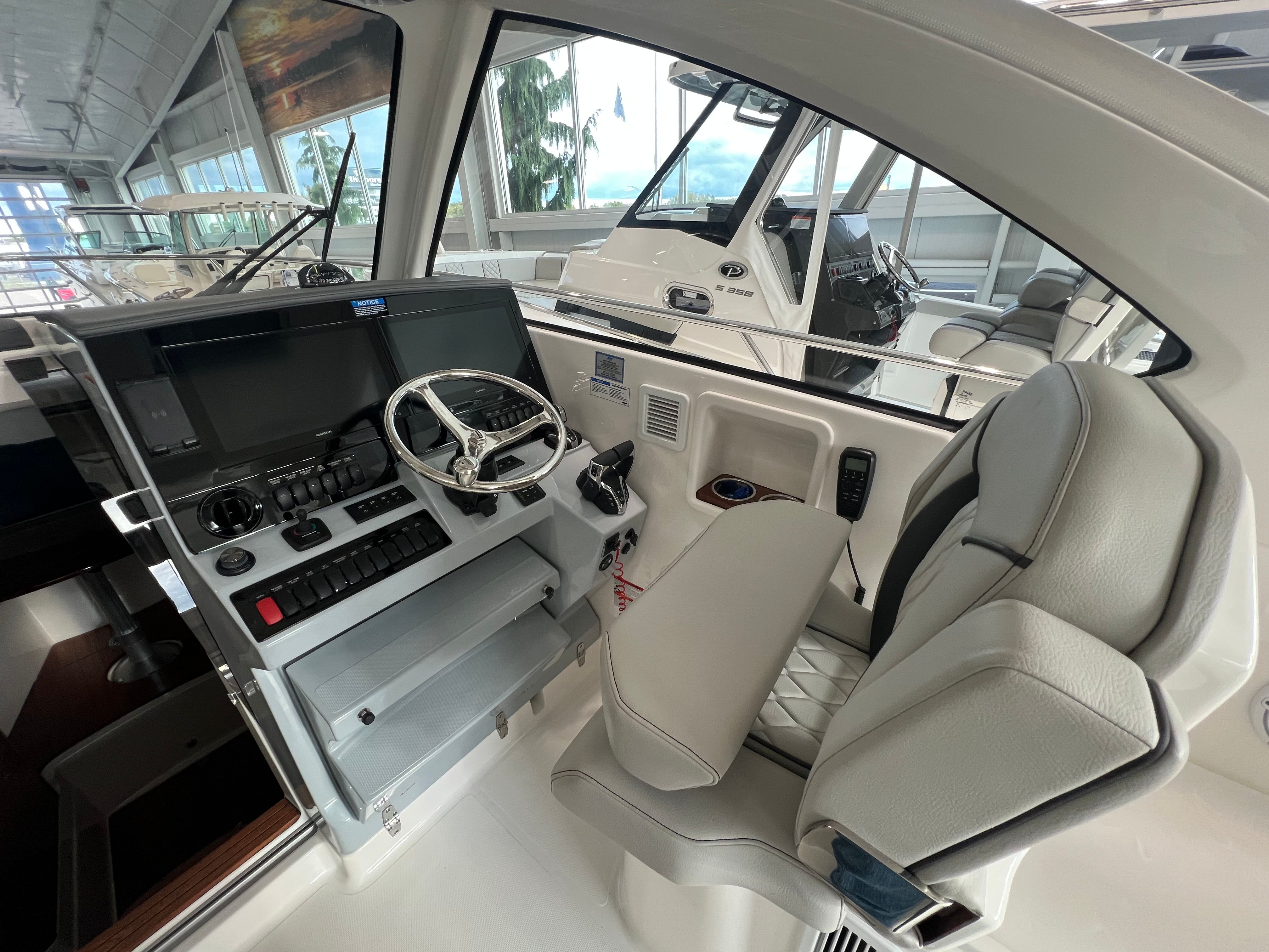 The Pursuit 325 OS is loaded with special features that enhance comfort, convenience, and enjoyment. The 3 Piece Drop Curtain Upgrade Stamoid (White) and Aft Curtain - Black provide versatile protection from the elements, allowing you to adapt to changing weather conditions with ease. The Bootsripe - Black adds a touch of elegance to the exterior, while the Bridgedeck Teak Table with Dedicated Storage and Fiberglass Cockpit Table with Dedicated Storage offer stylish and practical spaces for dining and socializing.For those who value cutting-edge technology, the Add GMS 10 Expander for Garmin OPTS ensures seamless integration with your navigation and electronics systems. The Custom Hardtop Integrated Electric Retractable Makefast Sunshade with One Touch Operation delivers effortless shade and comfort at the touch of a button, making it easy to enjoy sunny days without compromise. Both the cabin and cockpit are equipped with air conditioning and reverse cycle systems (10,000 BTU for the cabin and 12,000 BTU for the cockpit), ensuring a comfortable environment no matter the weather. The application of exterior protectant helps maintain the boat’s pristine appearance, safeguarding your investment for years to come.
