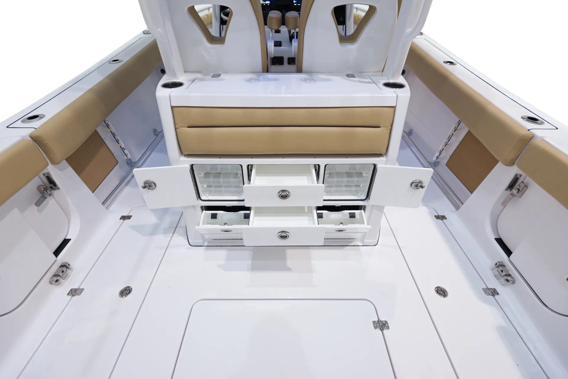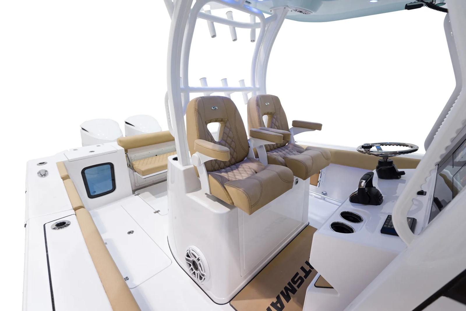 Powering the Sportsman 302 Open are two high-performance engines, delivering a combined 700 horsepower. This impressive setup ensures exhilarating acceleration, smooth cruising, and the ability to tackle a variety of water conditions with confidence. Whether you’re heading offshore for a day of fishing or cruising along the coast with friends, the dual-engine configuration offers reliability and the kind of responsive handling that seasoned boaters demand. The advanced steering system, featuring the Edson 13” SS Comfort Grip Steering Wheel with PowerKnob, provides precise control and effortless maneuverability, making every journey enjoyable and stress-free.