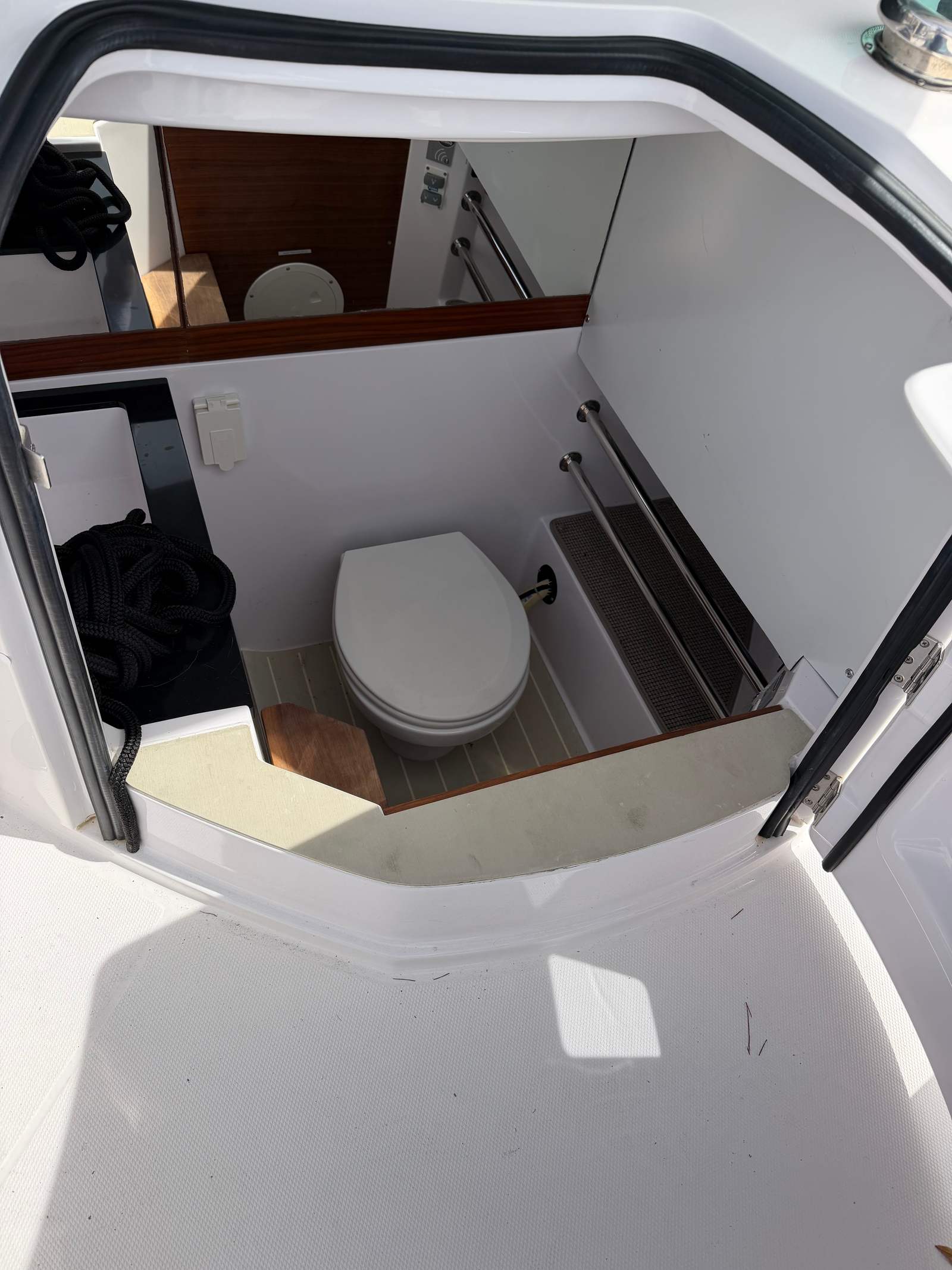 The enclosed pilothouse comfortably seats up to five people, offering protection from the elements while still giving you the open-air experience with its large sliding canvas roof and side-opening doors.