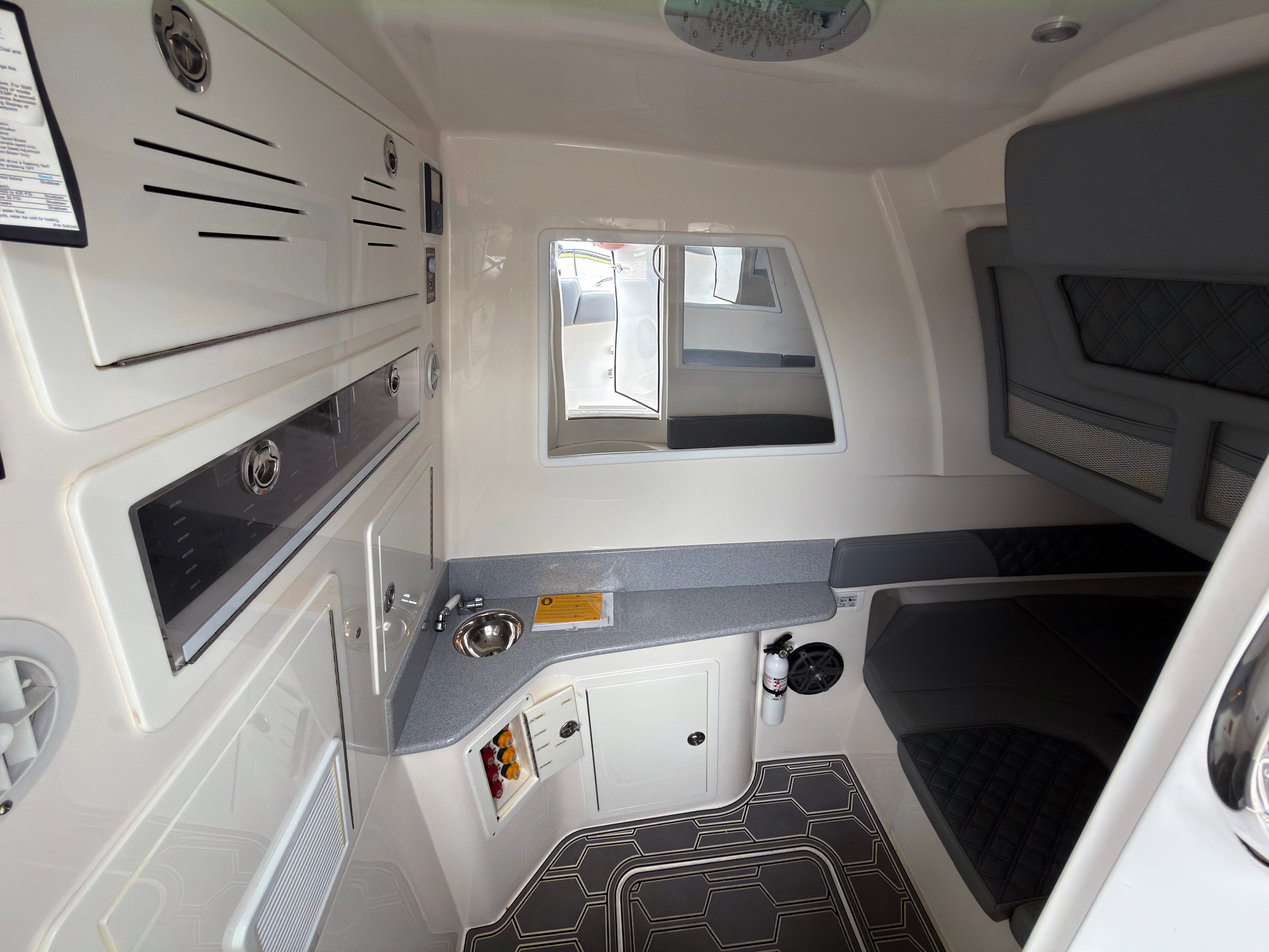 At the helm, the boat presents exactly as a premium offshore machine should, with a clean dash layout, large Garmin displays, Mercury controls, and excellent visibility. The forward seating area adds comfort for guests, and the interior cabin space offers a practical retreat with berth seating, cabinetry, countertop space, and the amenities expected in a boat of this caliber.