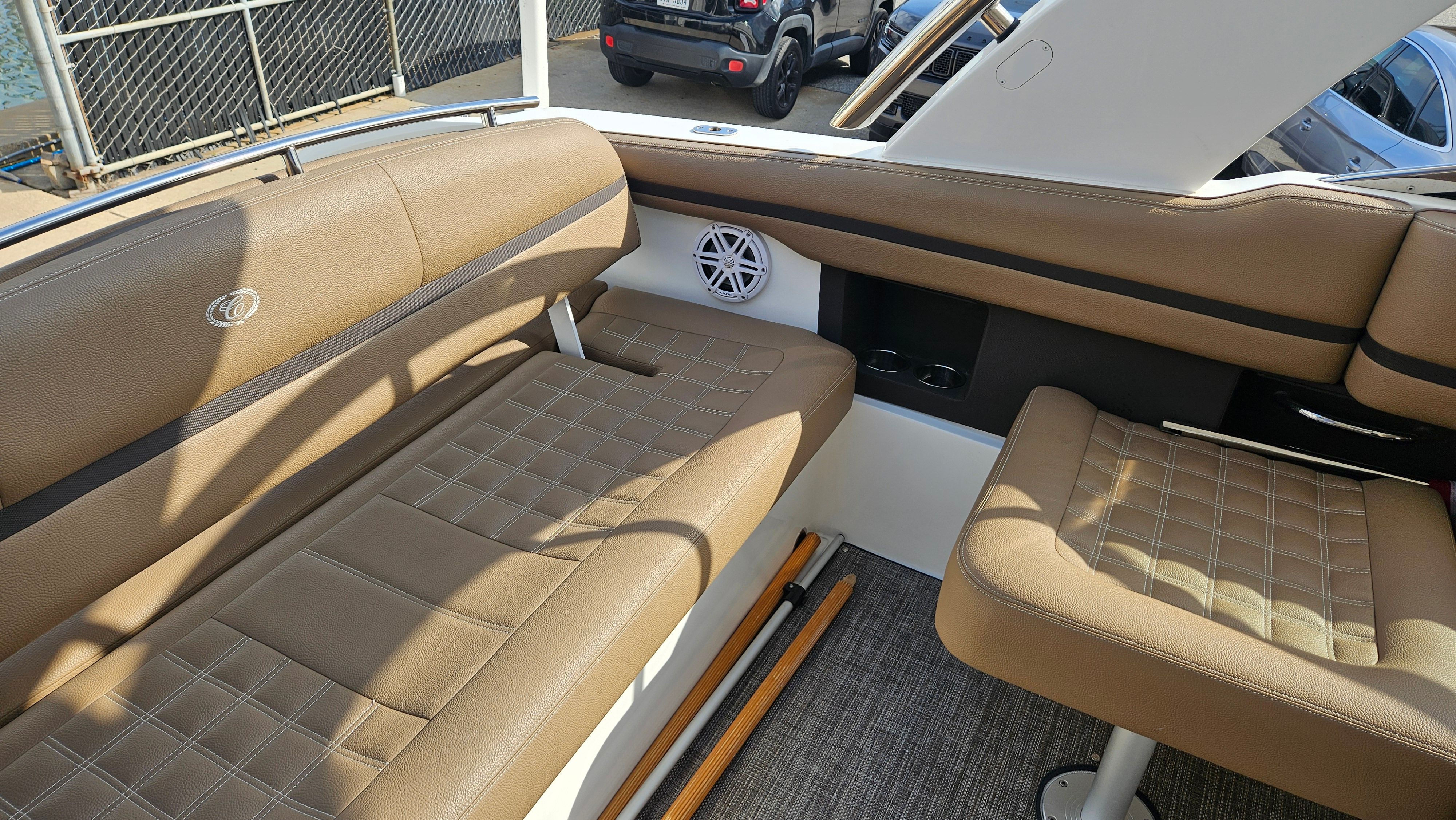This Bowrider boat for sale is packed with premium features designed to enhance your boating experience. The hard top offers protection from the sun and elements, allowing you to enjoy your time on the water in comfort regardless of the weather. The windlass anchor system makes anchoring effortless, so you can quickly secure your boat and start enjoying your favorite spot. The aluminum triple axle trailer ensures easy transport and storage, giving you the flexibility to explore new waterways or conveniently store your boat when not in use. Snap-in carpet adds a touch of luxury and comfort underfoot, while JL Audio provides high-quality sound for your favorite tunes, creating the perfect atmosphere for any outing.