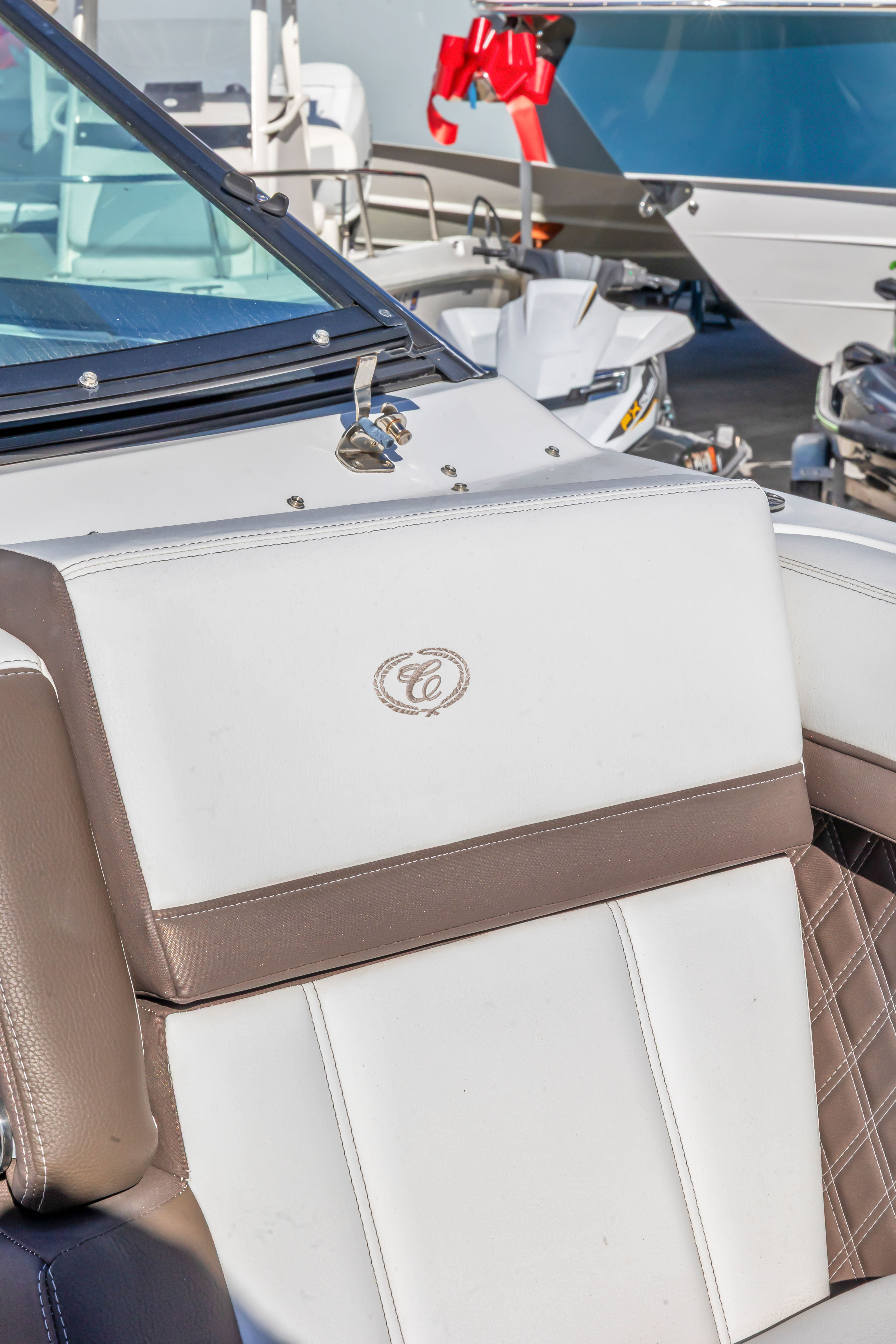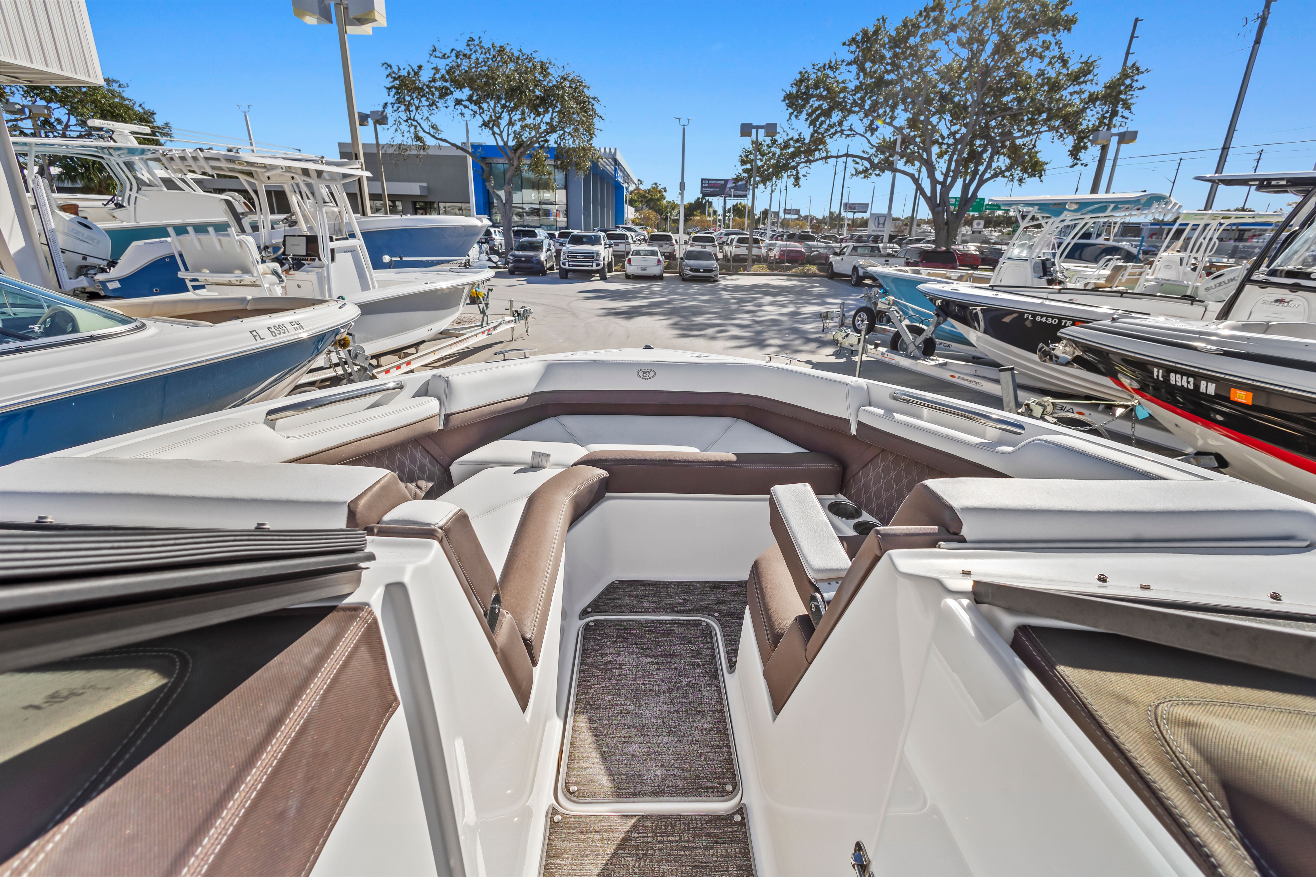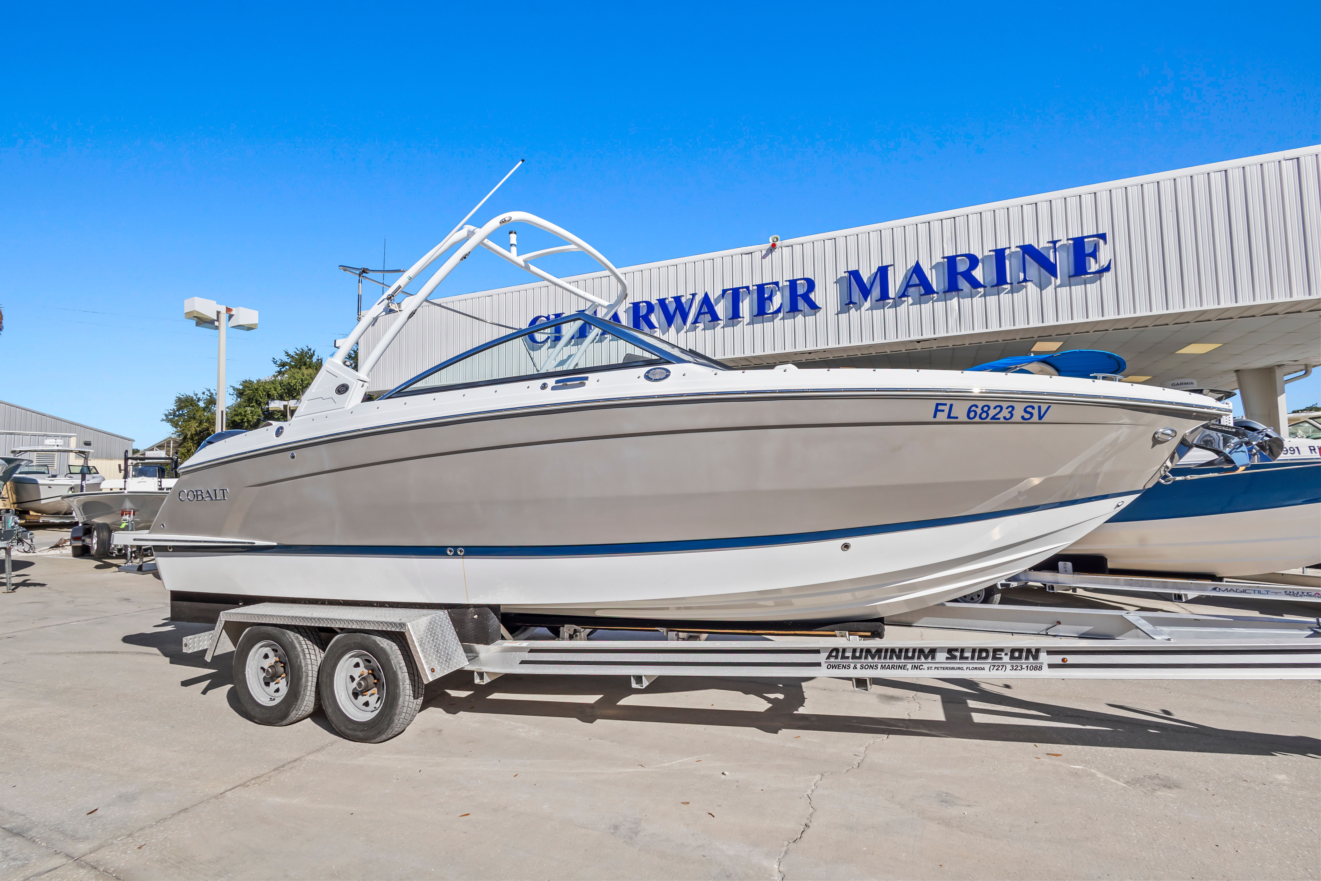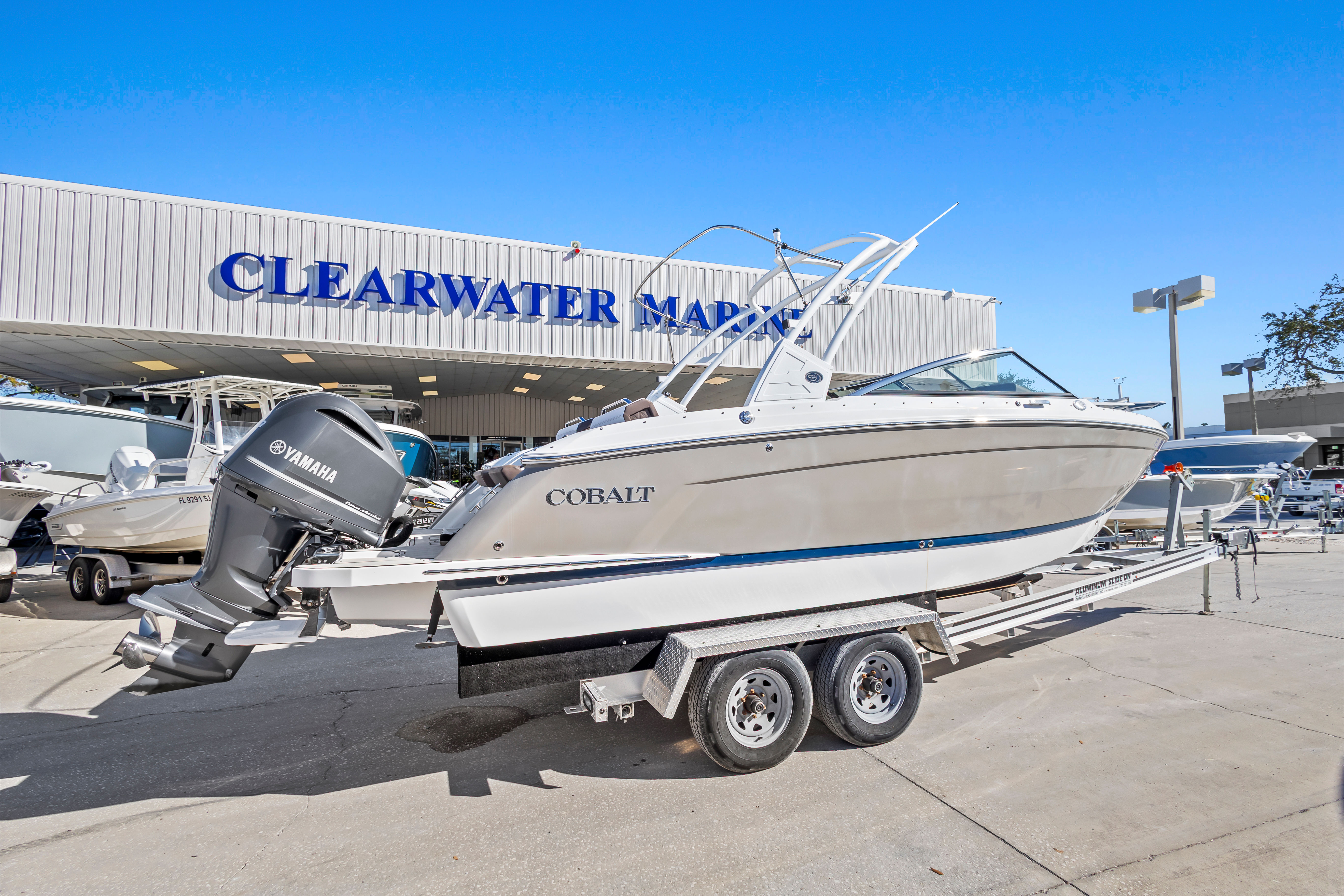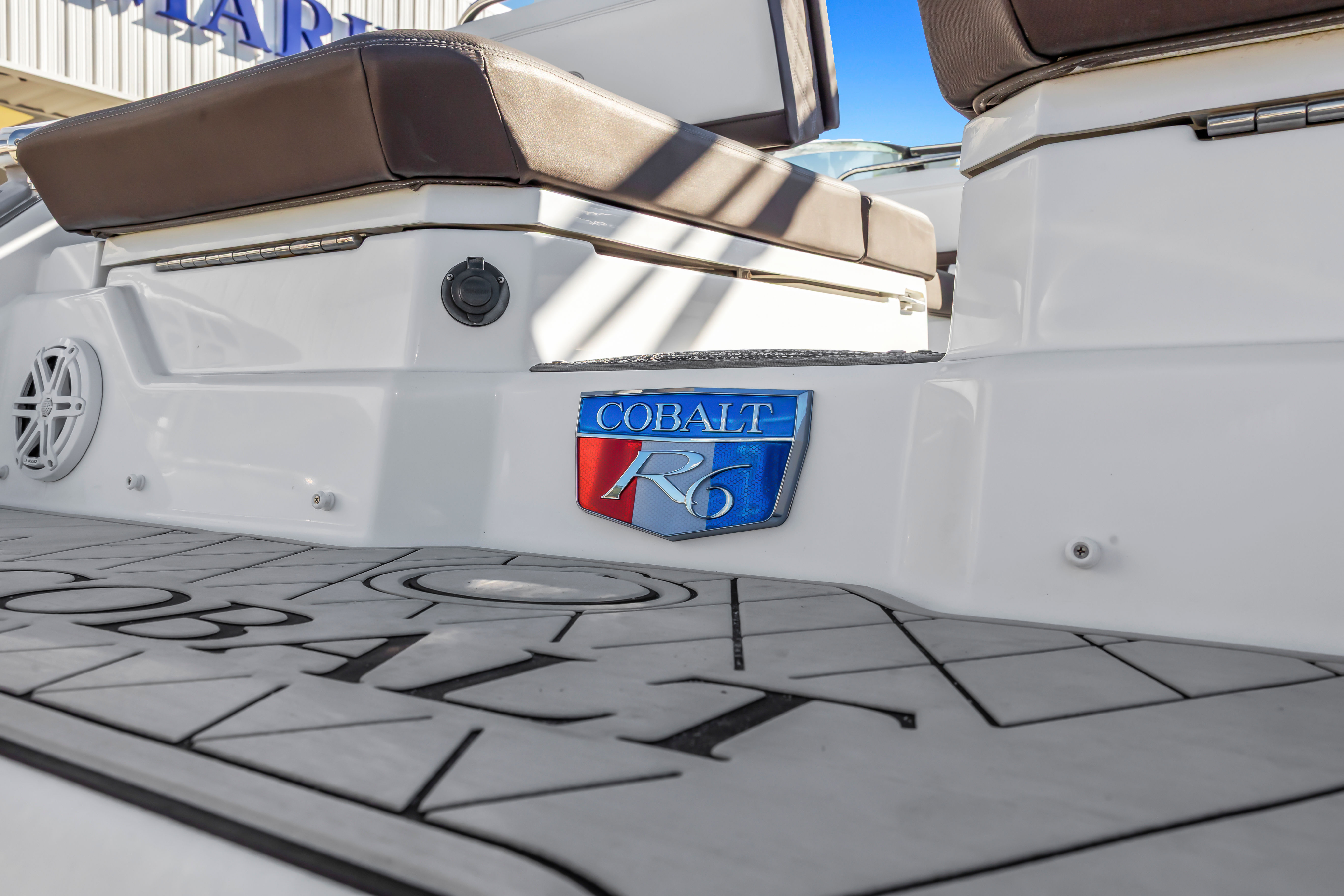 Well-equipped for entertaining and cruising, this boat features dual in-dash Garmin multifunction displays, JL Audio sound system, electric windlass anchor, trim tabs, and an aluminum arch with integrated Bimini top for added comfort and shade. Cobalt’s signature interior layout includes plush wraparound seating, a convertible aft sunpad, and a spacious, enclosed head compartment, all finished with top-tier materials and stitching.