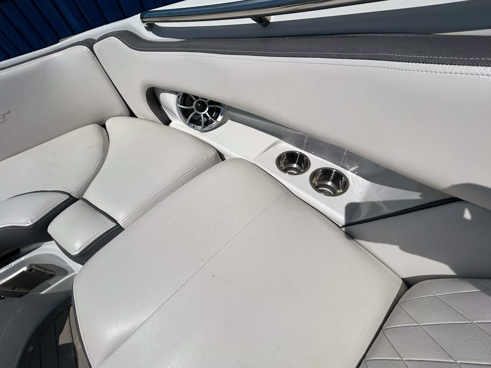 At the helm, the boat features a clean, modern dash with Garmin electronics, Mercury controls, and an intuitive layout that keeps everything within easy reach. The seating throughout shows Crownline’s upscale approach, with attractive upholstery, supportive bolsters, and a polished overall presentation.
