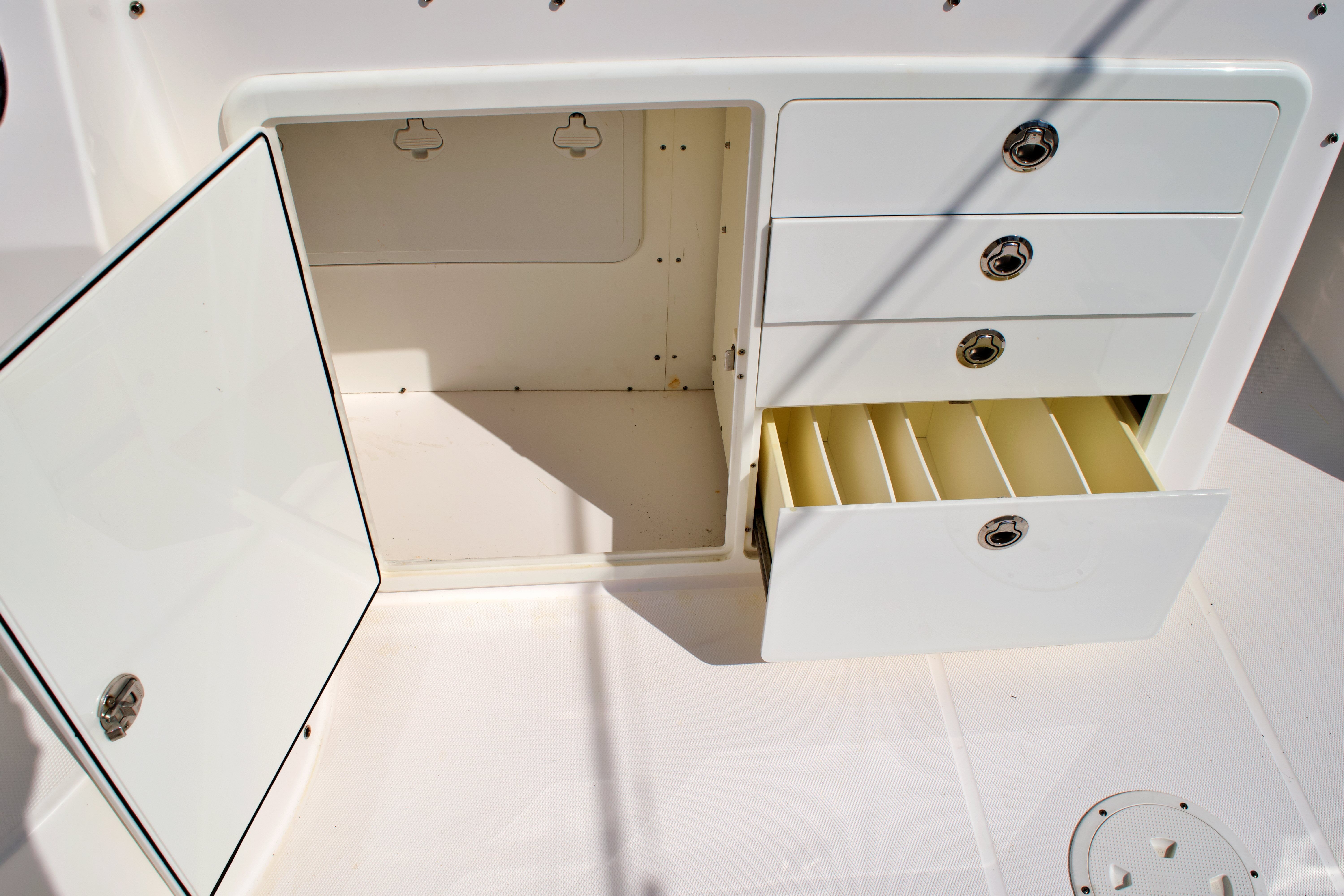 The Everglades 320 EX is loaded with features that enhance both its fishing capabilities and onboard comfort. As an offshore boat for sale, it’s designed to meet the needs of serious anglers while also catering to those who appreciate luxury and convenience. The spacious cockpit provides plenty of room for casting lines and reeling in the catch of the day, while the well-designed helm offers excellent visibility and intuitive controls for stress-free navigation. The 32-foot length ensures generous deck space, making it easy to move around and enjoy all the amenities this Everglades boat for sale has to offer.