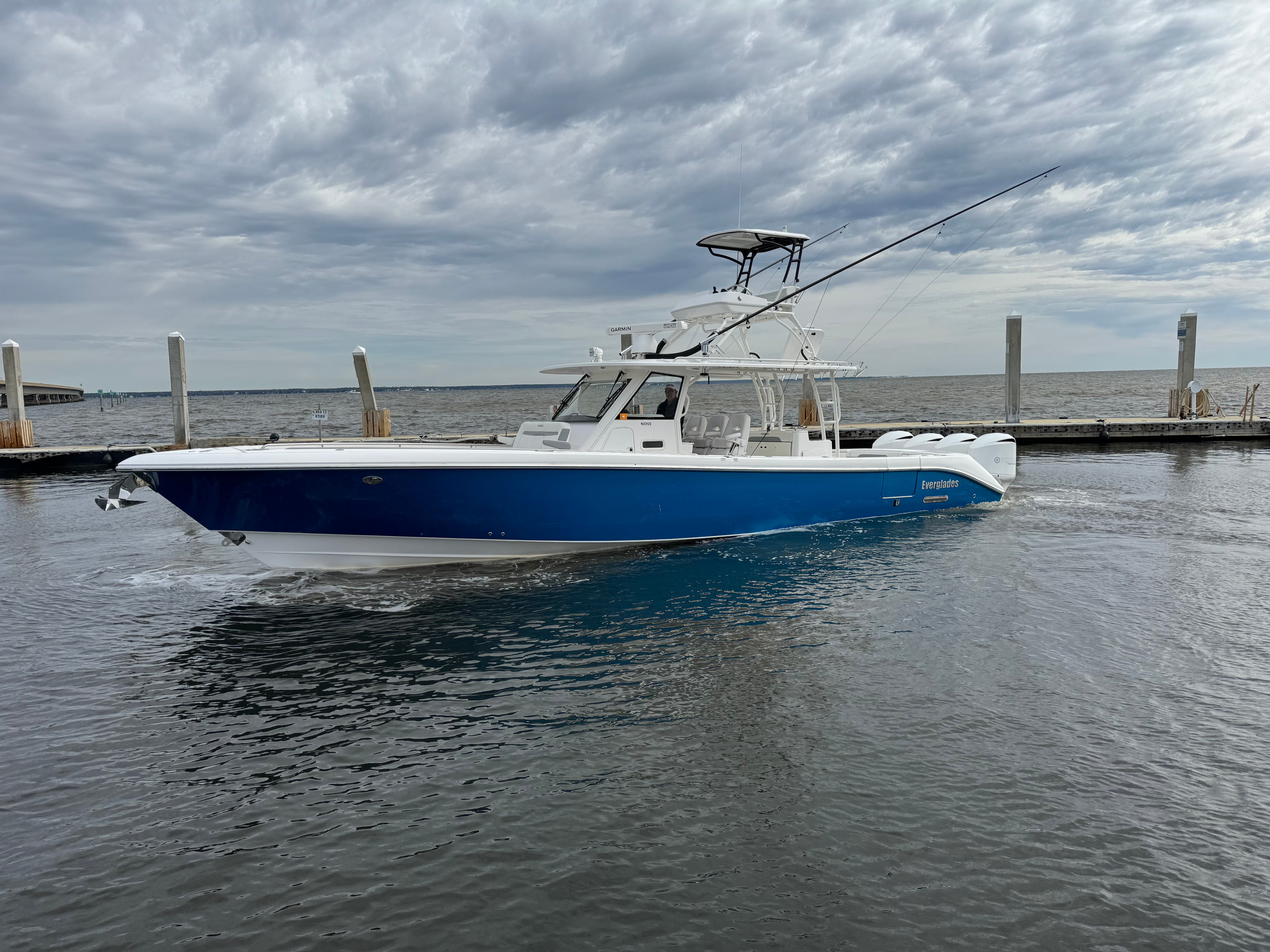 Inside dry stored and it shows!!!! Immaculate! Brand new triple Garmin 8616's just installed 03/26! Beautiful 435CC painted in Caribbean Blue Metallic custom from Everglades, no fading! Custom painted white quad Yamaha F350's with only 700hrs and all service records and updates, she is a beast! " Kingdom Business II " is one of a very few 435's in this year range that have joystick and setpoint, most will not have setpoint. This beauty comes with a full upper station equipped will full controls including joystick and a Garmin display. She has been kept in the high and dry her entire life and briefly on a lift, NO bottom paint. She is fish ready as we speak and priced to sell immediately, you will not be disappointed! Full list of options include: