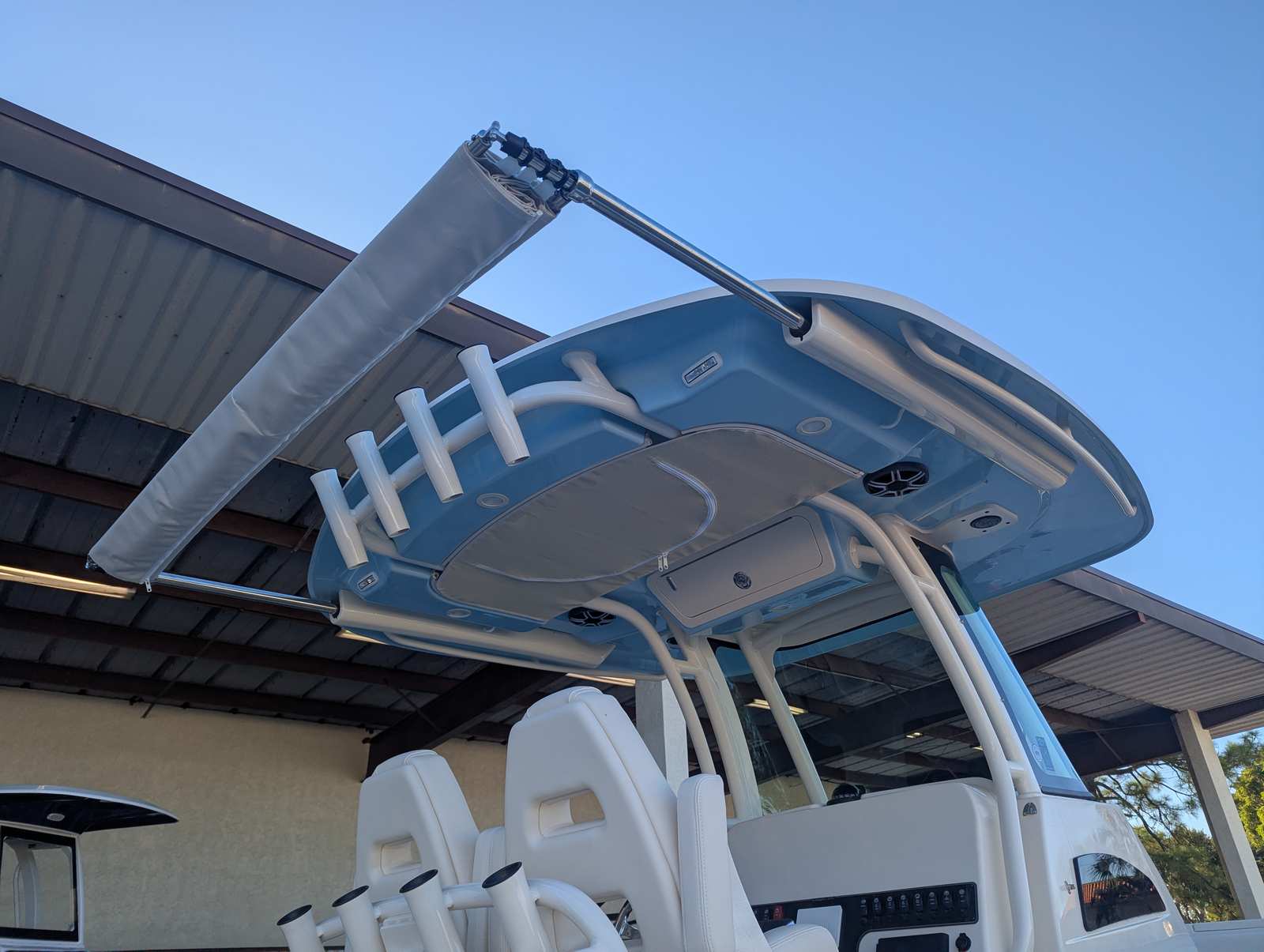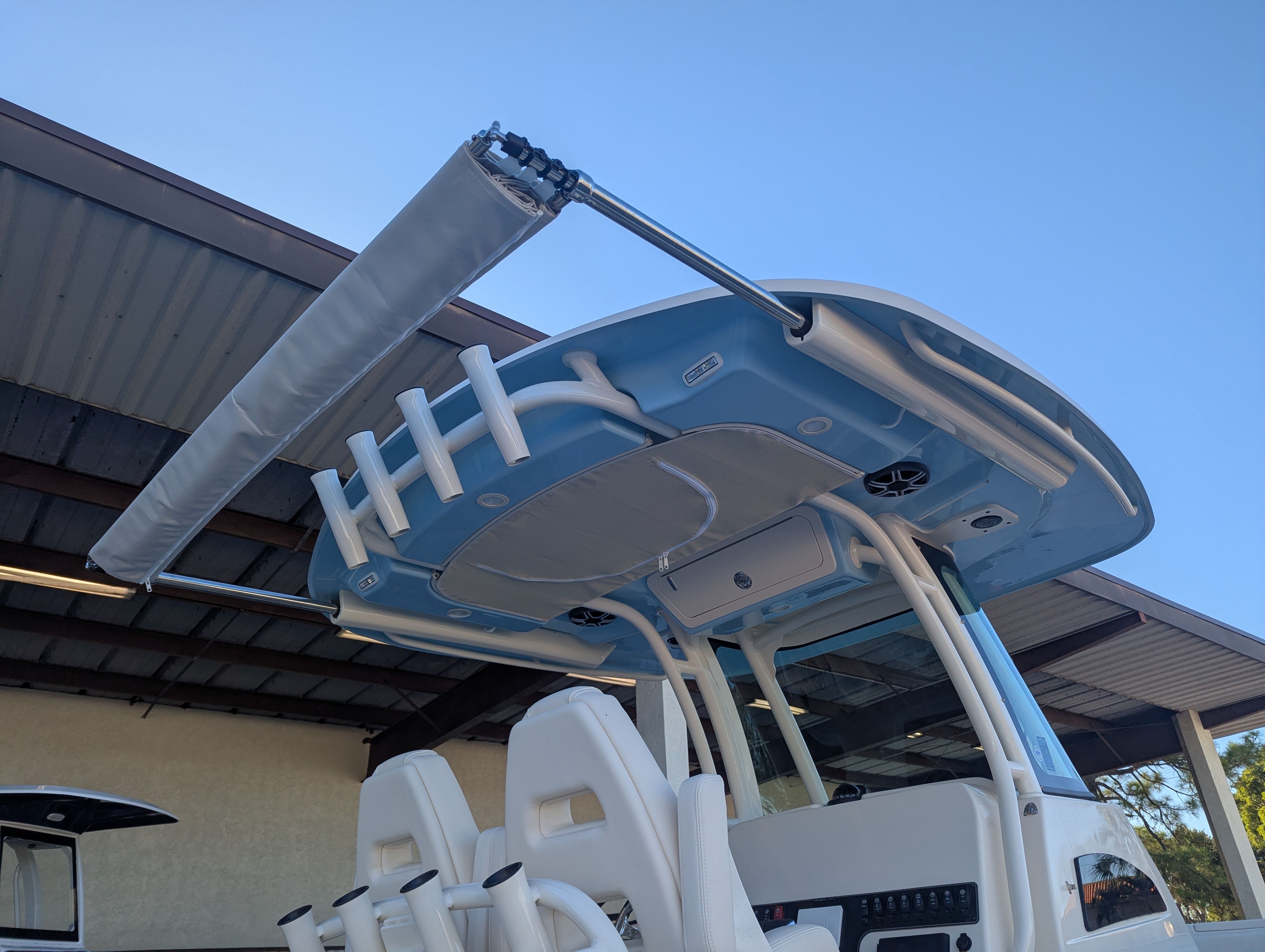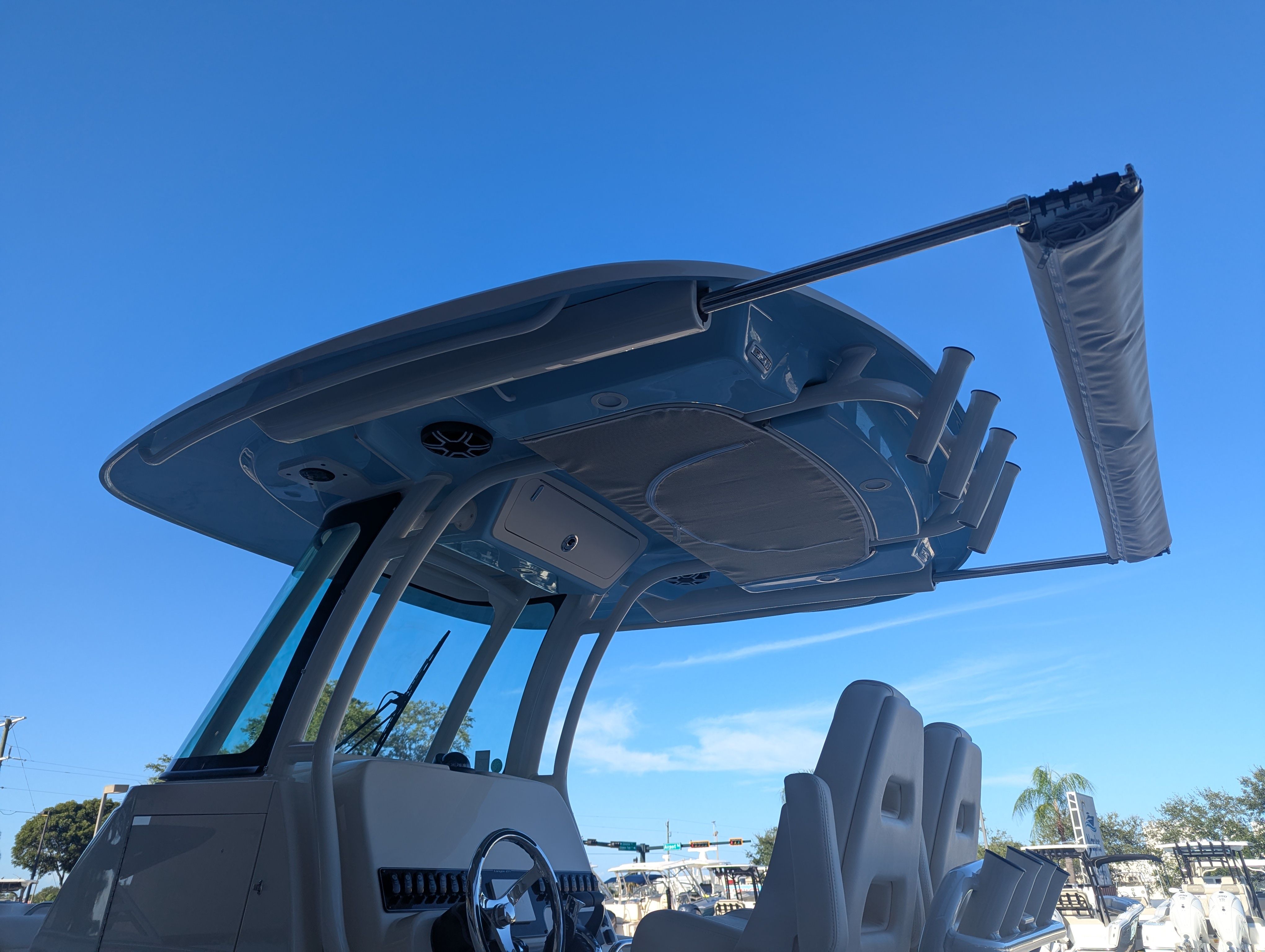 The 2026 Grady-White Canyon 271 is packed with special features designed to enhance your boating experience. The cockpit step provides easy access to the deck, ensuring safety and convenience for all passengers. The casting platform insert with cushion transforms the bow into a comfortable space for fishing or lounging, while the under water lights add a touch of elegance and visibility for evening cruises. The Sure Shade top offers protection from the sun, allowing you to enjoy longer days on the water in comfort. Ivory T-Top wing curtains provide additional shelter from wind and spray, making every outing more enjoyable. The whole hull gel color and underside gel coat in Celestial Blue not only create a striking visual impression but also reflect Grady-White’s commitment to quality and style.