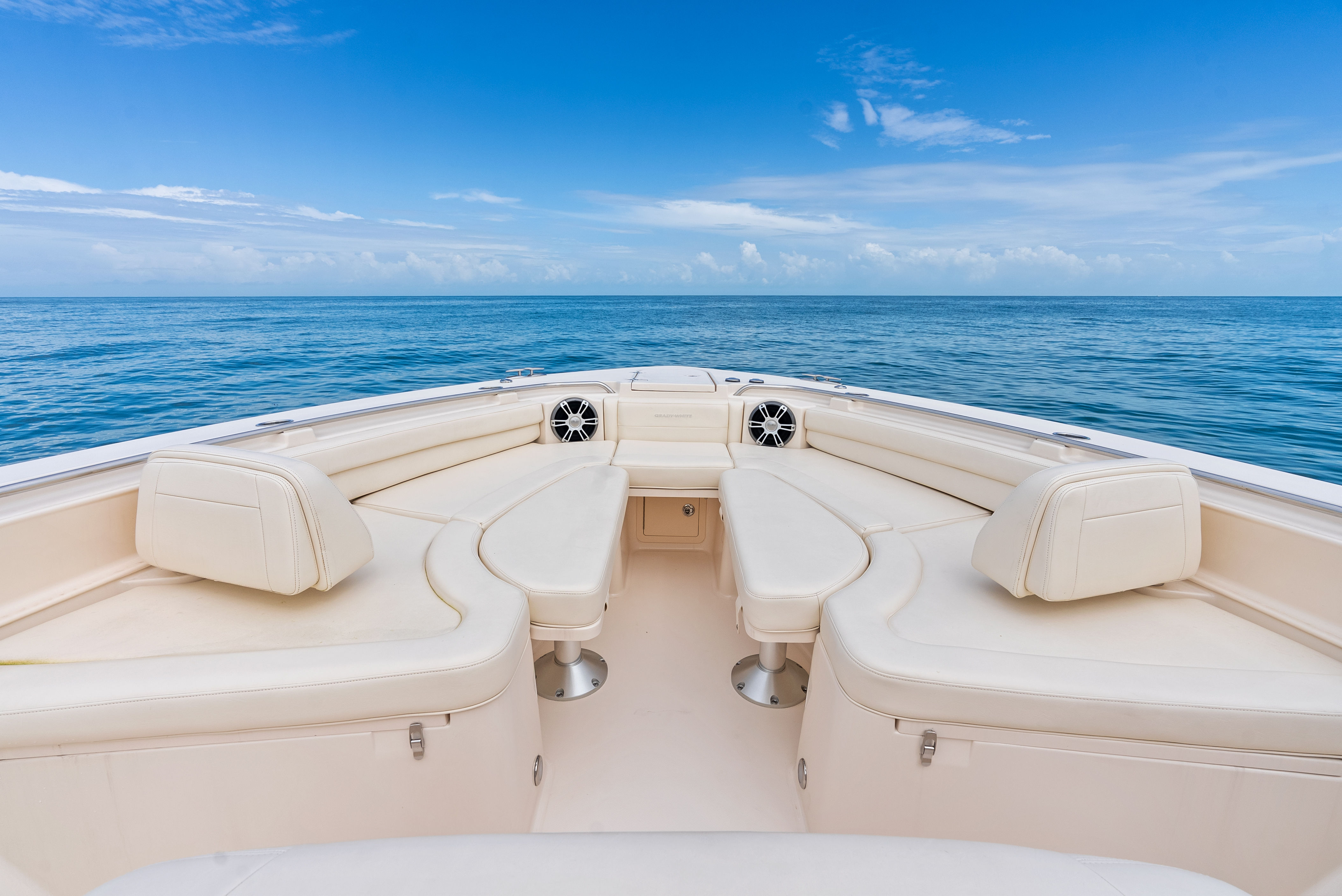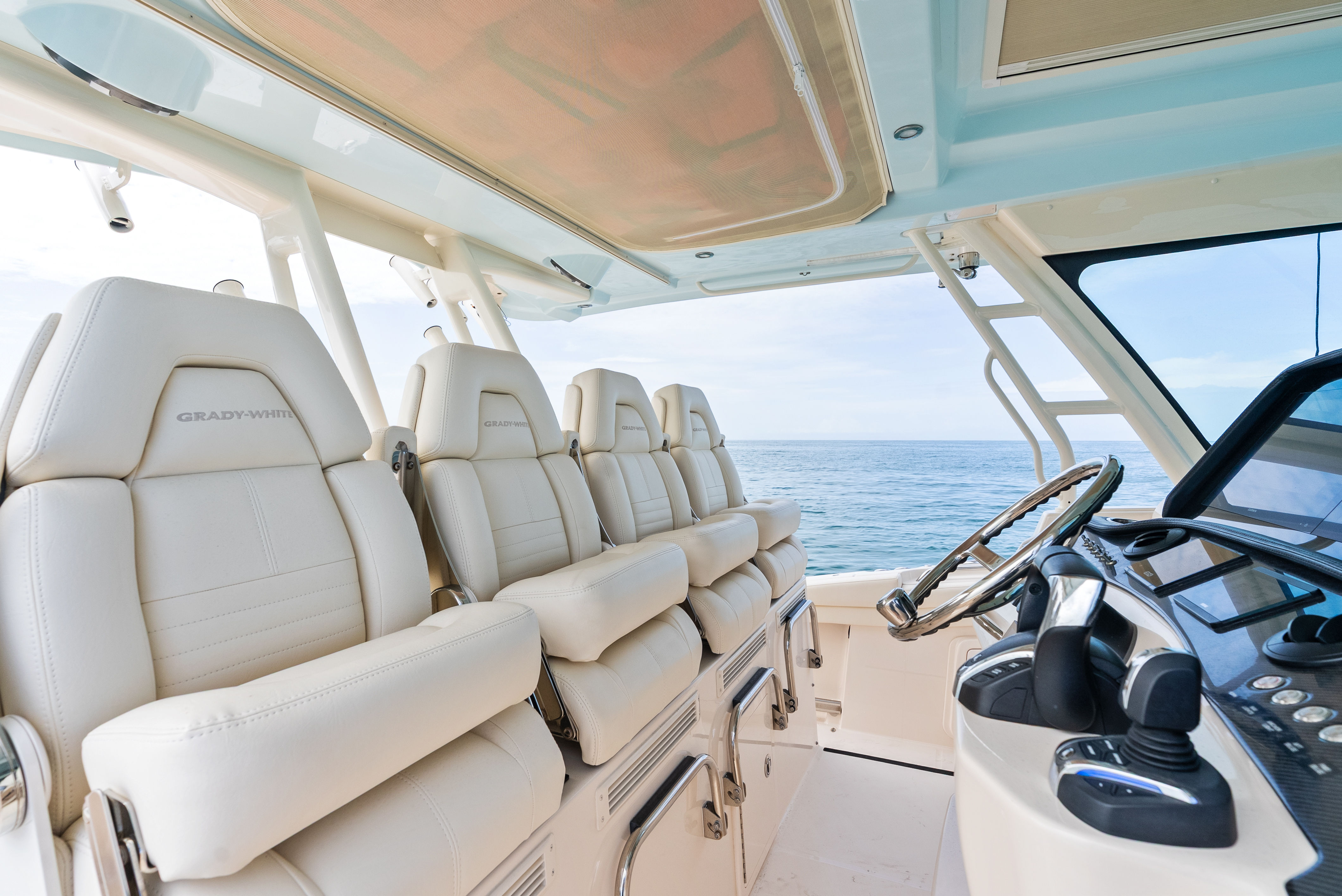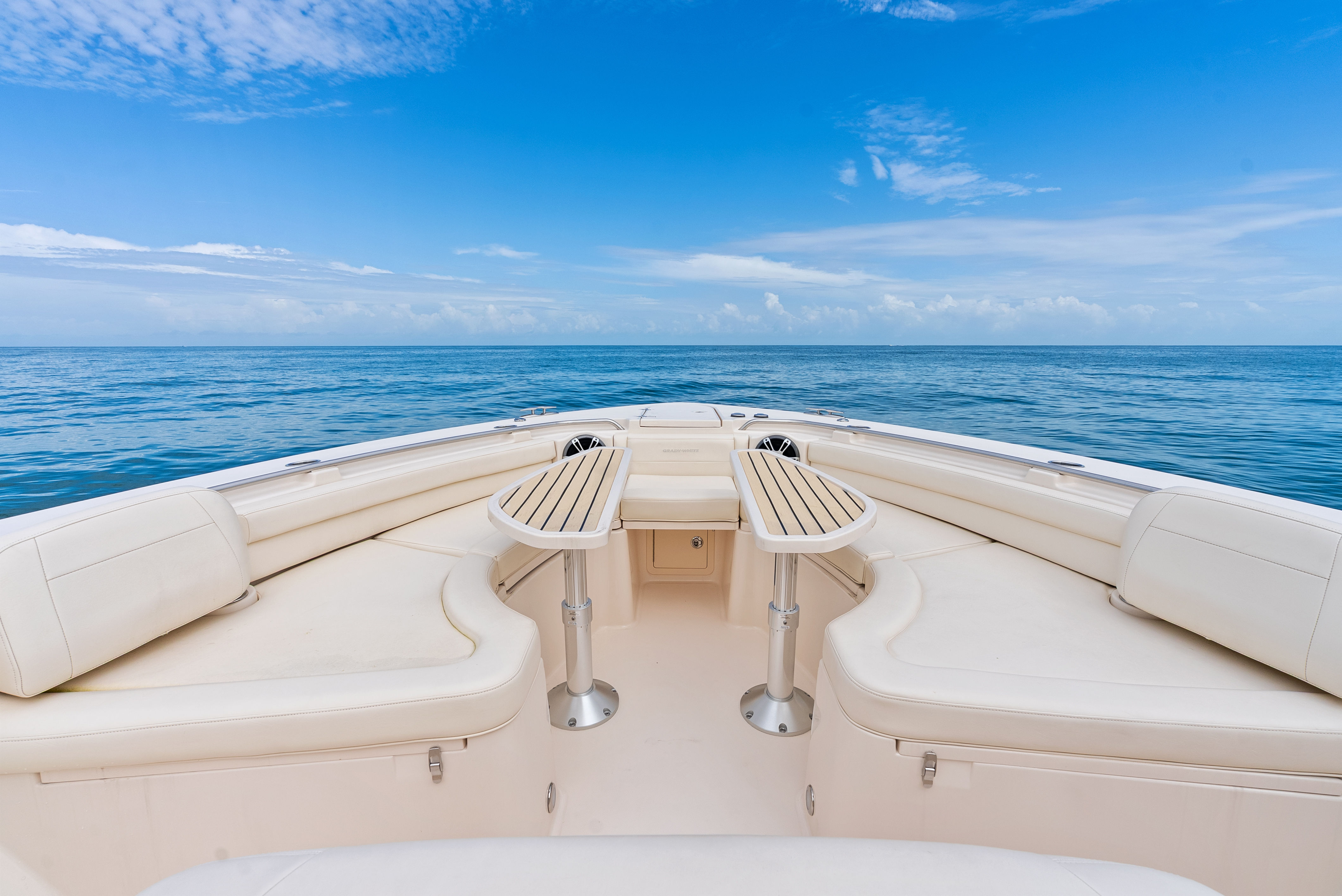 Topside, enjoy dual-zone air conditioning, premium seating with fold-away aft bench, an electric bow table, and an integrated retractable cockpit shade for ultimate comfort while entertaining or relaxing.