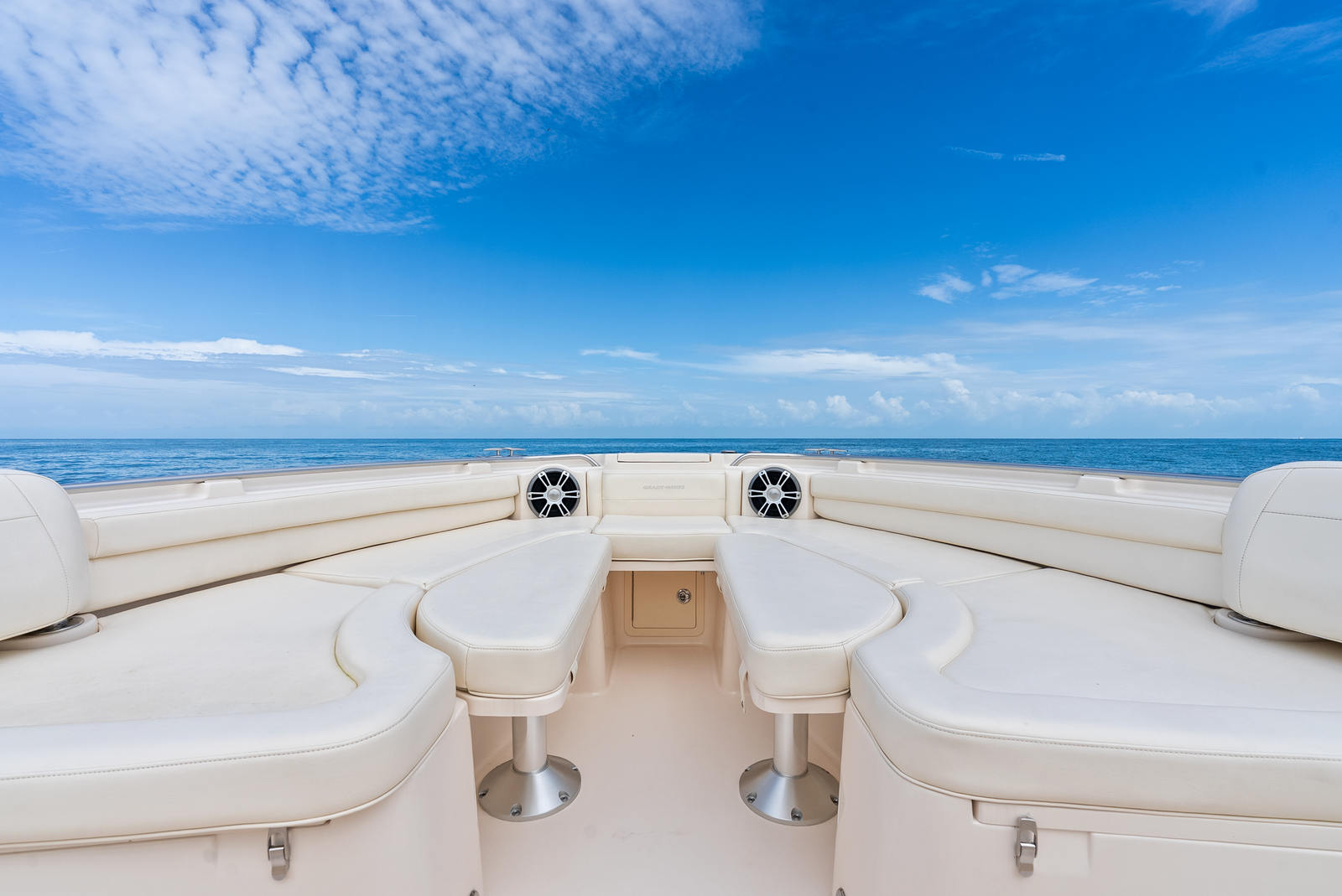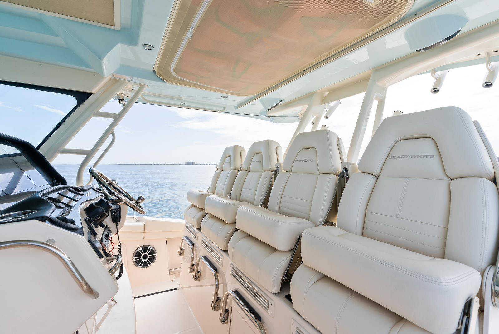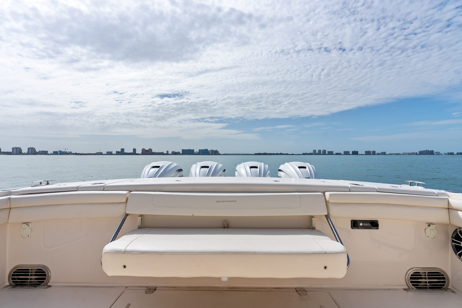 Topside, enjoy dual-zone air conditioning, premium seating with fold-away aft bench, an electric bow table, and an integrated retractable cockpit shade for ultimate comfort while entertaining or relaxing.
