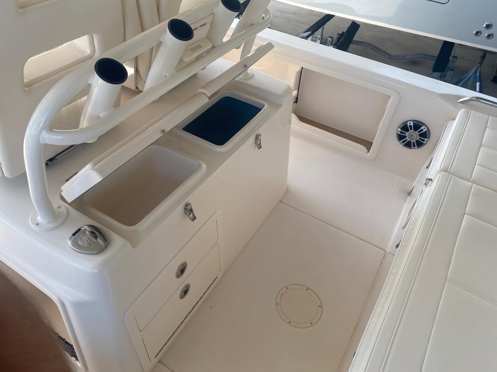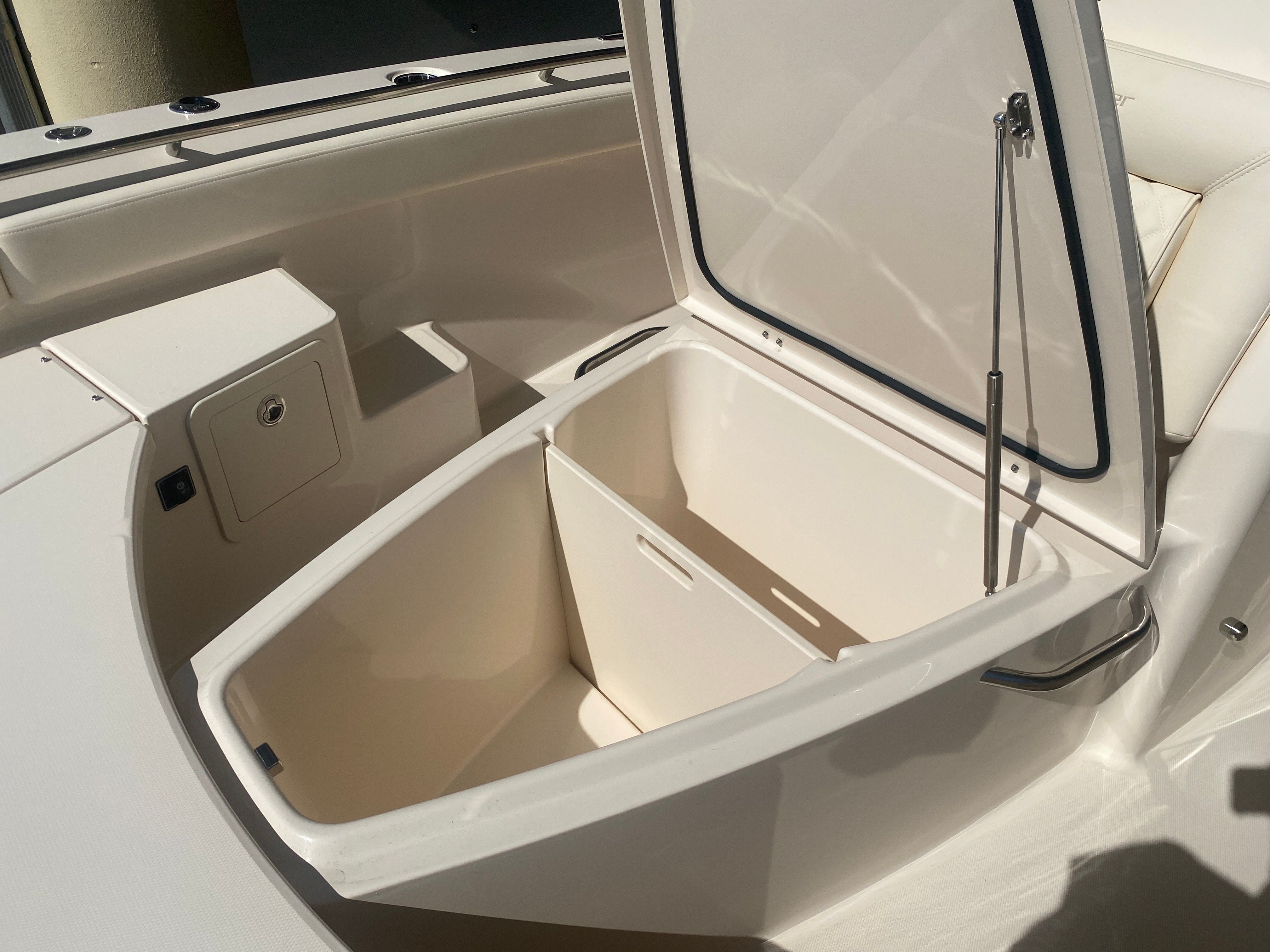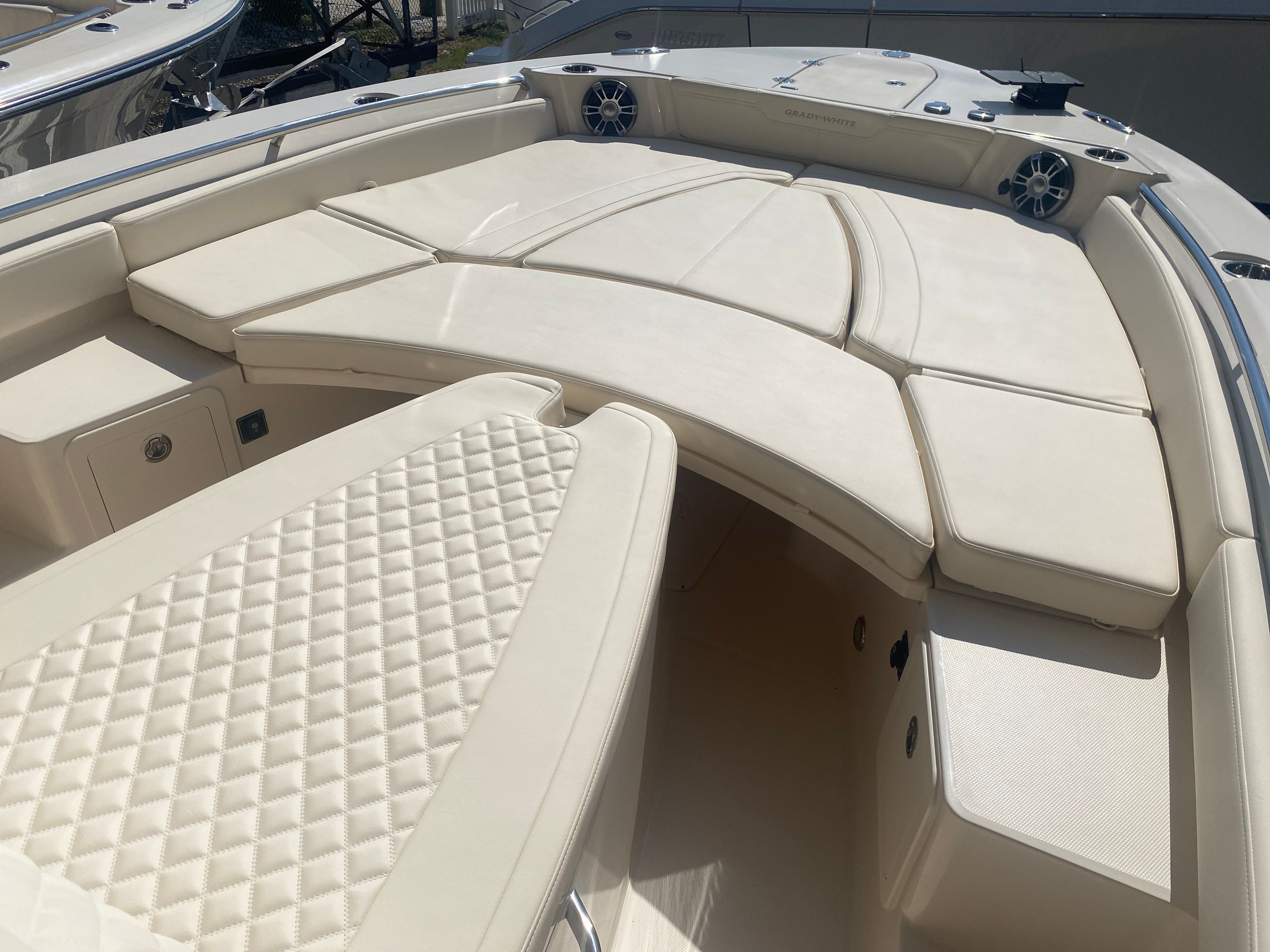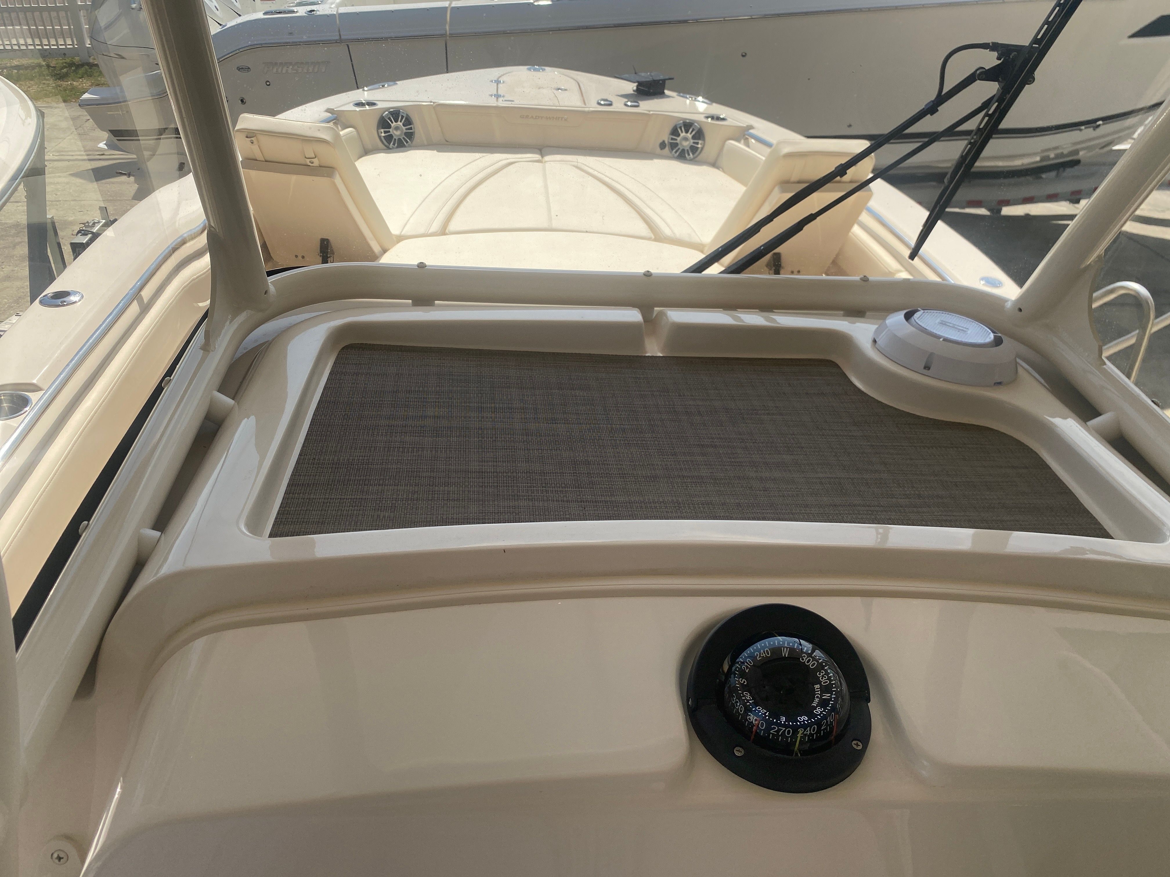 Underwater lights add a touch of elegance and visibility, enhancing your nighttime adventures on the water. The delete engine bolt sealer ensures a smooth and streamlined hull, reducing drag and improving overall performance. The Power PTX Sure Shade Top Oyster provides reliable shade from the sun, keeping you cool and comfortable during those long days on the water. Additionally, the Jit Top Underside Coastal Fog complements the boat's stunning exterior while offering protection from the elements.