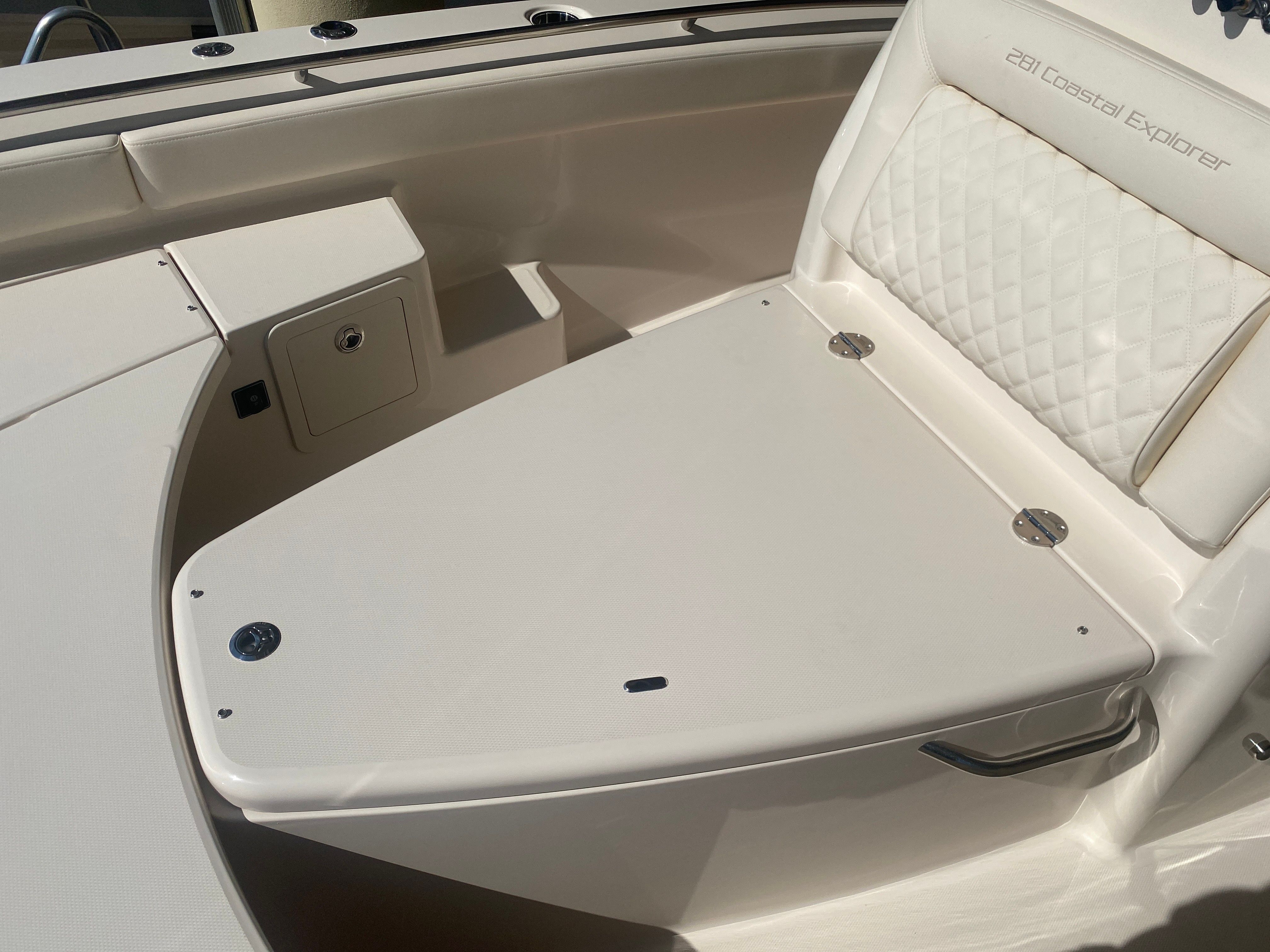 This center console boat for sale is packed with an array of special features that enhance both functionality and comfort. The bow fiberglass table provides a sturdy and versatile surface for dining, fishing, or simply enjoying the view. The casting platform extension with cushion offers additional space for casting lines or lounging, ensuring that you and your guests can relax in style. Equipped with a trolling motor prep package, the Coastal Explorer 281 is ready for precise and efficient fishing, making it an ideal choice for avid anglers.