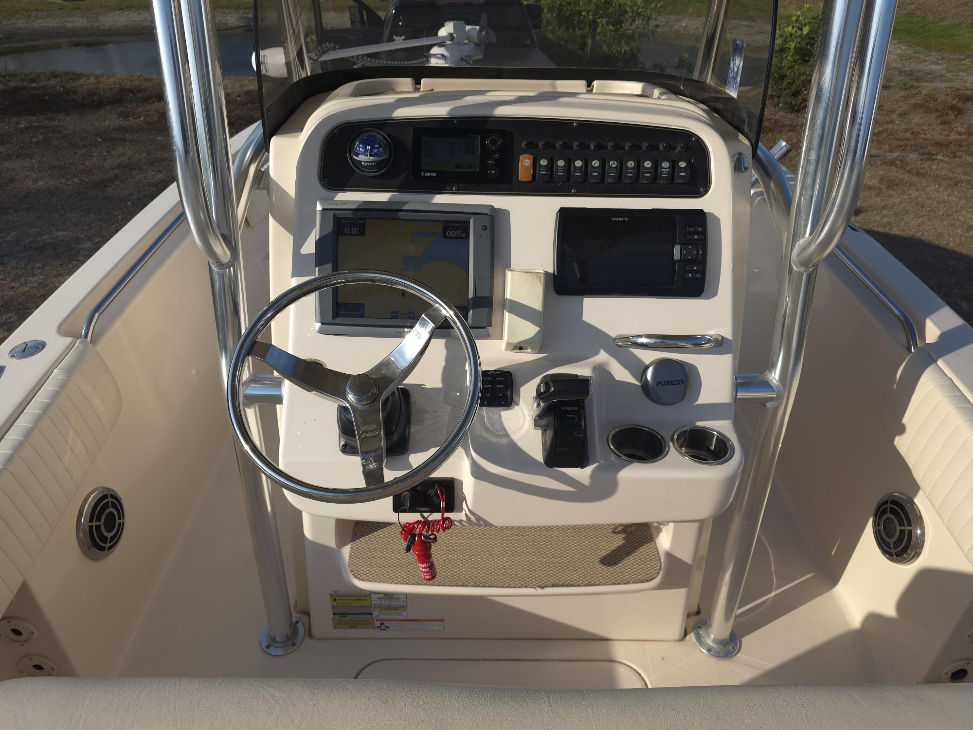 Forward of the console, with removable seat cushions, is a fully integrated 72-quart cooler that can be upgraded to a superinsulated cooler for heavy-duty cold storage. The console on the 230 features a stand-up head compartment with a vinyl liner, as opposed to cloth, so cleaning and maintenance is much easier. The console also houses the batteries, where they stay dry and out of the bilge for better access and longer life. The helm area of the 230 console is well laid out and has plenty of room for flush-mount electronics, with the gauge and switch panel above, more at eye level, so you do not have to look down to monitor engine functions. A side-mounted helm sits to port, with the binnacle on the centerline and dual drink holders to starboard.