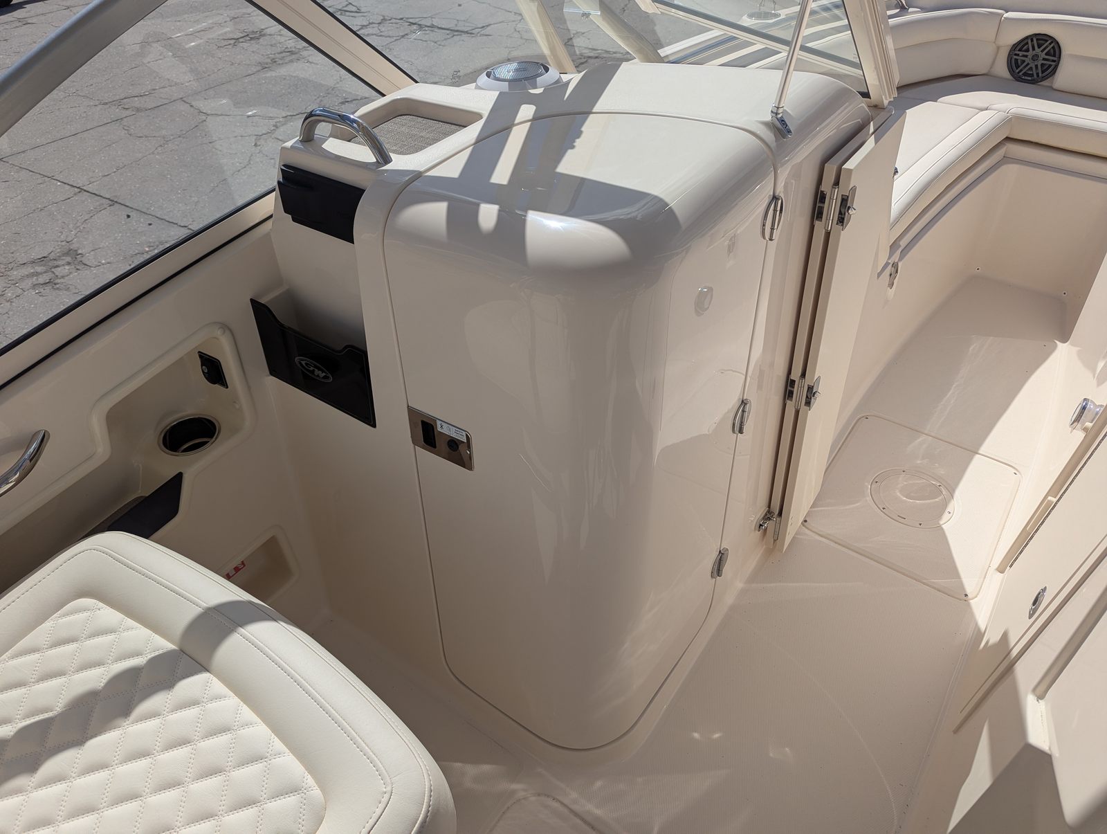 The Freedom 235 is loaded with special features that enhance both functionality and enjoyment. The Gel Coat in Coastal Fog Blue not only adds a touch of elegance but also provides durability and protection against the elements. The cockpit step makes boarding and moving around the boat effortless, while the ship style line loose—available as a special request—adds a custom touch to the vessel’s design.For anchoring convenience, the anchor windlass with bow roller allows for smooth and easy deployment and retrieval, making it simple to secure your spot in any cove or harbor. The ivory hard top front offers shade and protection from the sun, ensuring comfort during long days on the water. The deluxe companion seat with electric lounge provides a luxurious seating option, allowing passengers to relax in style. The marine head with electric flush and hold adds a level of convenience and comfort for extended outings, and the jit top underside in Coastal Fog creates a cohesive and stylish look throughout the boat.