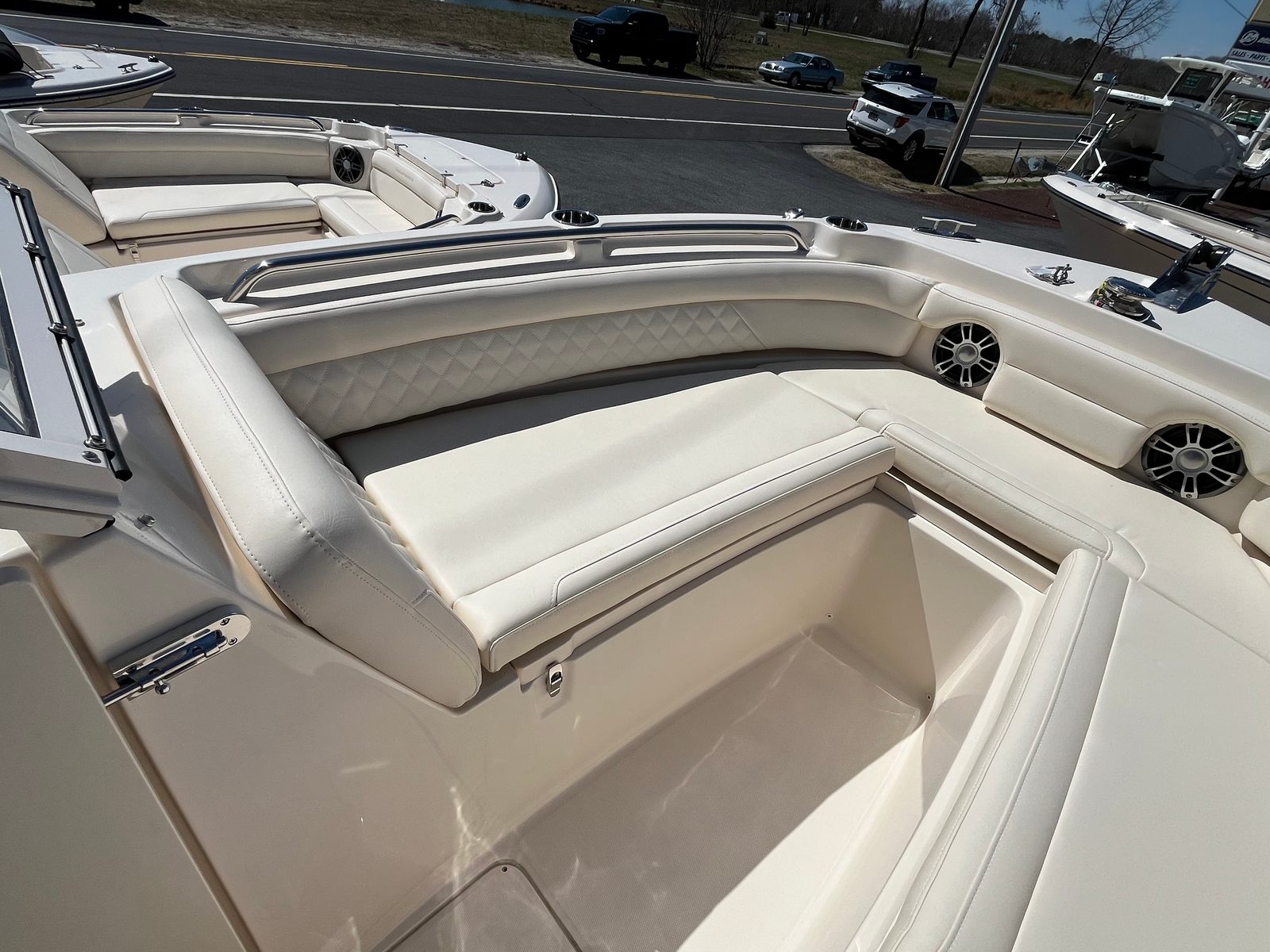 Ivory Aft Tonneau Cover – Protects cockpit seating and helm area when not in use.