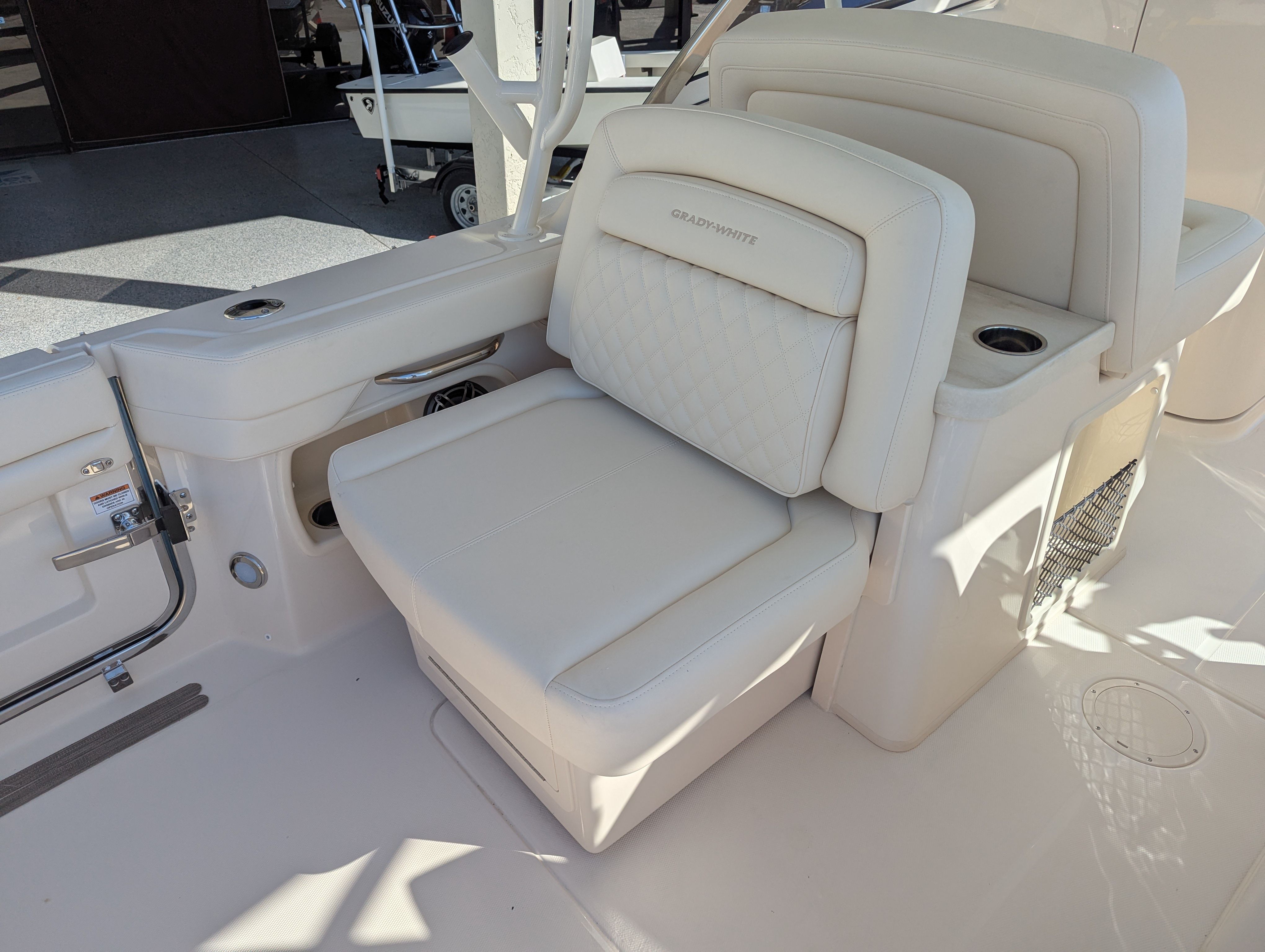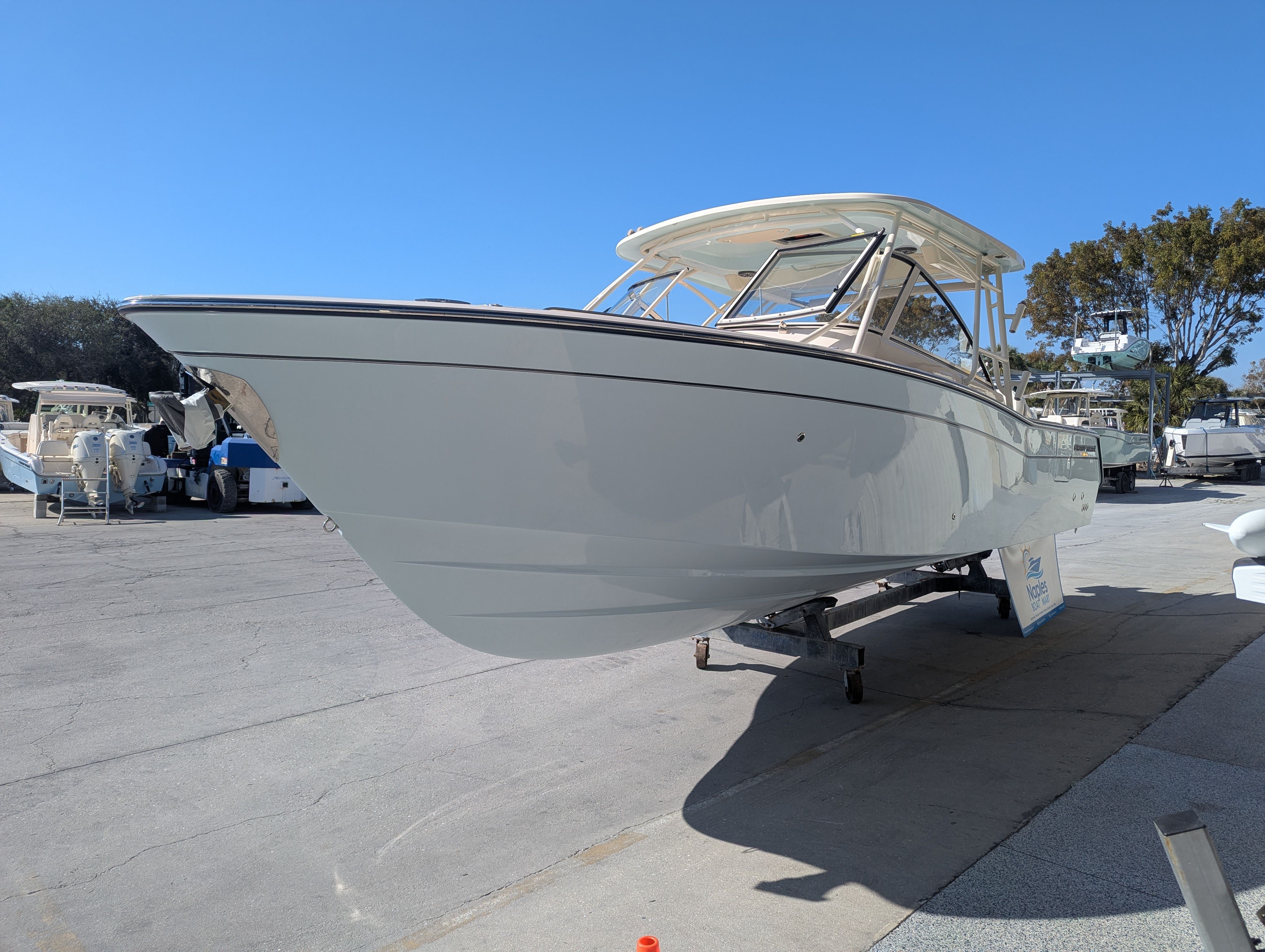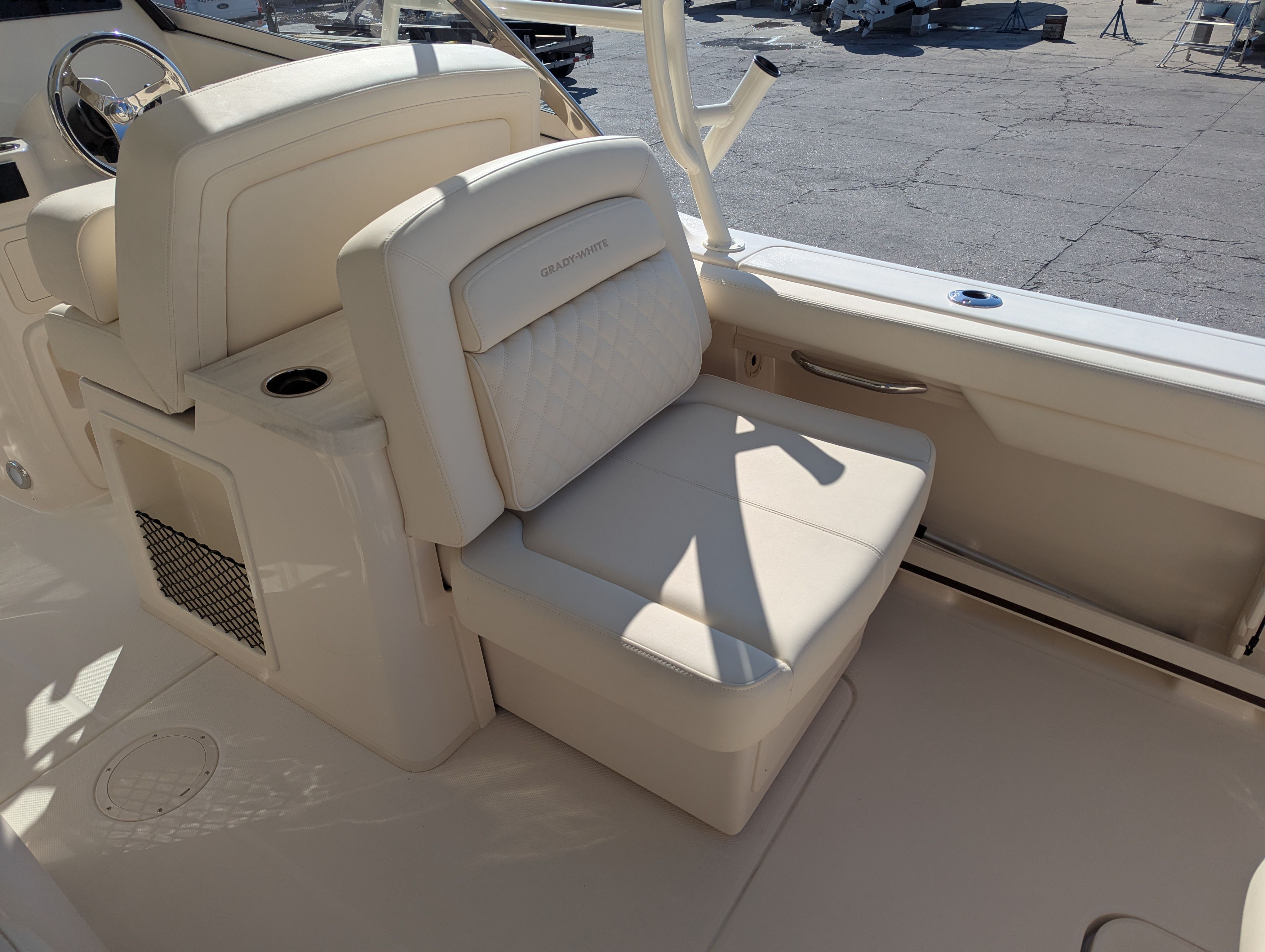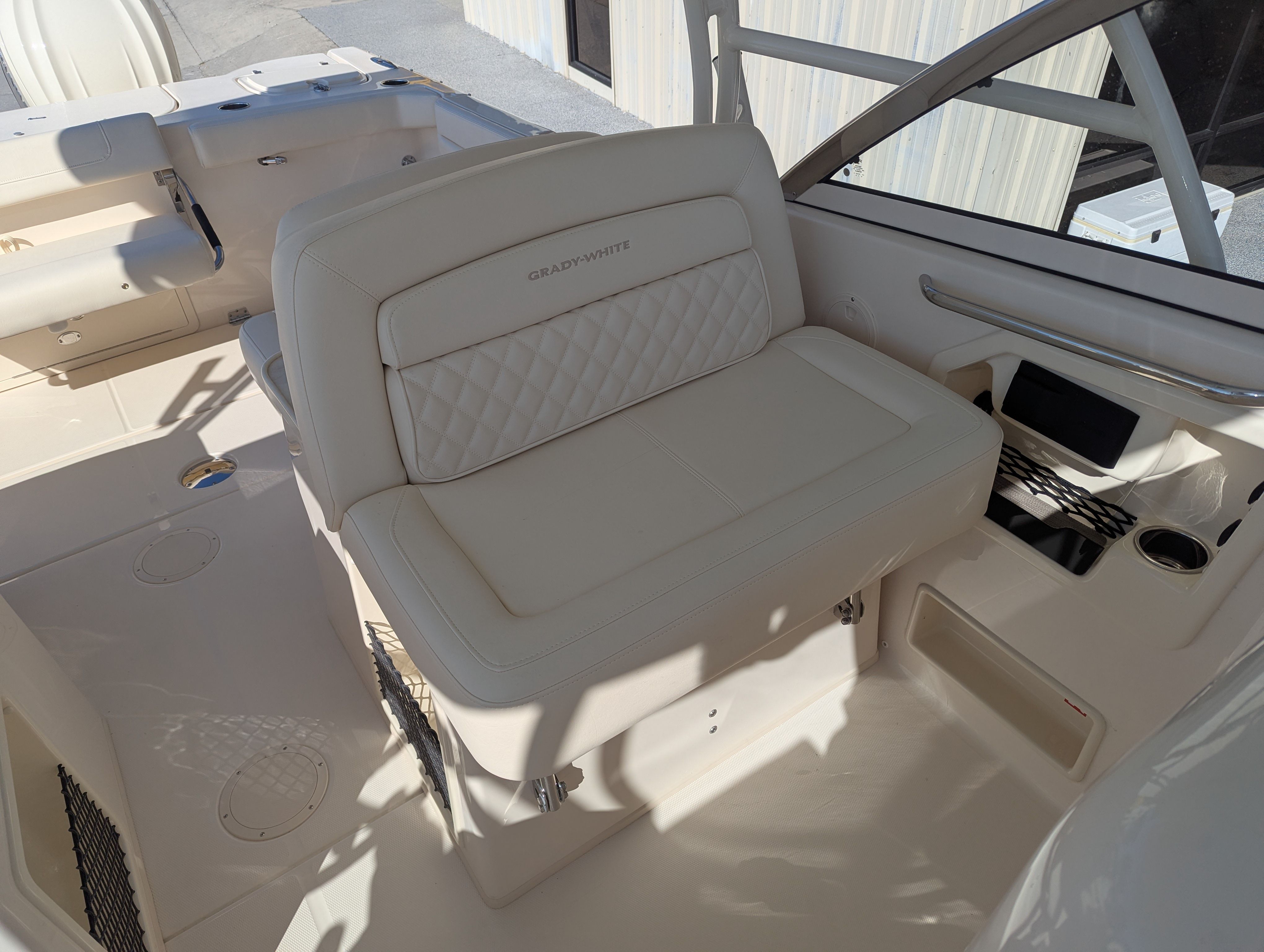 The Grady-White Freedom 307 is designed with practicality in mind. Its dual console layout offers ample storage for gear, water toys, and personal items, keeping the deck clutter-free and organized. The twin Yamaha F350 engines not only provide impressive speed but also make docking and maneuvering straightforward, especially in crowded marinas or tight slips.Fuel efficiency is a hallmark of Yamaha engines, allowing you to spend more time on the water and less time refueling. The boat’s thoughtful design ensures easy access to all areas, making maintenance and cleaning hassle-free. The Electric Sure Shade Top Oyster and other shade options provide quick and convenient protection, so you can adapt to changing conditions with ease.