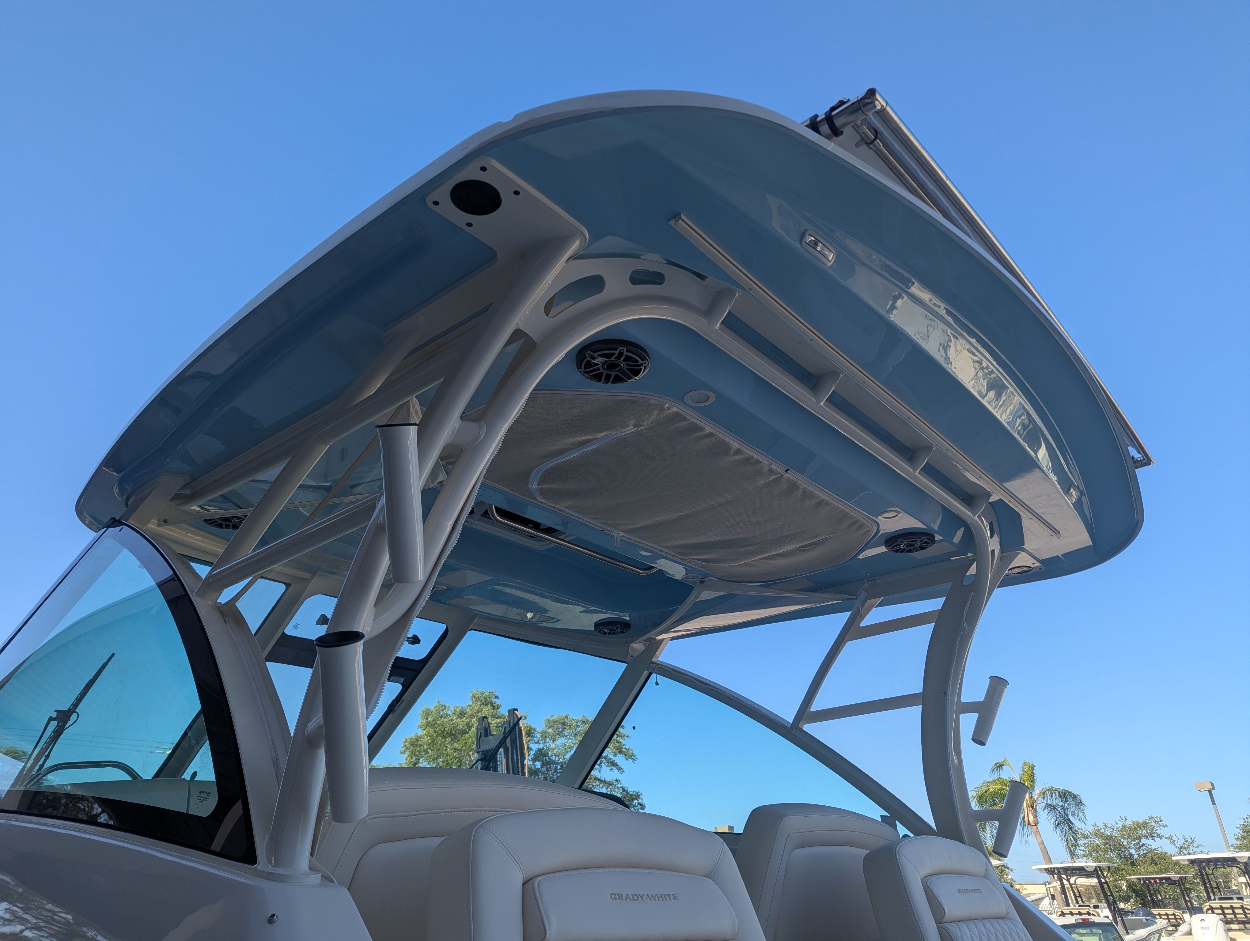 The 2026 Grady-White Freedom 325 is loaded with premium features that enhance both style and functionality. The dual Yamaha F350 engines are complemented by underwater lights, creating a captivating ambiance for evening cruises and dockside gatherings. The Gel Coat Celestial Blue finish adds a touch of sophistication, while the T-Top underside in Celestial Blue provides shade and protection from the elements. For added comfort and versatility, the Freedom 325 includes an Ivory Bow Shade, Ivory AV2 Aft Curtain, and Ivory Bow Cover, ensuring you and your guests stay cool and comfortable throughout the day. The installation of silver logos, a special request, adds a unique and distinguished touch to this already impressive vessel.