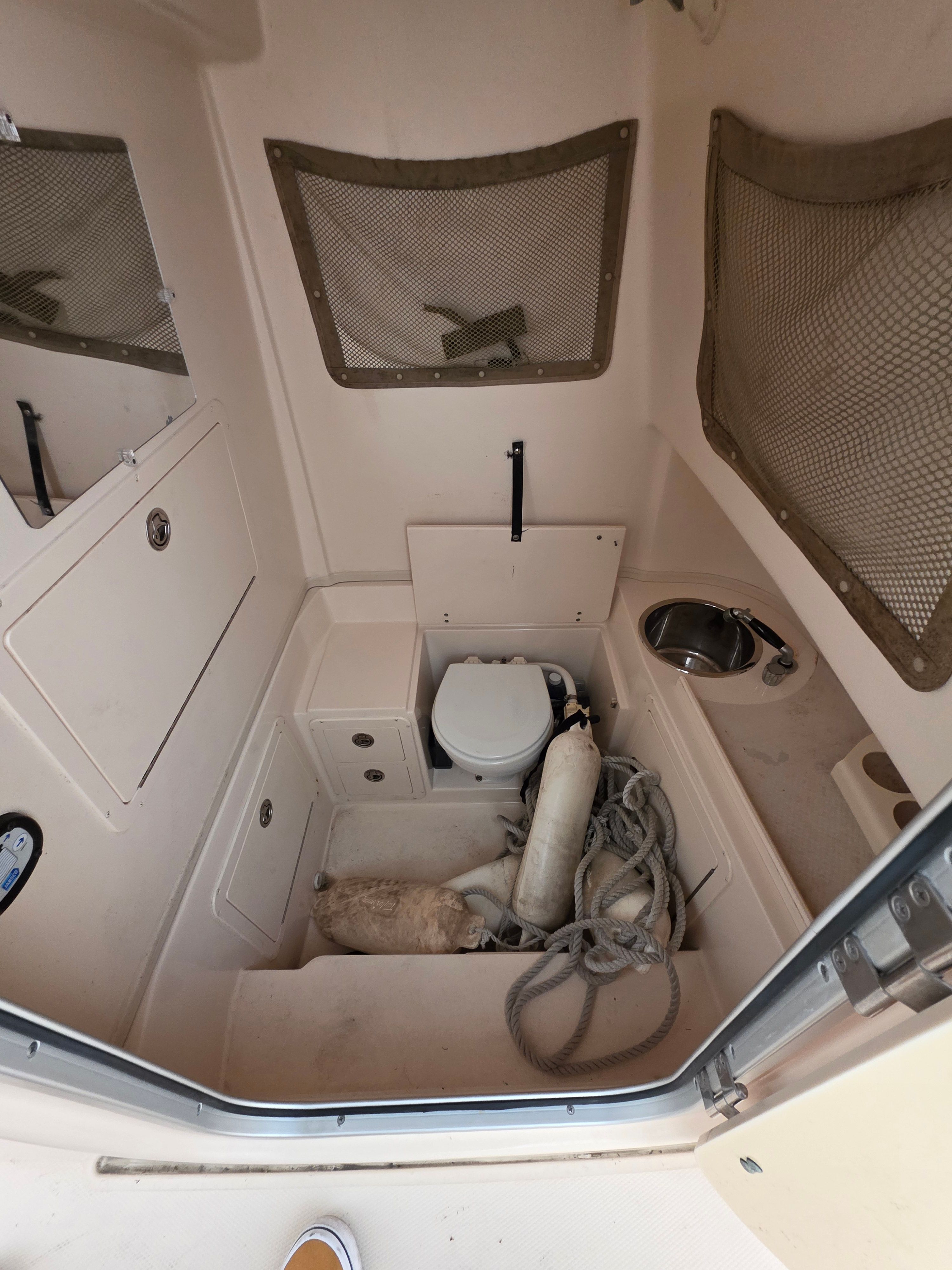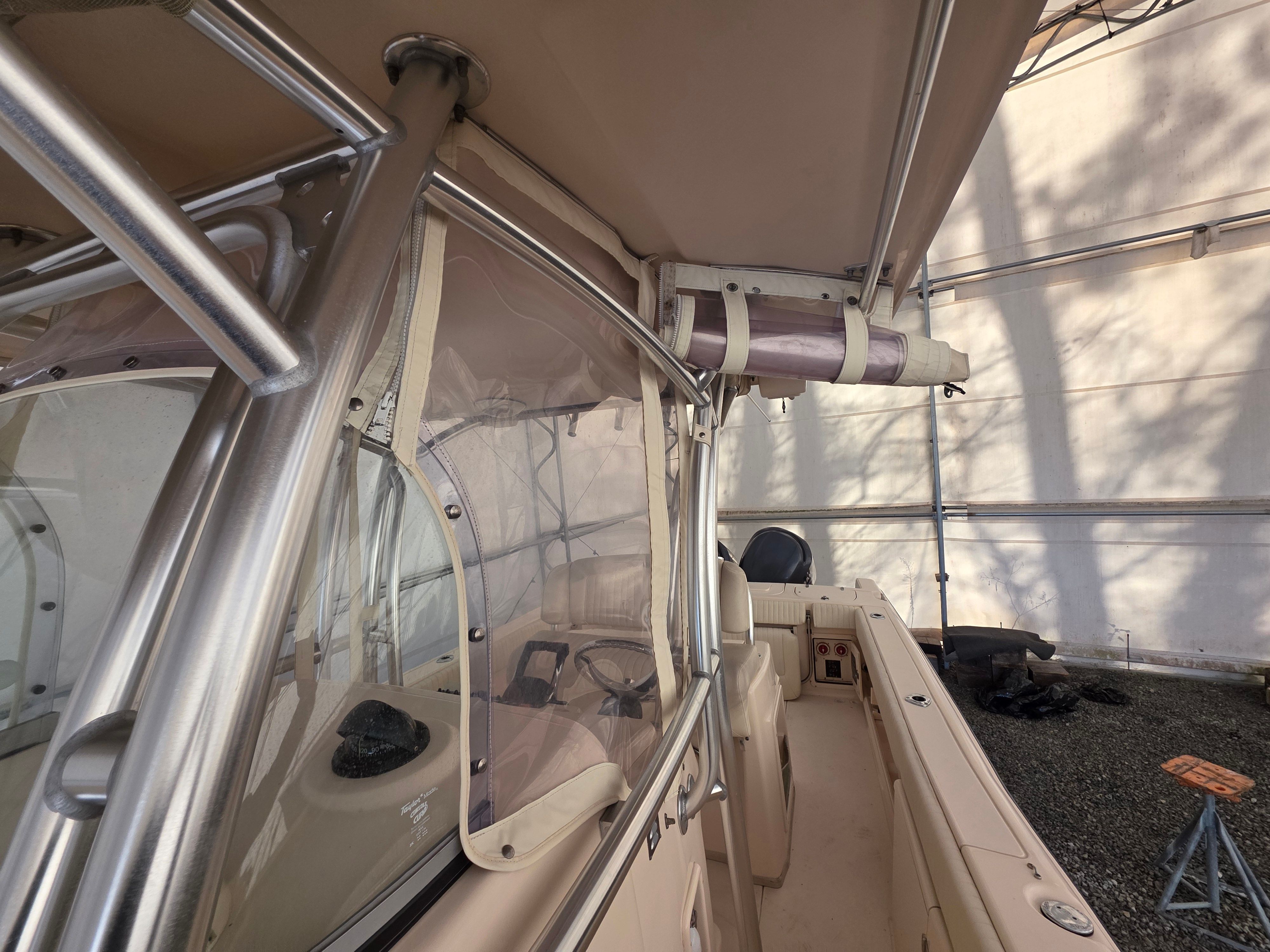 Fishing capability is enhanced with outriggers for expanded trolling spreads, while comfort features include bow cushions, full cockpit bolsters, and a marine toilet with holding tank, overboard discharge, and dockside pump-out—perfect for extended days on the water. The helm is protected by a three-sided weather enclosure with wing curtains, offering excellent protection from wind and spray in changing conditions.