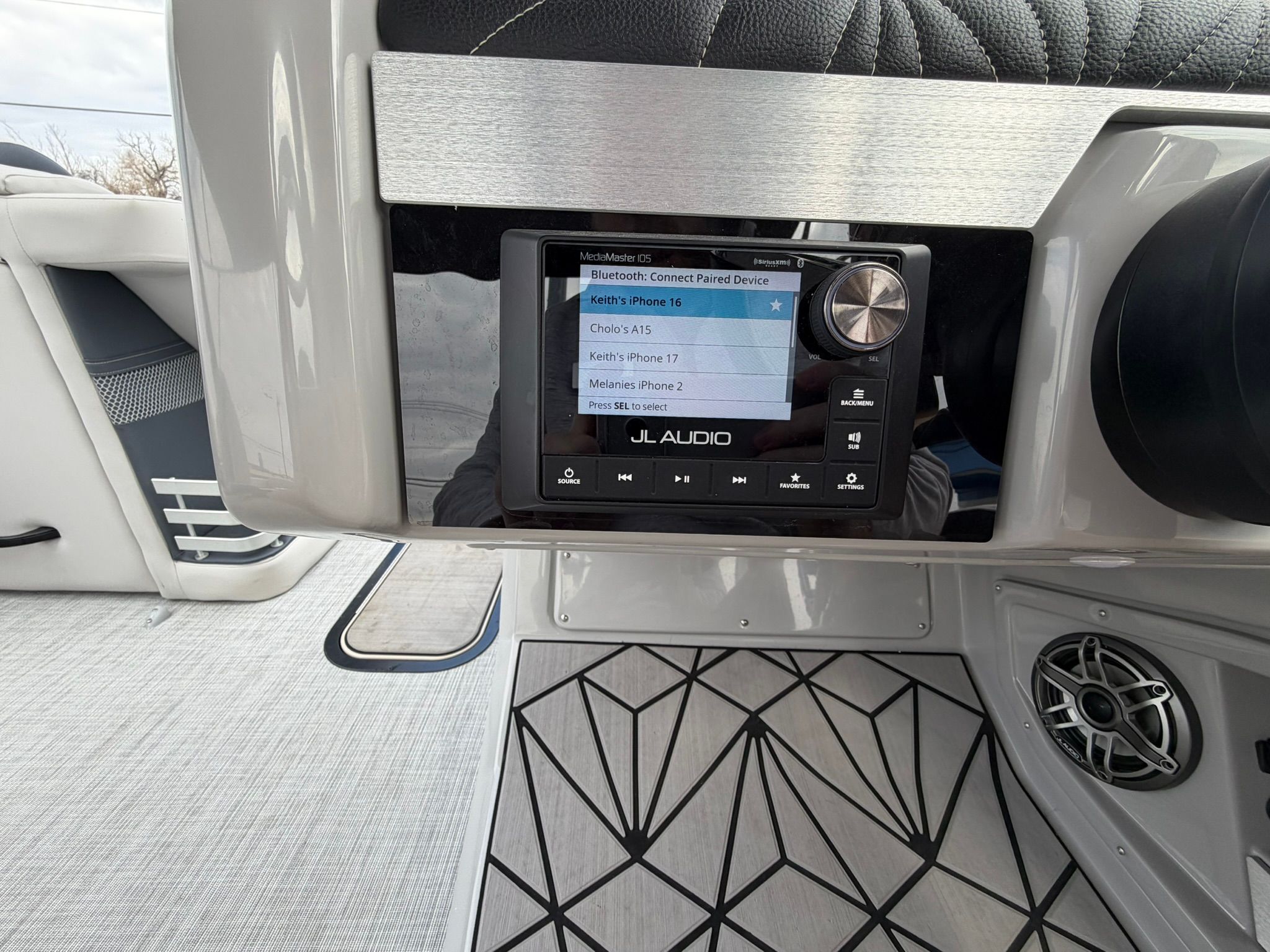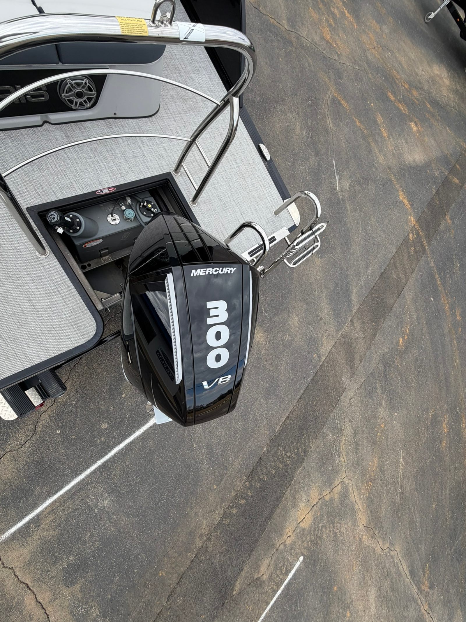 Cockpit, transom, and tower speakers with dual subwoofers and dual transom stereo remotes.