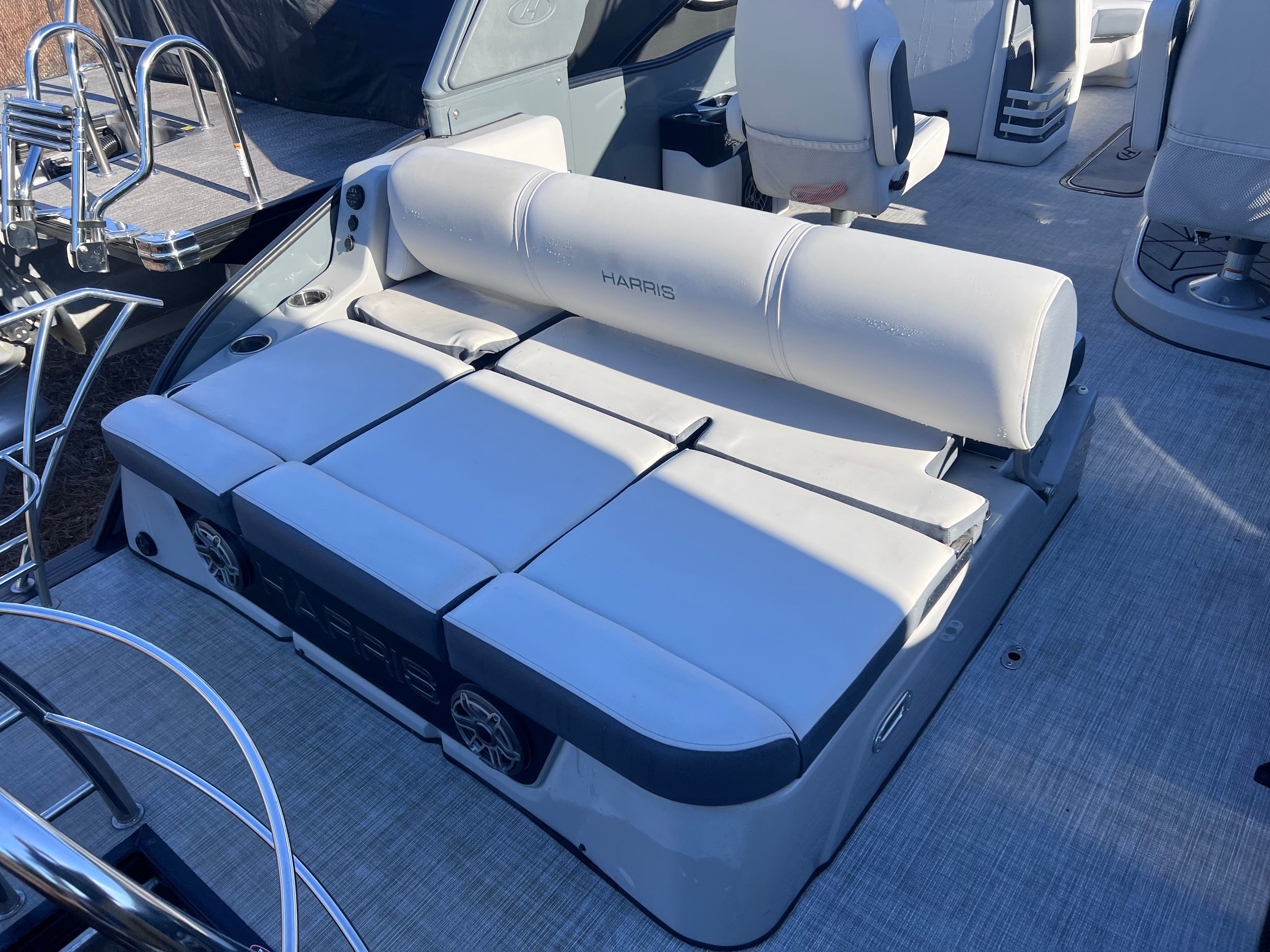 The 2022 Harris Grand Mariner 230 comes equipped with a range of features designed to enhance your time on the water. Its spacious deck layout provides plenty of room for guests to move about comfortably, while the plush seating invites you to sit back and unwind. The pontoon’s thoughtful design ensures that every inch of space is utilized efficiently, making it ideal for socializing, sunbathing, or enjoying a meal with loved ones. The high-quality construction and attention to detail are evident throughout, from the durable flooring to the stylish railings and fixtures. With its generous length and well-planned layout, this Harris boat for sale offers both functionality and elegance.