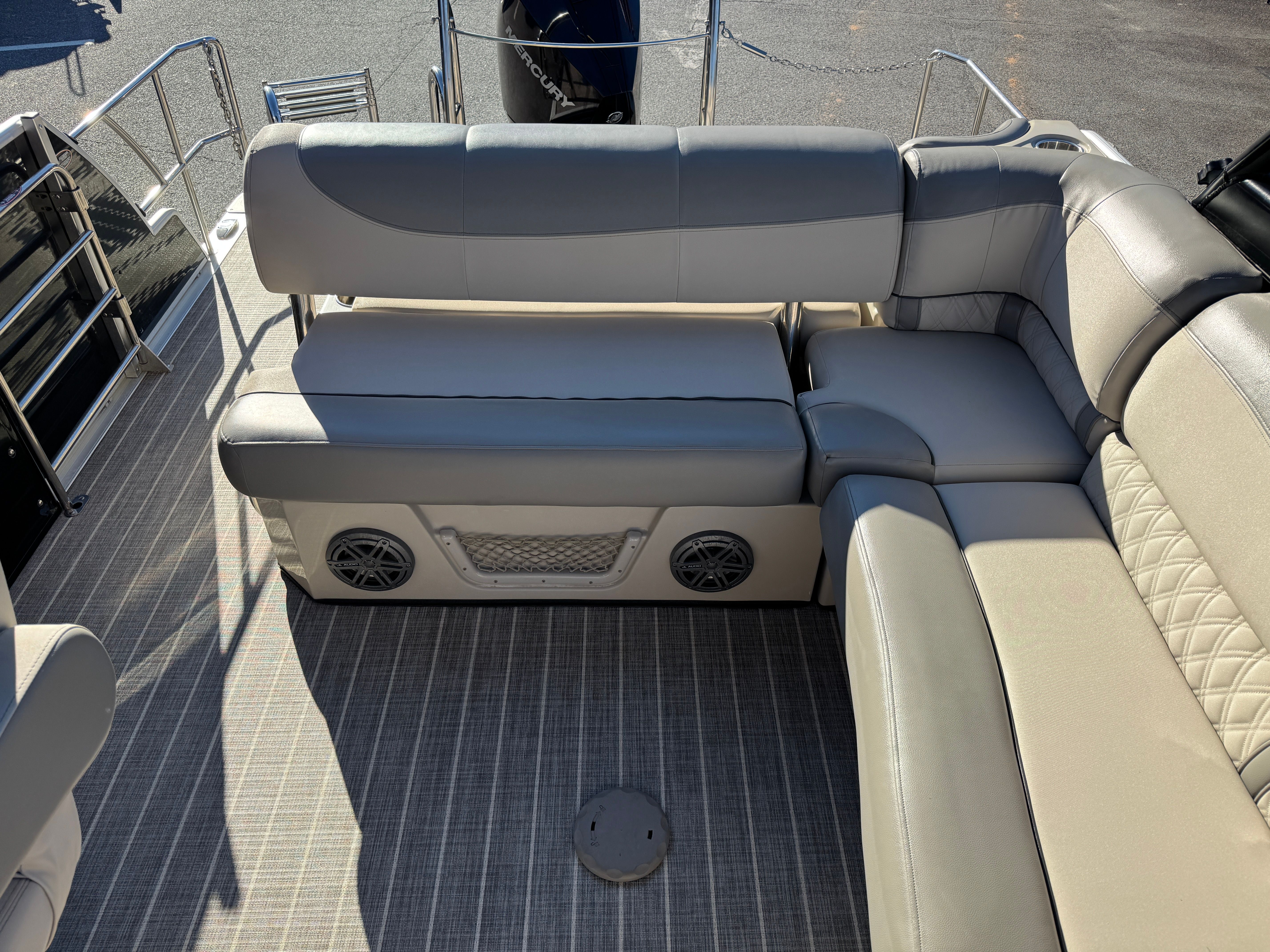 Powering this Harris Grand Mariner 250 is a single engine boasting a robust 300 horsepower, with 498 engine hours logged. This powerful setup ensures smooth acceleration, responsive handling, and the ability to cruise effortlessly across the water. Whether you’re towing water toys, heading out for a day of fishing, or simply enjoying a sunset cruise, the engine’s impressive output provides the performance you need for a variety of activities. The combination of high horsepower and pontoon stability means you can expect a thrilling yet comfortable ride every time you set out.