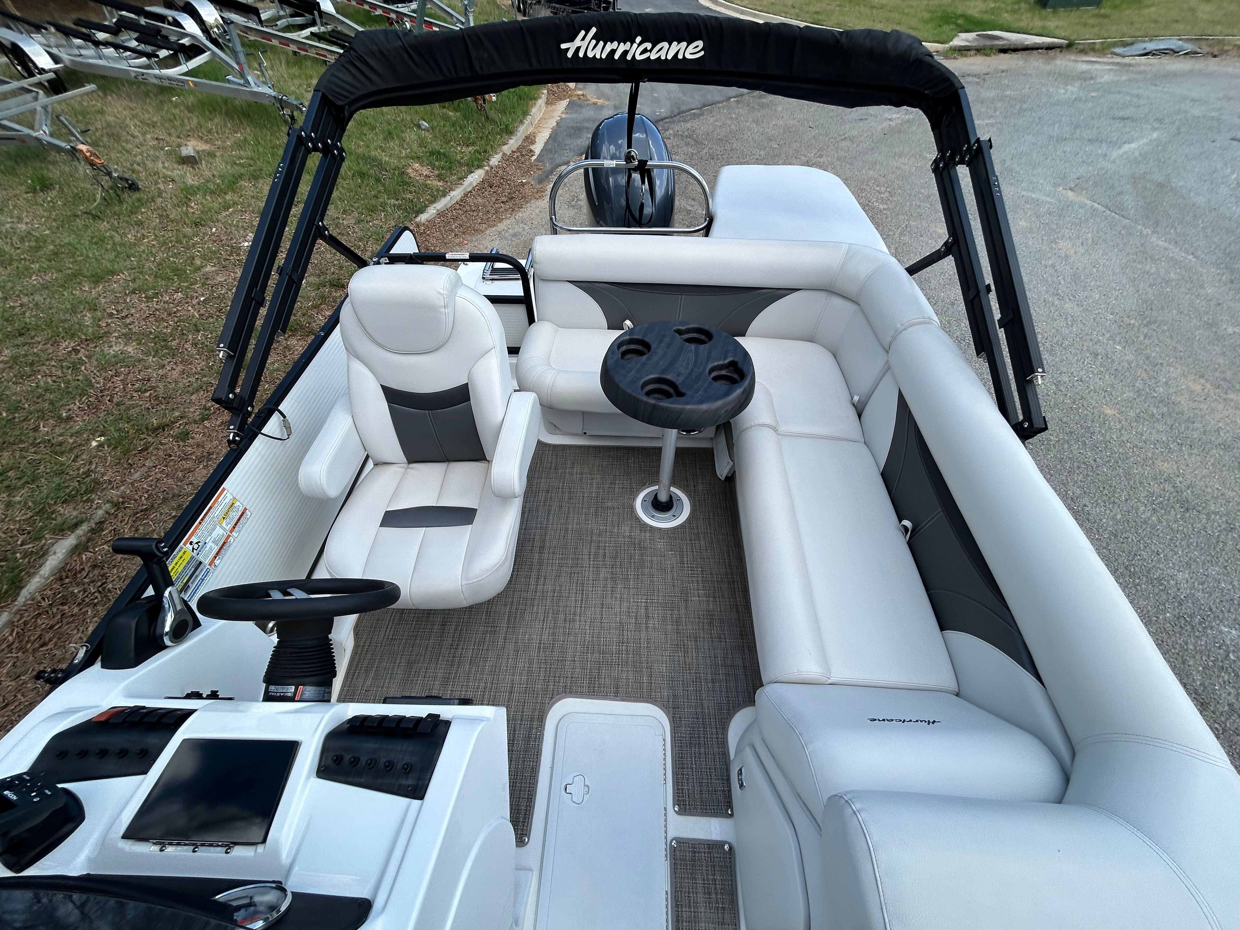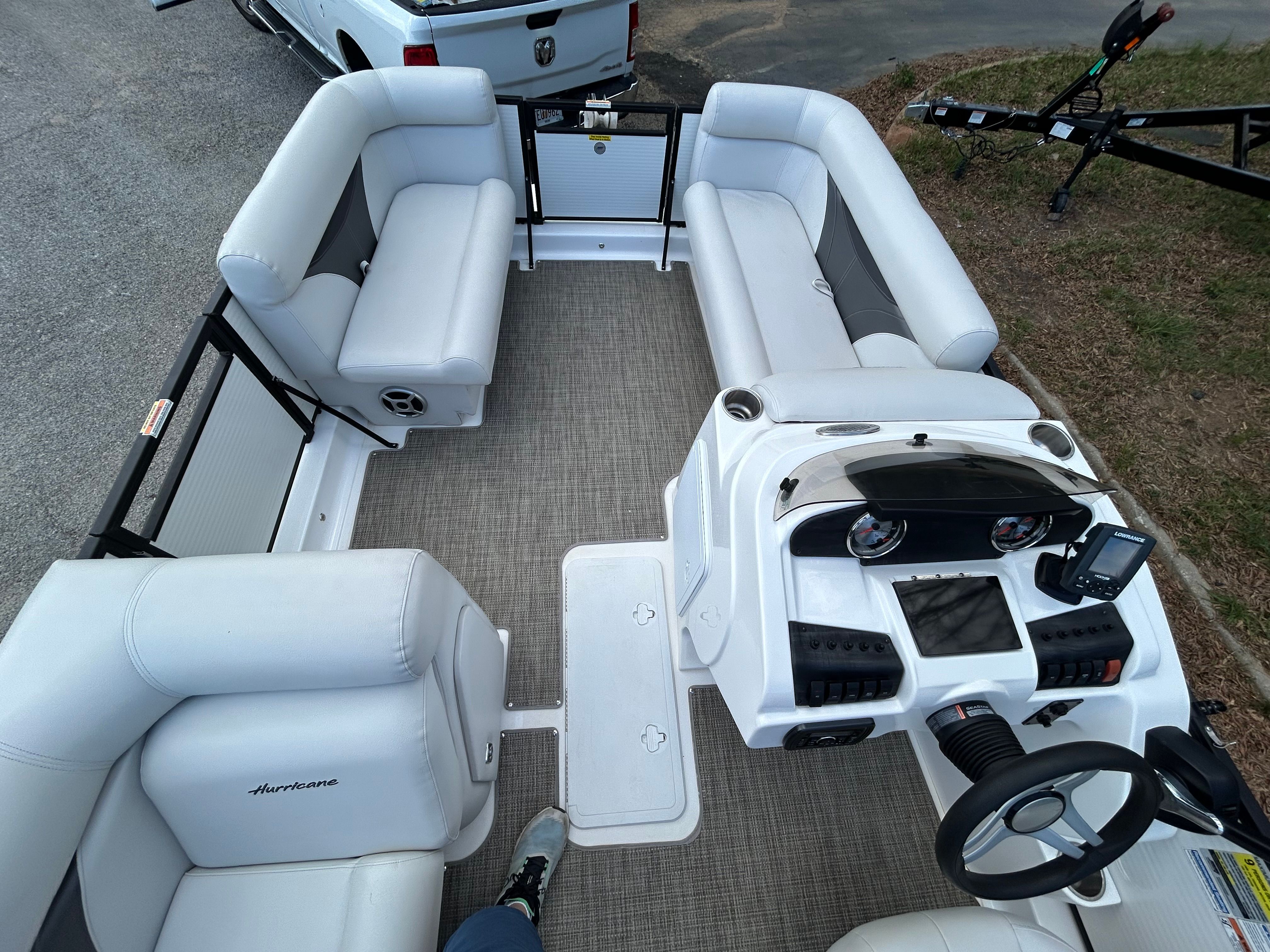 Powering this impressive pontoon is a single engine with 150 horsepower, delivering a smooth and responsive ride. The 150 HP engine provides the perfect balance of power and efficiency, allowing you to cruise effortlessly, tow water toys, or reach your favorite fishing spot with ease. With only 117 engine hours, this Hurricane FD 196 promises reliable performance for many seasons to come. The engine’s design ensures quiet operation and fuel efficiency, so you can spend more time enjoying the water and less time at the fuel dock. Whether you are gliding across calm waters or navigating through gentle waves, the Hurricane FD 196 offers a confident and enjoyable boating experience.