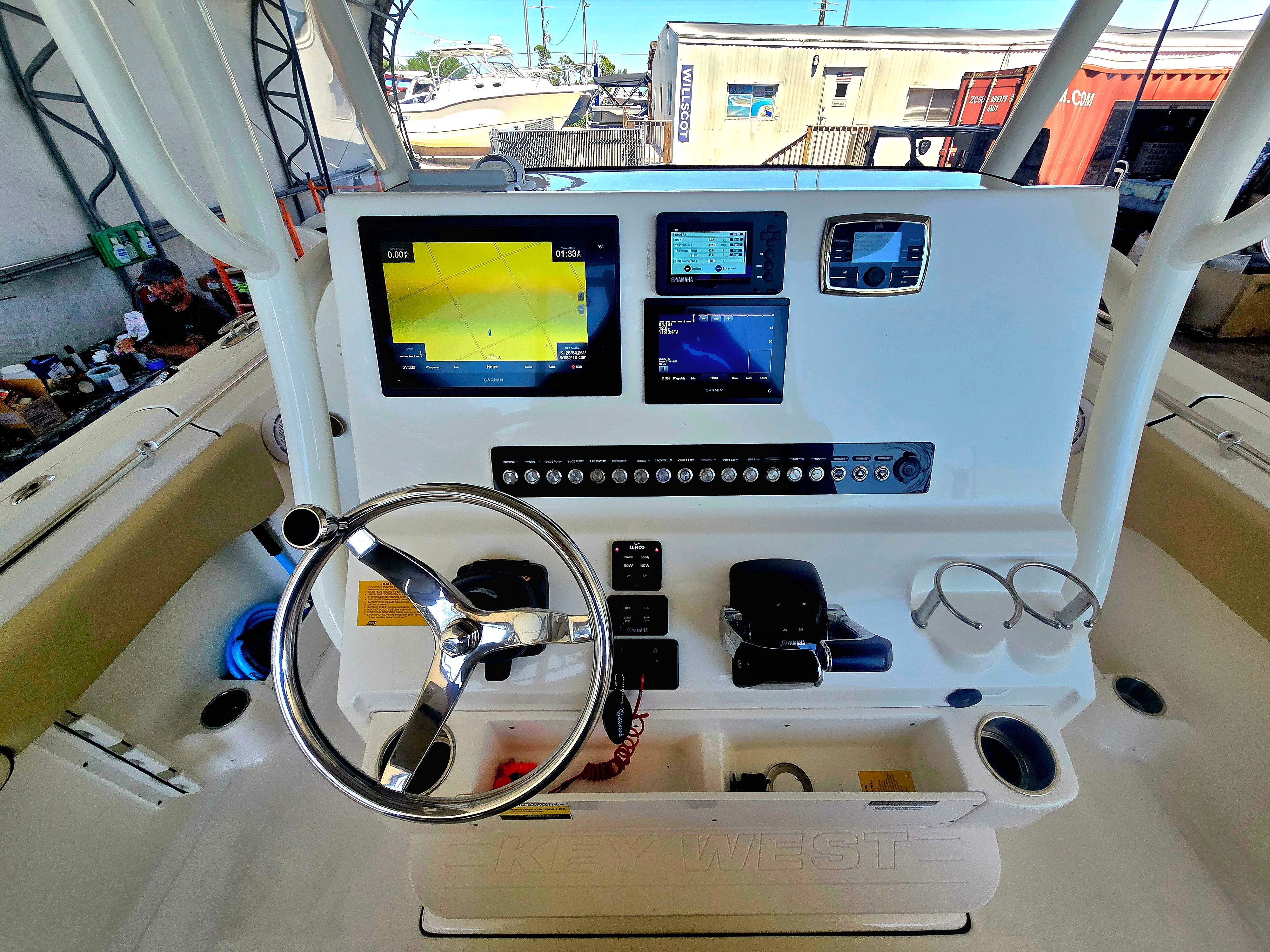 This very clean 2020 KeyWest 263 FS has many amenities such as side step dive door with an integrated ladder, forward seating with removable backrest in a full width rear bench seat, very large dual live wells located in the stern. Also has dual large in floor fish boxes. This is powered by twin Yamaha 200s with about 110 hours.
