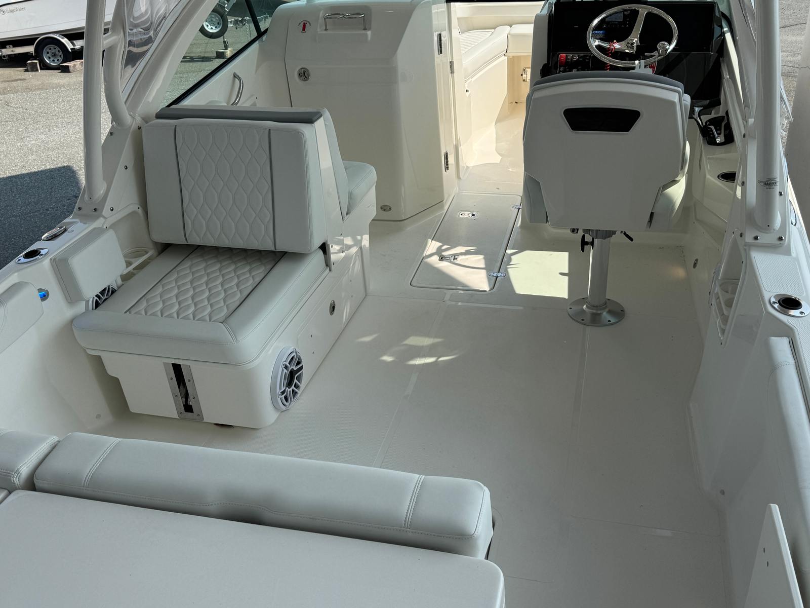 The Pursuit DC 246 is designed with practicality in mind, making ownership easy and enjoyable. The Dual Console layout offers flexible seating and storage options, allowing you to customize the space for different activities. The anchor windlass system simplifies docking and anchoring, saving time and effort during your adventures. The electric fresh water head provides added convenience for families and guests, ensuring comfort during extended trips.LED cockpit accent lights enhance visibility and safety during evening outings, while the premium stereo system keeps everyone entertained. The forward poly table is perfect for meals, games, or simply relaxing with a drink in hand. With its efficient engine and advanced control systems, the DC 246 is easy to maneuver in tight spaces, making docking and launching a breeze. Pursuit’s attention to detail ensures that every aspect of the boat is designed for maximum enjoyment and minimal hassle.