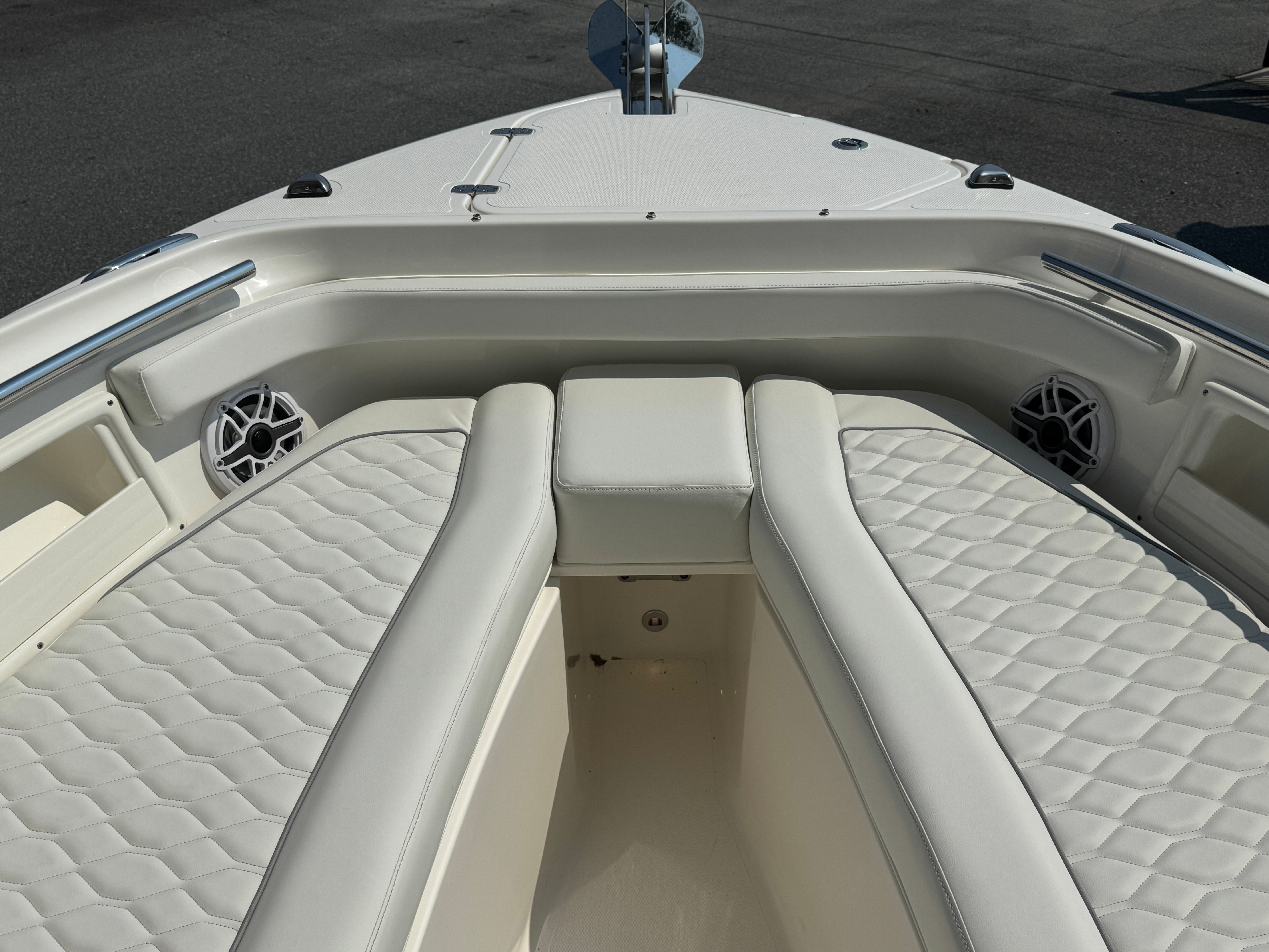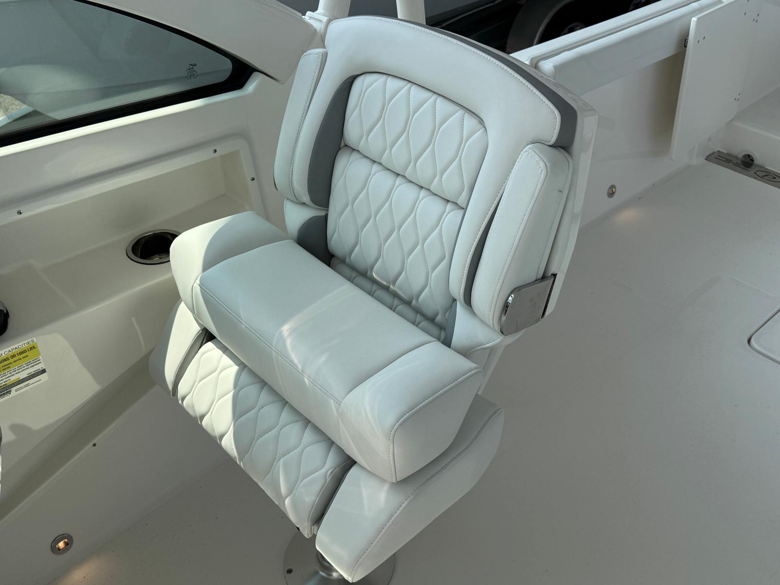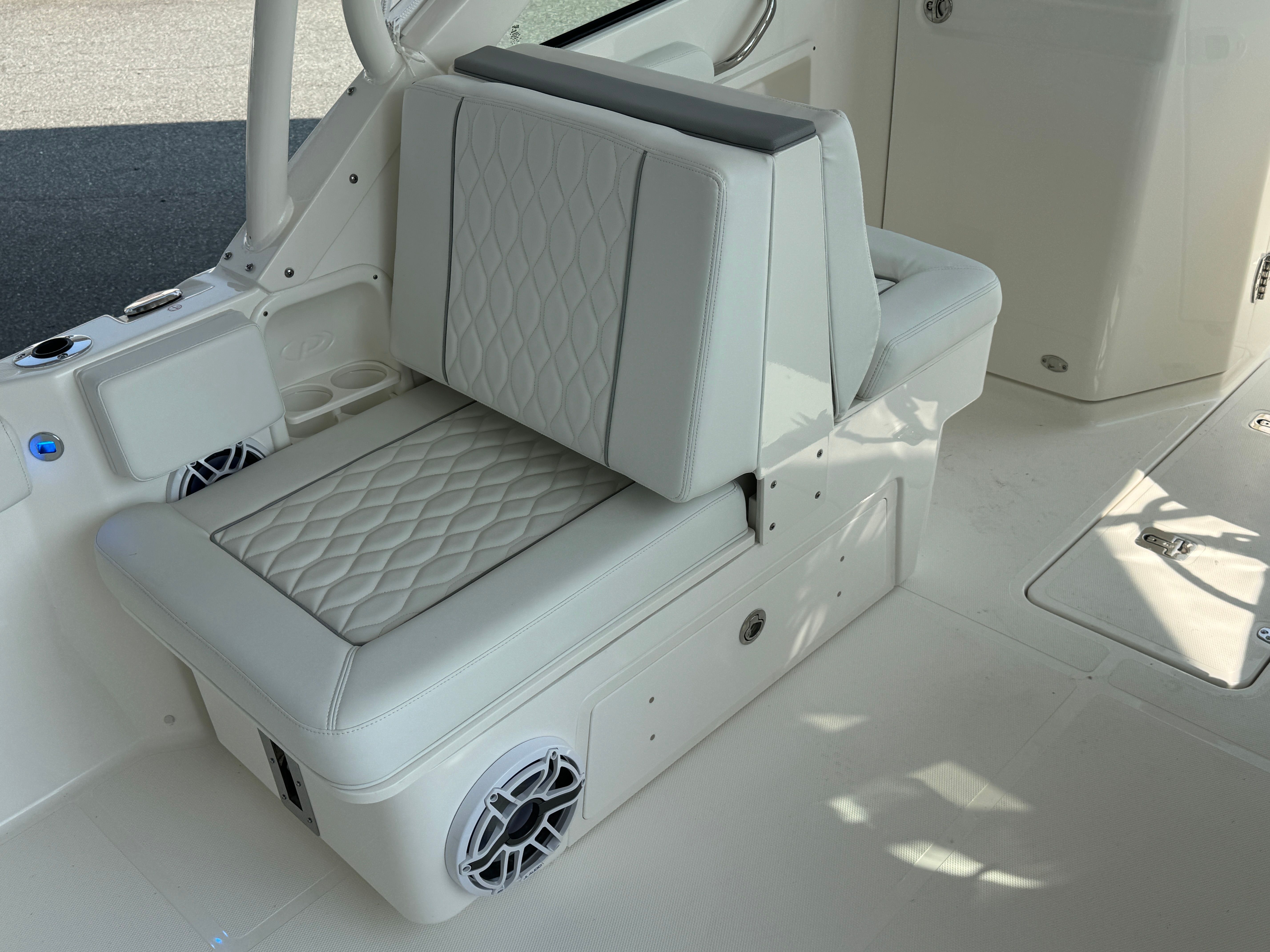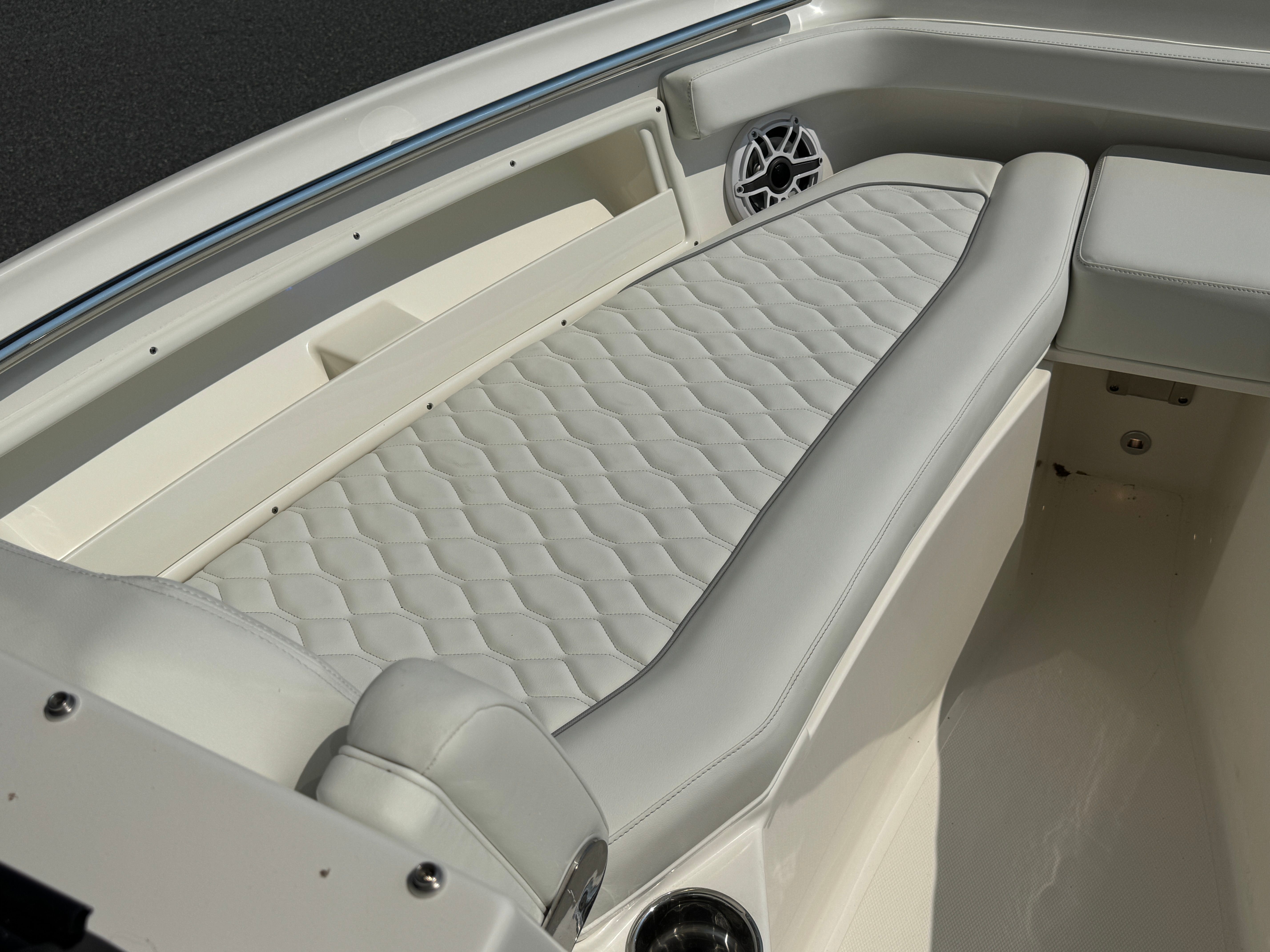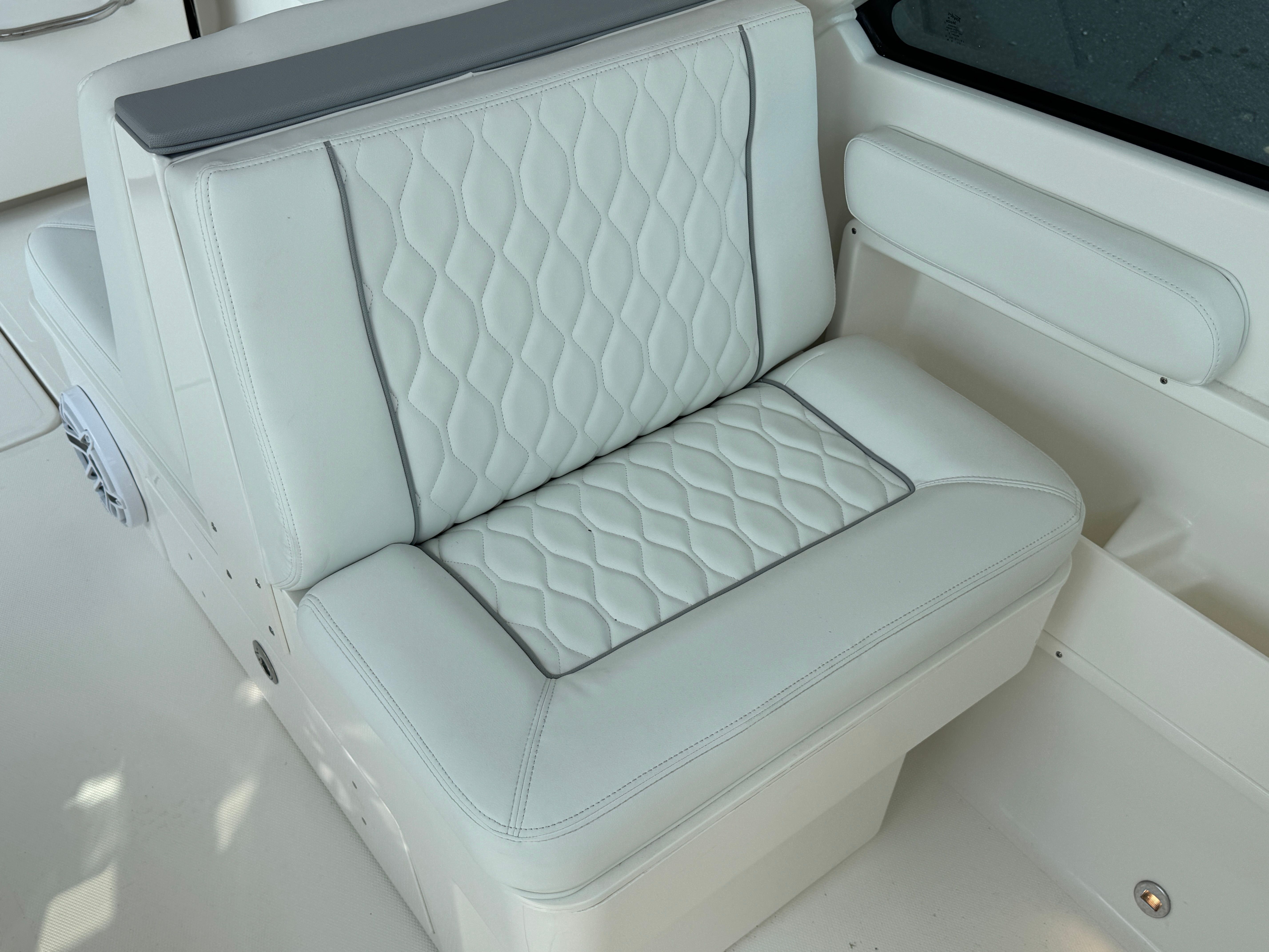 The Pursuit DC 246 is packed with premium features designed to enhance your boating experience. The upgraded upholstery in white and gray not only elevates the boat’s aesthetic but also ensures maximum comfort for you and your guests. The anchor windlass system with remote makes anchoring effortless, allowing you to secure your spot with the push of a button. For convenience and comfort, the electric fresh water head comes equipped with a 6-gallon holding tank, providing a private and functional restroom on board.Ambient lighting is provided by four mid-level cockpit accent lights in LED blue, creating a relaxing atmosphere for evening cruises or dockside gatherings. The stereo system receives a premium upgrade with JL Audio components, including a 6-channel DSP amp, subwoofer, four sport speakers with blue backlighting, and an external antenna. The Sirius receiver and included three-month subscription ensure you have access to your favorite music and entertainment while on the water. The forward poly table adds versatility to the bow area, perfect for dining, socializing, or simply enjoying the view.