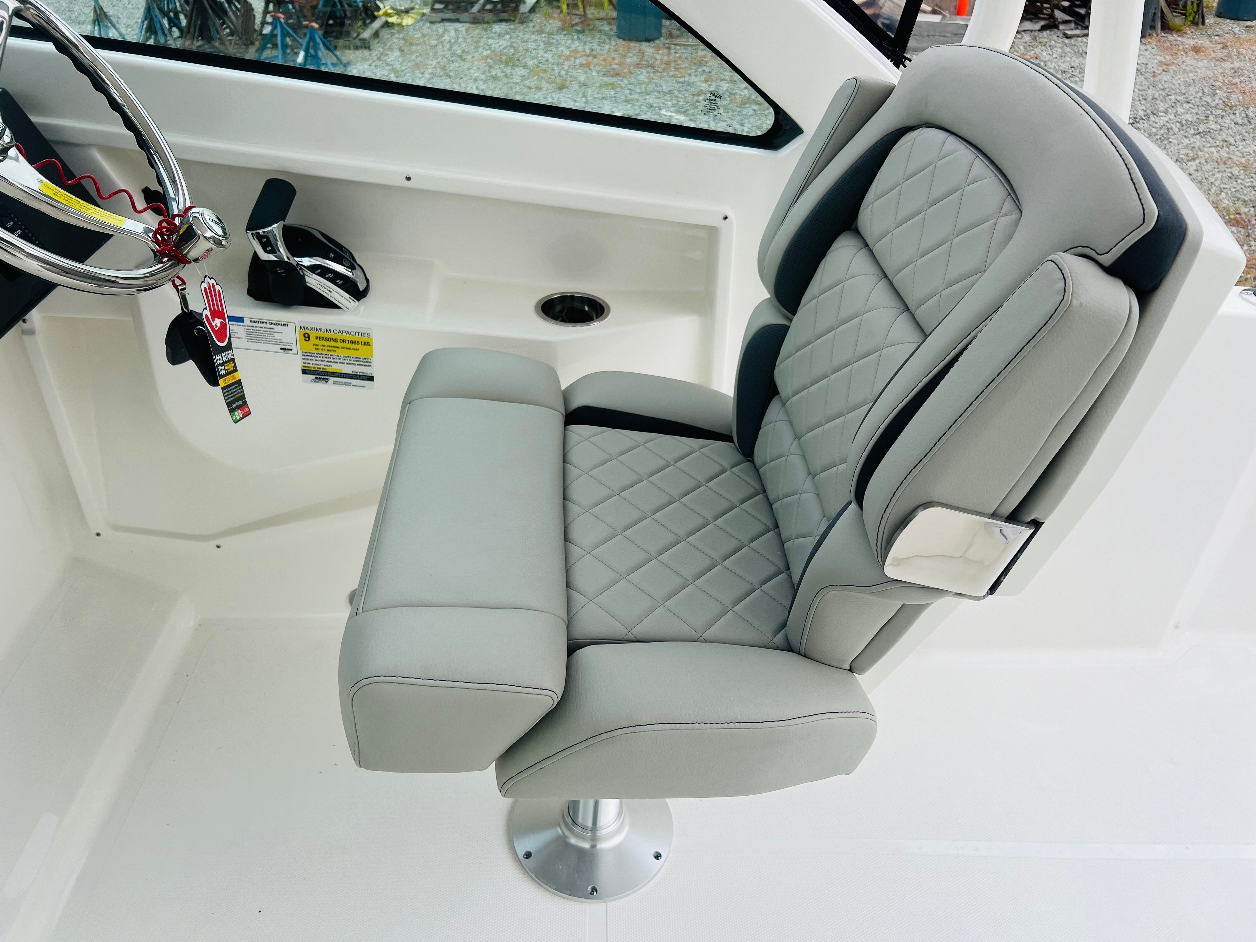 The Pursuit DC 246 is loaded with features designed to enhance your boating experience. The anchor windlass system with remote allows for easy anchoring, making it simple to find the perfect spot to relax or fish. Underwater lights, specifically two all-color Sea Blaze Quattro Spectrum units, create a captivating glow beneath the waterline, perfect for evening cruises or entertaining guests after sunset. The electric fresh water head, complete with a 6-gallon holding tank, adds convenience and comfort for longer outings. Mid-level cockpit accent lights, with four LED blue fixtures, provide stylish illumination and enhance the boat’s modern aesthetic.The thoughtful design extends to every detail, from the ergonomic helm layout to the plush seating arrangements. The Sea Salt upholstery is both durable and comfortable, ensuring that every passenger can relax in style. The Coastal Sunrise Interior Package brings a warm and inviting atmosphere to the cockpit and cabin, making the Pursuit DC 246 a true home away from home on the water.