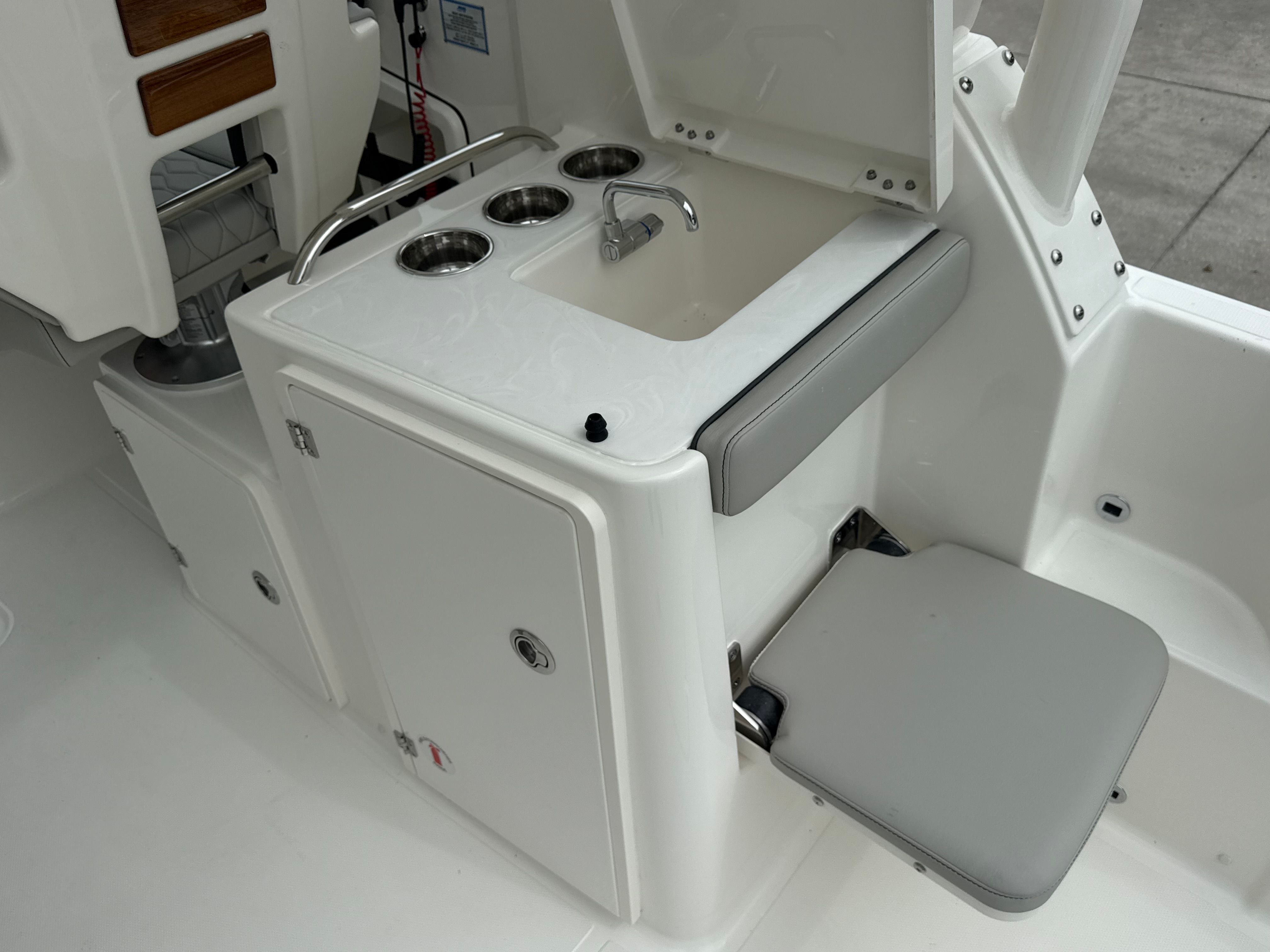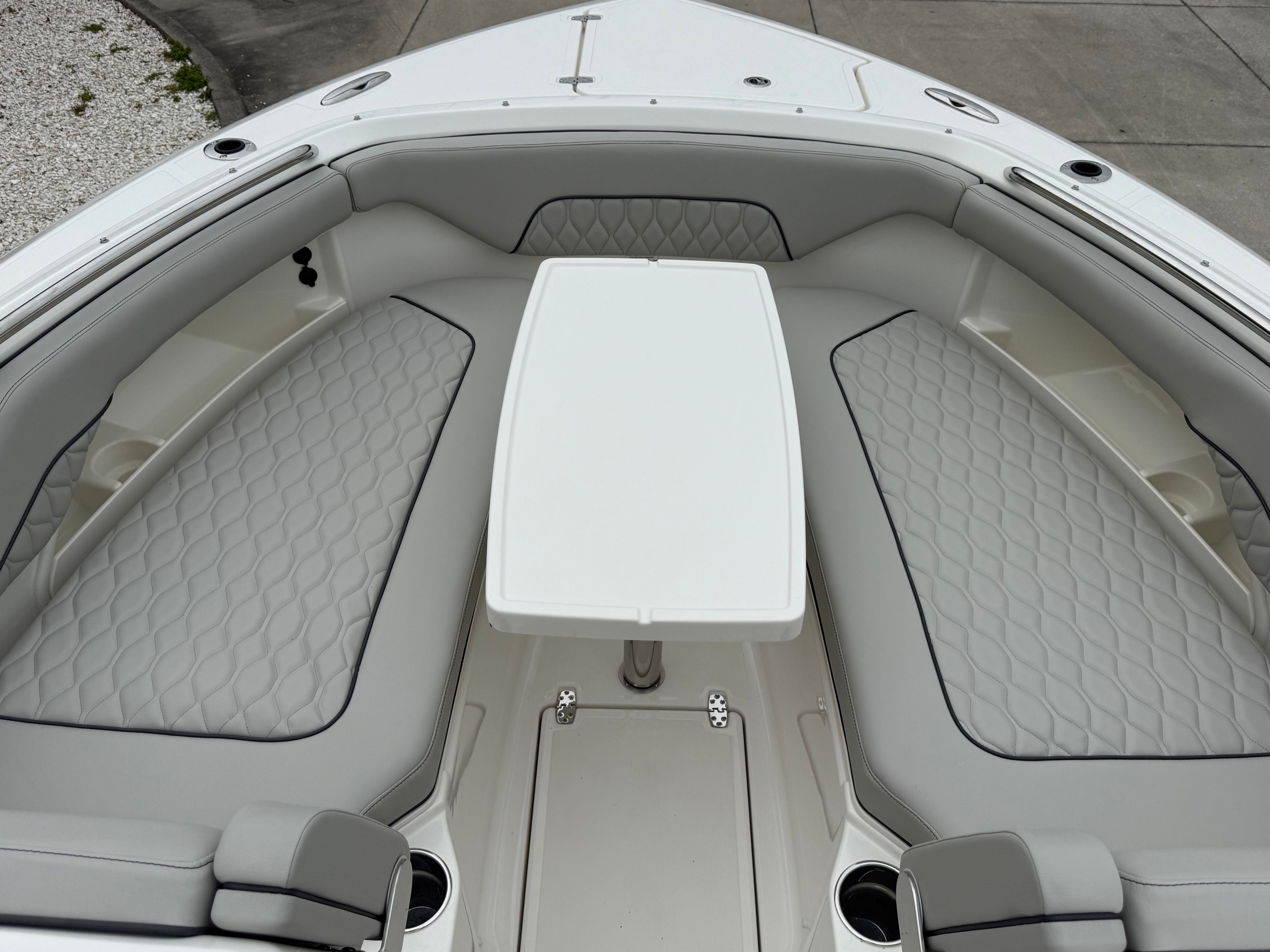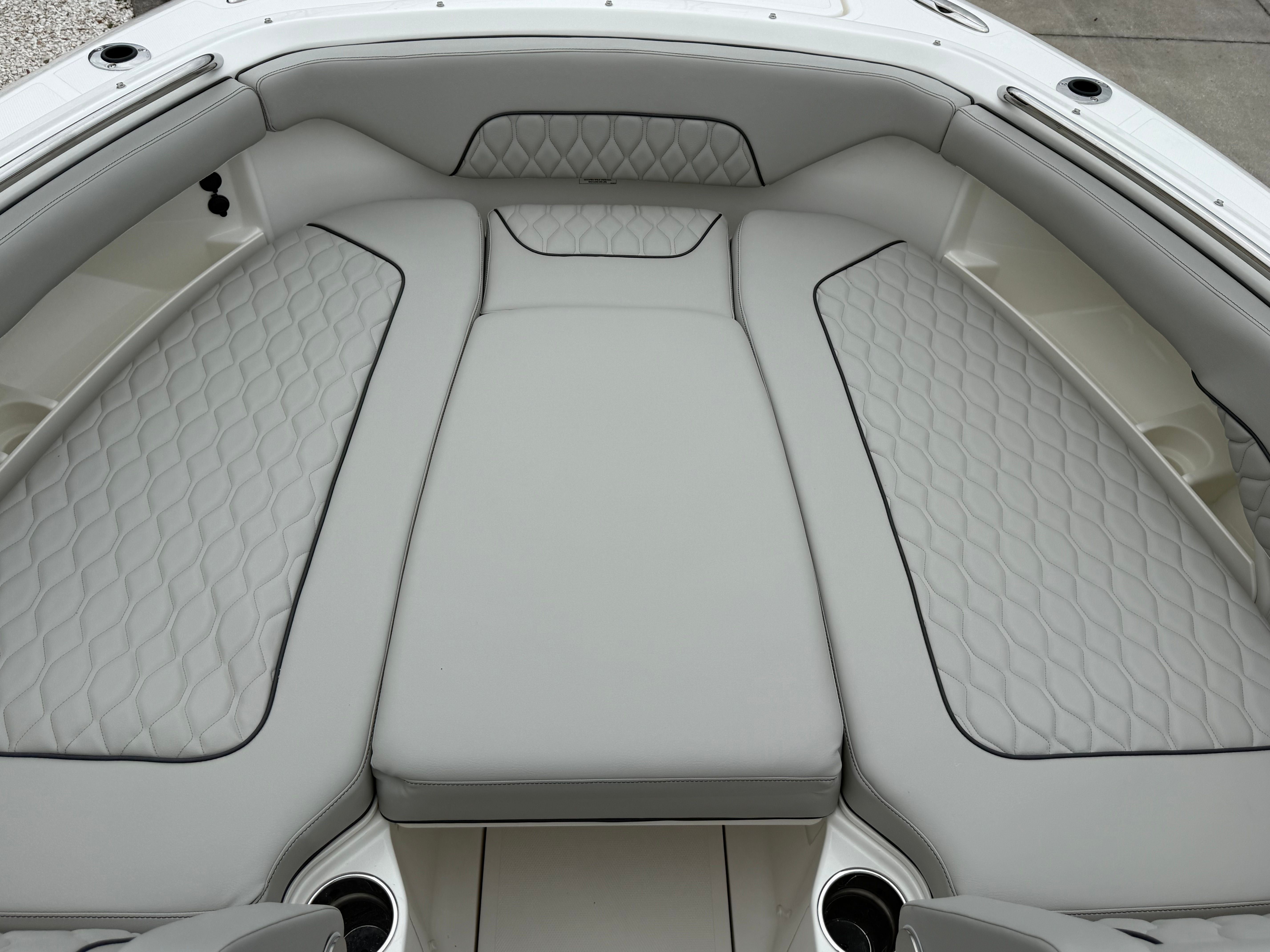 Beyond its impressive style and performance, the Pursuit DC 286 is designed with practical boating needs in mind. The 30-foot length strikes an ideal balance between spaciousness and maneuverability, making it easy to handle in a variety of settings. The Yamaha Joystick Control system simplifies docking, allowing even less experienced boaters to approach slips and docks with confidence.The dedicated storage solutions, such as the bow sun pad filler cushion compartment, help keep the deck organized and clutter-free. The stainless steel refrigerator/freezer is perfect for storing drinks and snacks, ensuring you are always prepared for a day on the water. The 30 Amp dockside power with ELCI protection provides peace of mind, knowing your electrical systems are safeguarded and reliable.