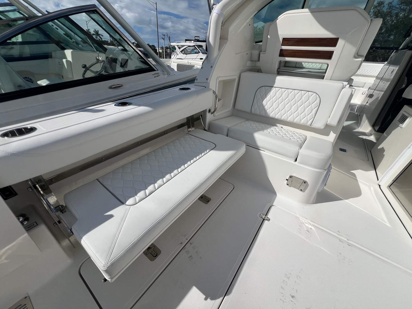 The Pursuit DC 326 is designed with practicality in mind, making ownership as enjoyable as it is effortless. The ample storage throughout the boat ensures that all your gear, water toys, and personal items have a designated place, keeping the deck clutter-free and organized. Docking and maneuvering are made easy thanks to the responsive twin Yamaha engines and intuitive helm controls.The efficient generator provides reliable power for all your onboard amenities, so you can enjoy extended trips without sacrificing comfort. The air conditioning system, combined with the retractable sunshade, allows you to create the perfect environment for relaxation, no matter the weather. The cockpit grill and cooler make it simple to prepare and enjoy meals on the go, adding convenience to your boating lifestyle.