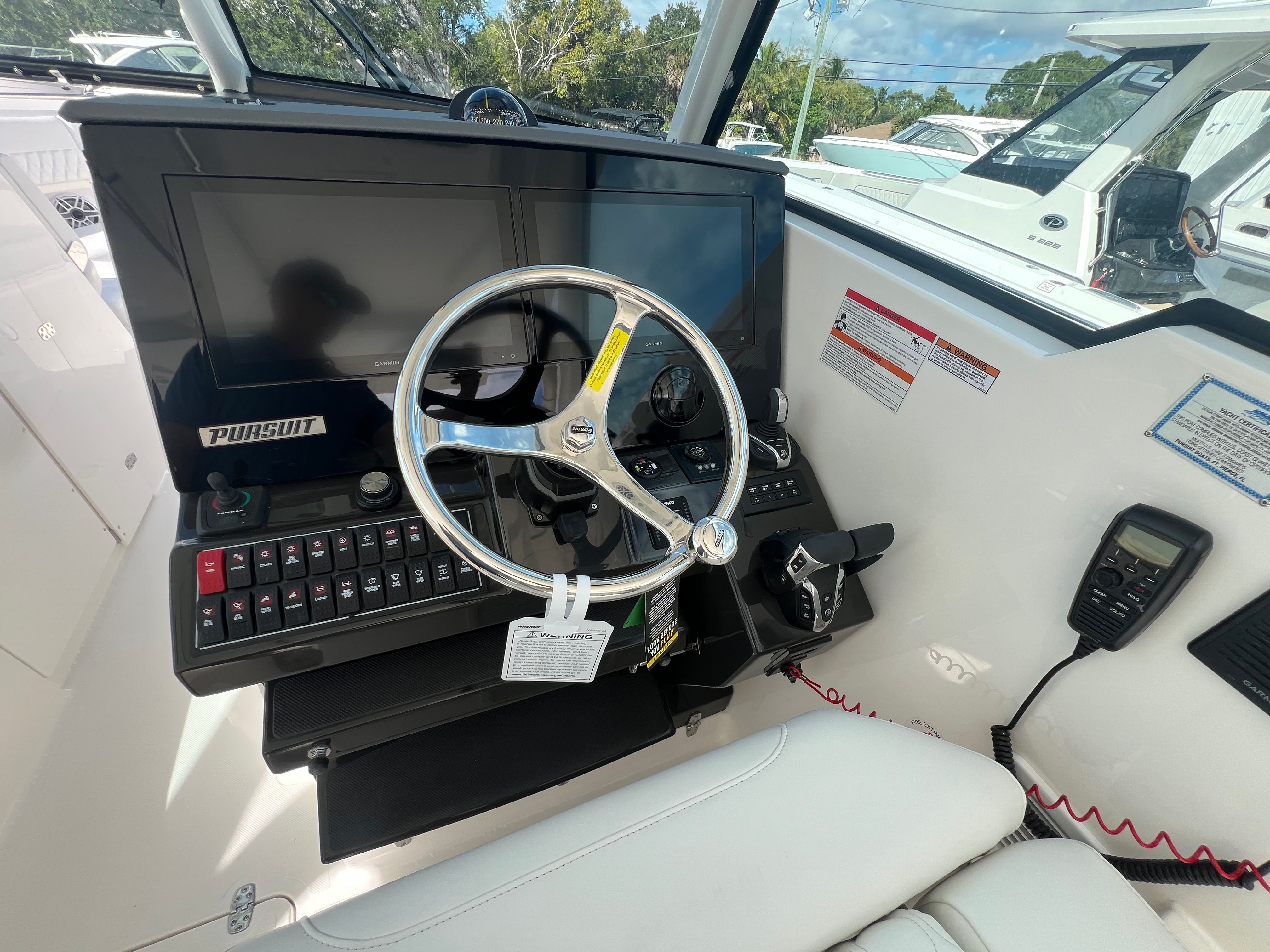 The Pursuit DC 326 comes loaded with premium features that set it apart from other boats in its class. The helm features a sophisticated Carbon color scheme, adding a touch of modern elegance to your command center. For those who love to entertain, the 110V/60Hz cockpit grill with a drip pan allows you to prepare delicious meals right on board, while the 120V/60Hz generator (5.0kW Fischer Panda Genset) with a 16-gallon diesel tank ensures you have reliable power for all your onboard systems.A 12V, 1.7 cu. ft. cooler with a chill plate under the aft-facing seat keeps your beverages and snacks perfectly chilled, enhancing your relaxation and enjoyment. The air conditioning package with reverse cycle offers 6,000 BTU for the cabin and head, and 12,000 BTU for the cockpit (requires a drop curtain), ensuring comfort in any weather. The bridge deck teak table with storage provides a stylish and functional space for dining or socializing, while the custom retractable Makefast sunshade with one-touch operation offers instant protection from the sun.Music lovers will appreciate the premium stereo upgrade, delivering crystal-clear sound throughout the boat. For added safety and convenience, the ACR RCL-100 LED spotlight with remote control at the helm ensures excellent visibility during nighttime navigation.
