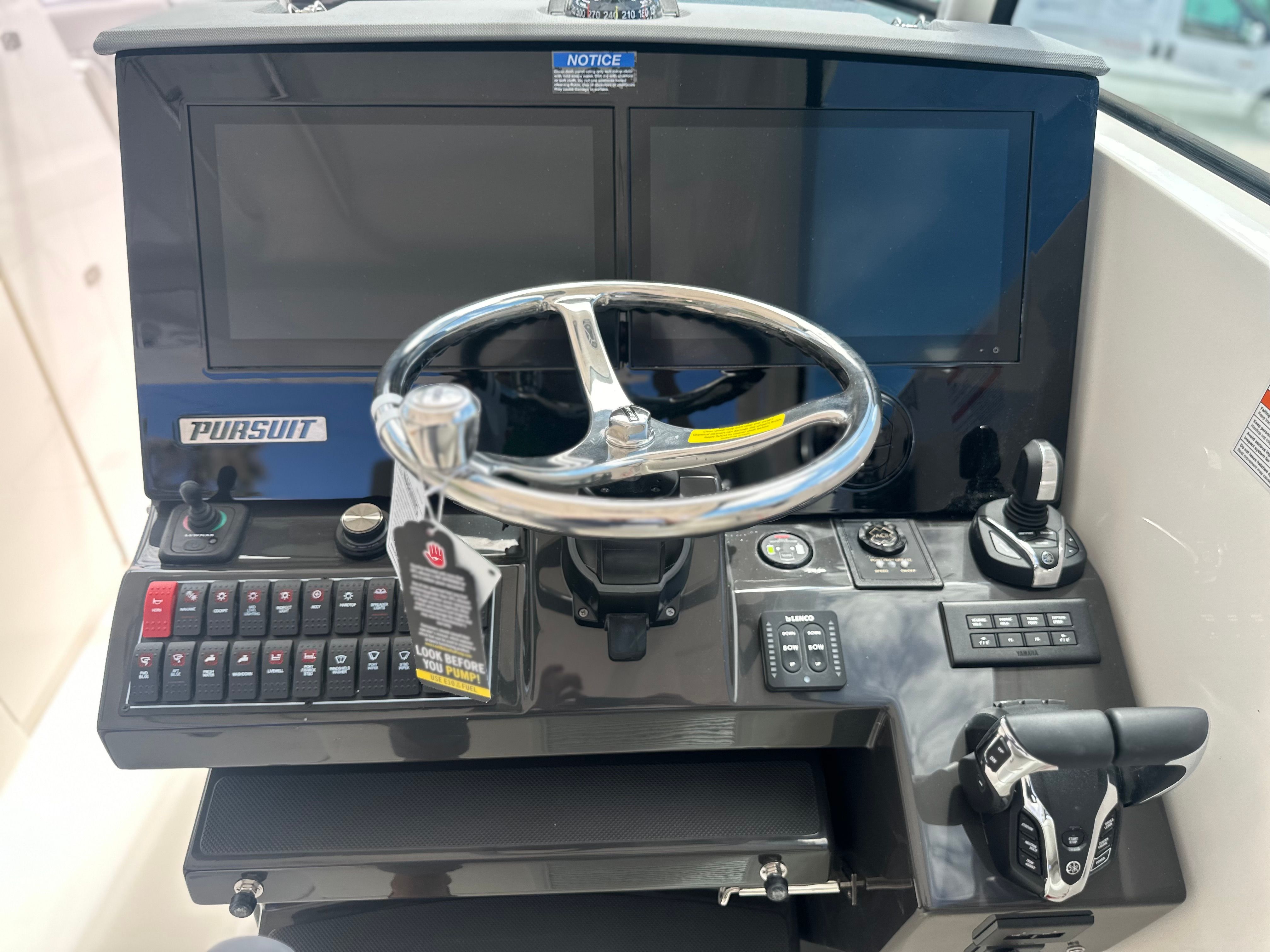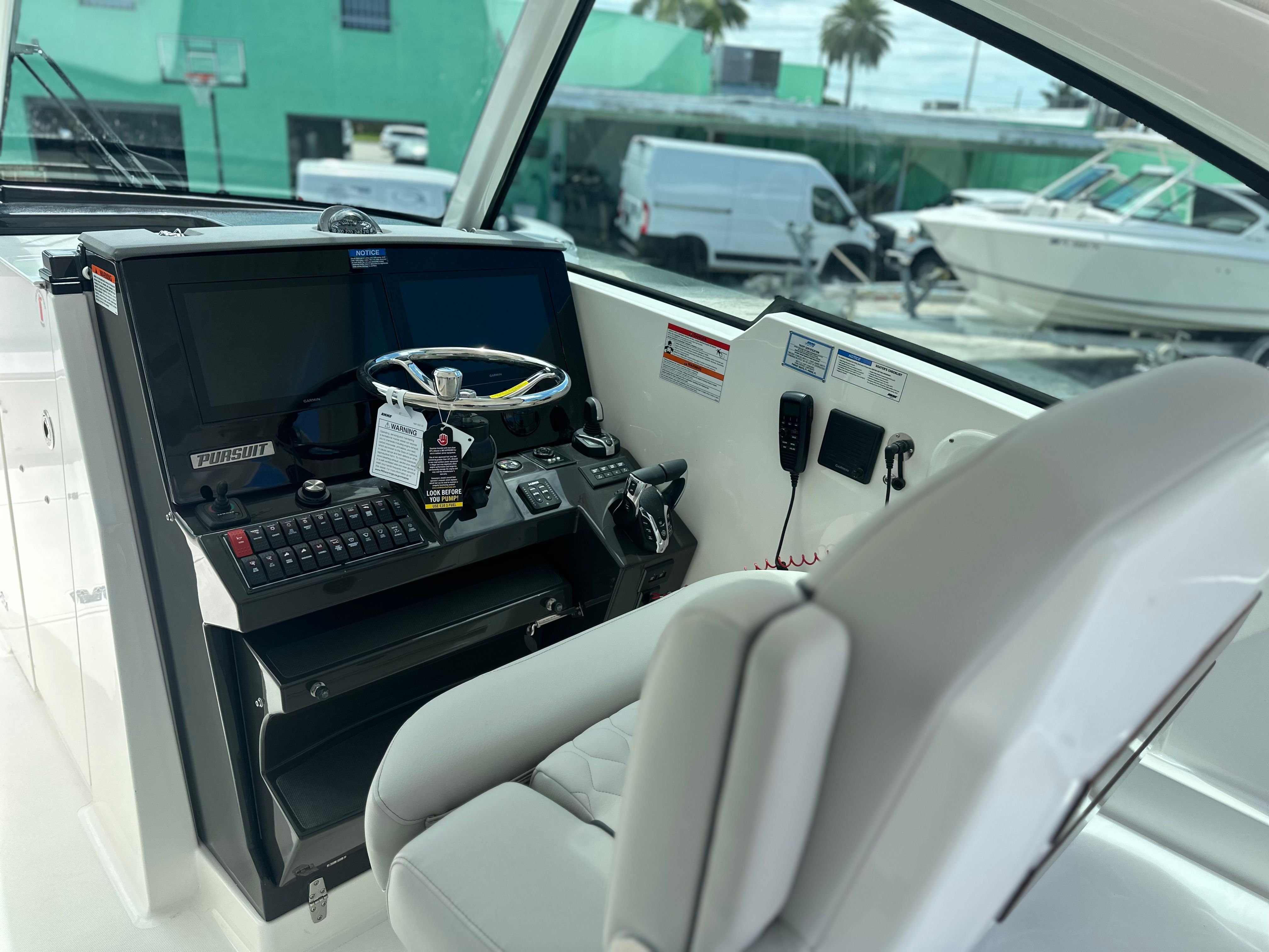 The Pursuit DC 326 is packed with premium features that set it apart from other Dual Console boats for sale. The Platinum Boot Stripe with Platinum Accent adds a touch of elegance to the hull, while the Cadet Gray Bow Tonneau Cover and Cadet Gray Hardtop Aft Curtain provide stylish protection from the elements. The Fwd Med Style Sunshade offers shade and comfort for guests relaxing at the bow, and the Bolt-On Hardtop Rod Holder is perfect for anglers looking to keep their gear organized and accessible.Inside, the Bridgedeck Teak Table with Storage creates a welcoming space for dining and socializing, while the Garmin Widescreen 16" Display Package ensures you have all the navigation and system information you need at your fingertips. The Helm Control Hardtop Mounted LED Spotlight enhances visibility during nighttime excursions, adding an extra layer of safety and convenience. The White Stamoid/Makrolon Side Curtain offers additional protection from wind and spray, ensuring a comfortable ride in varying conditions.