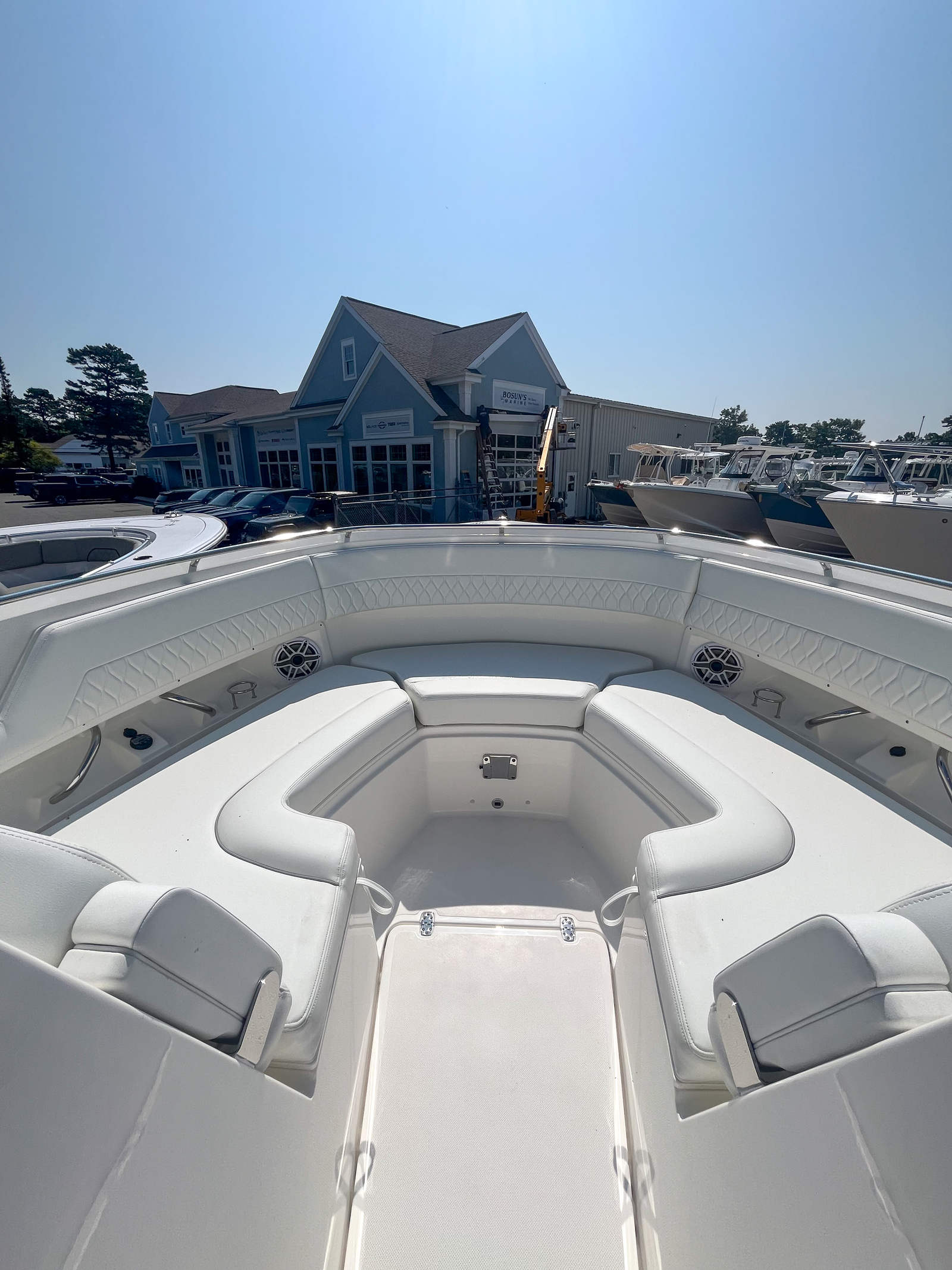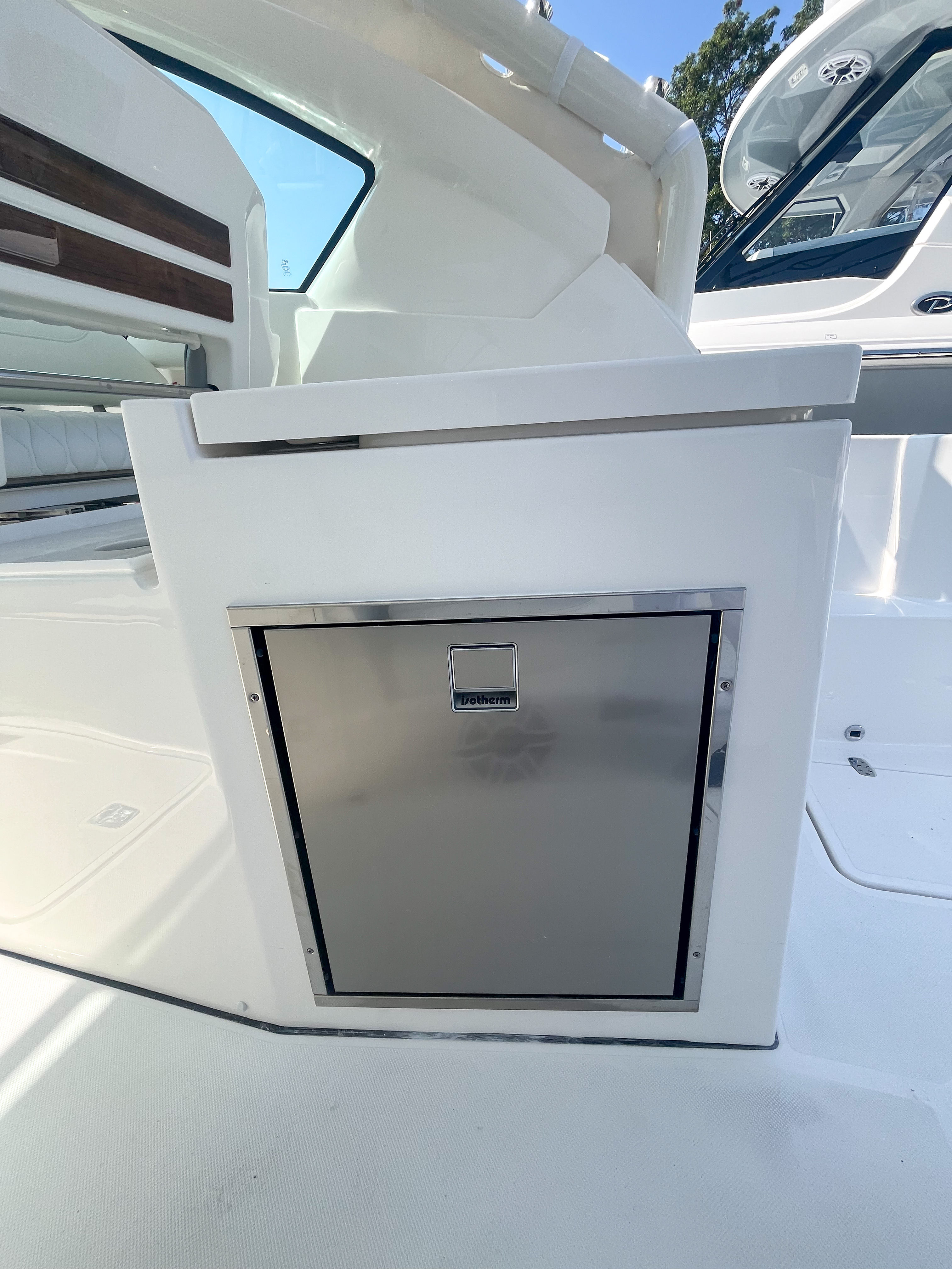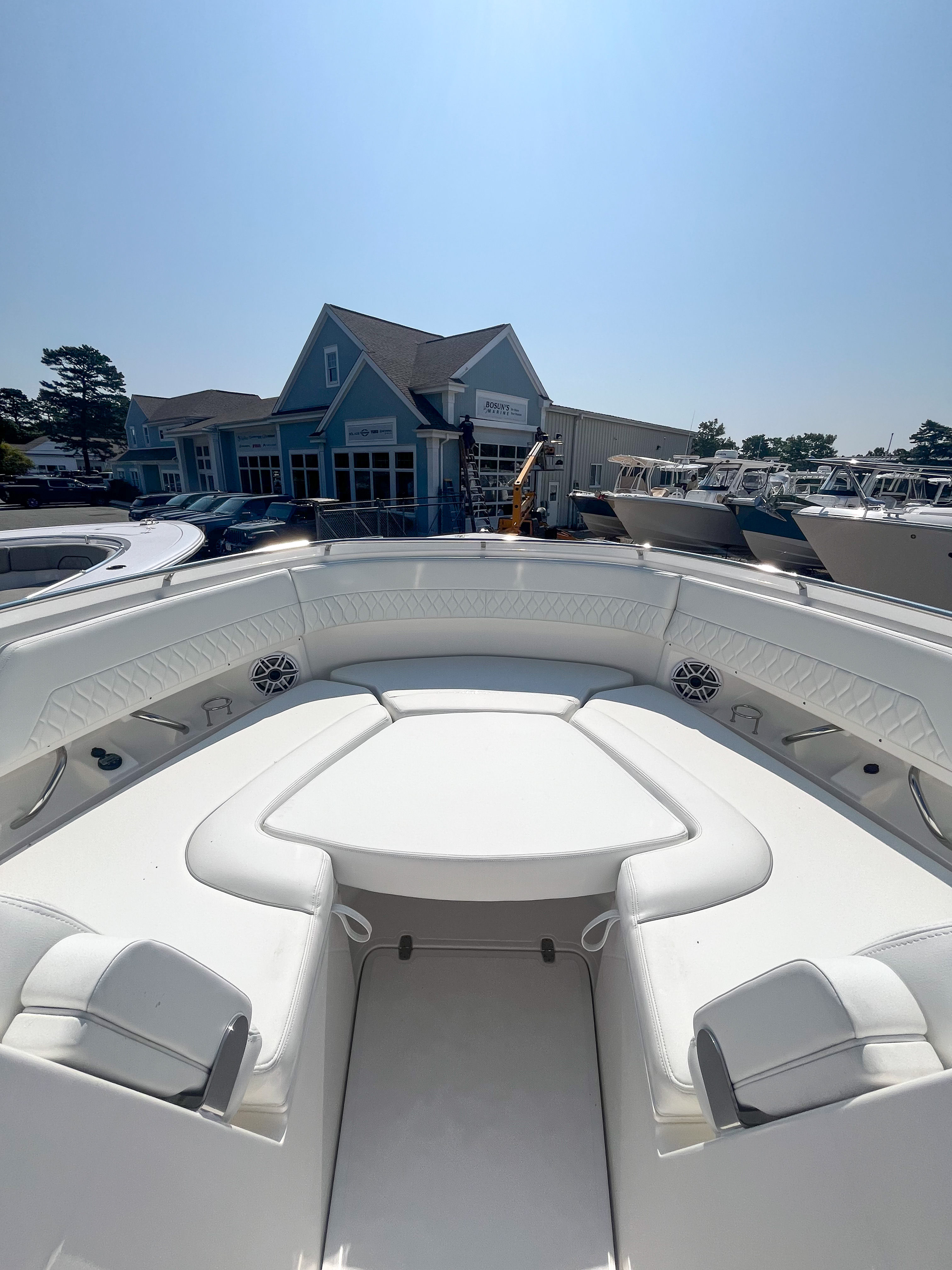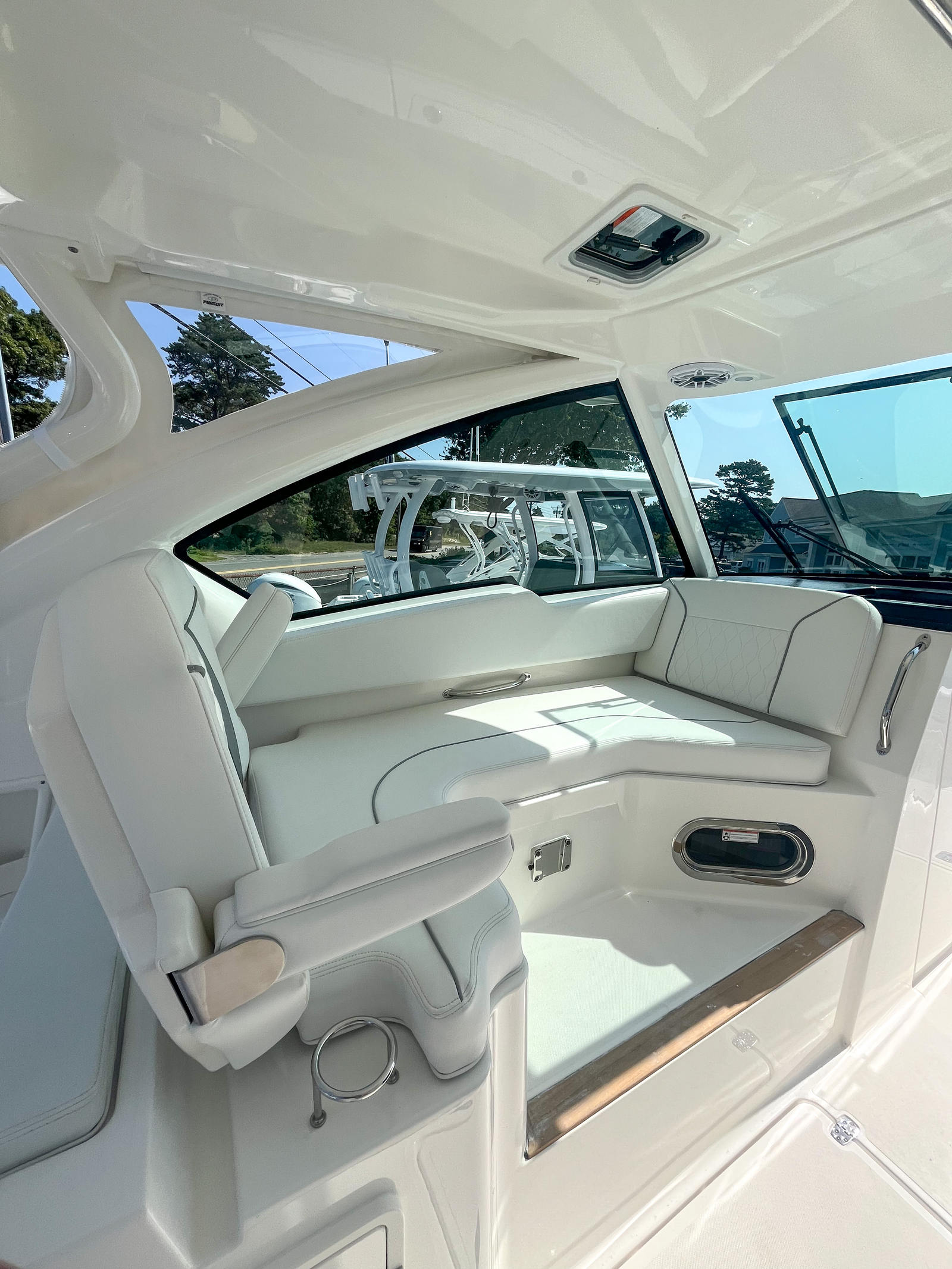 This Pursuit boat for sale is loaded with premium features that enhance both functionality and enjoyment. The Multifunction Display Interface puts navigation and system controls at your fingertips, while the Flag Blue hull and Platinum bootstripe add a touch of elegance to its exterior profile. The helm, also finished in Flag Blue, is ergonomically designed for maximum comfort and visibility. Inside, the Tranquil Sea interior and upgraded white/gray upholstery create a luxurious atmosphere, perfect for relaxing after a day on the water. The Bridge Deck Teak Table with storage offers a convenient space for dining or socializing, while the custom-tuned 8-channel DSP amp and premium M6 Sport speakers with full-spectrum backlighting deliver an immersive audio experience. The Sirius receiver, complete with a three-month subscription, ensures you have access to your favorite music and entertainment while cruising. For added safety and convenience, the ACR RCL-100 LED spotlight with remote control at the helm provides powerful illumination for nighttime navigation. The underwater LED lighting (three Quattro Spectrum units) enhances the boat’s visual appeal and creates a vibrant ambiance for evening gatherings.