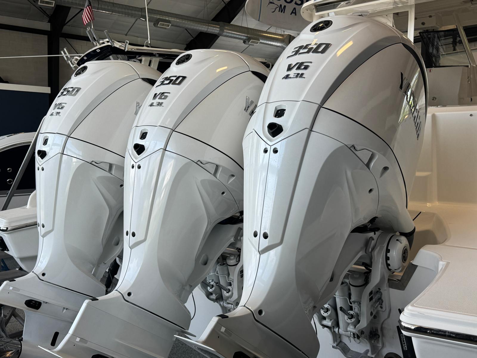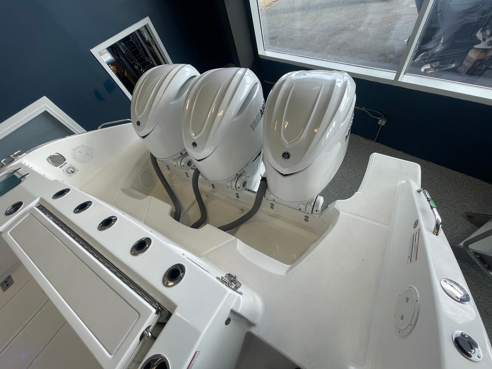 - Triple Yamaha F350 V6 Offshore (Pearlescent White) w/Integrated Digital Electric Steering (DES) and Helm Master EX Digital Electronic Control (DEC), and Yamaha Joystick Contol with Full Maneuverability (Set Point and Autopilot) and Multifunction Display Interface