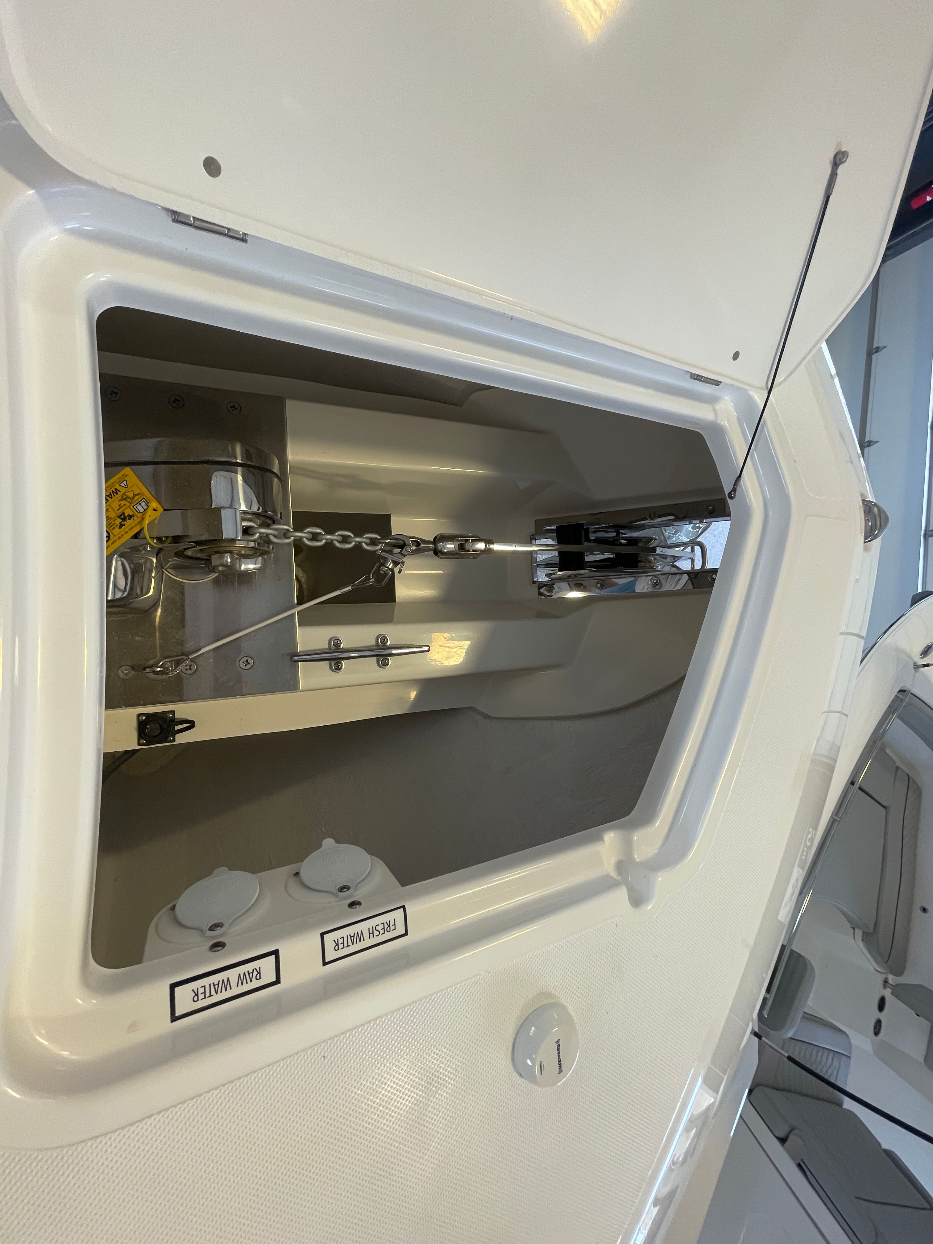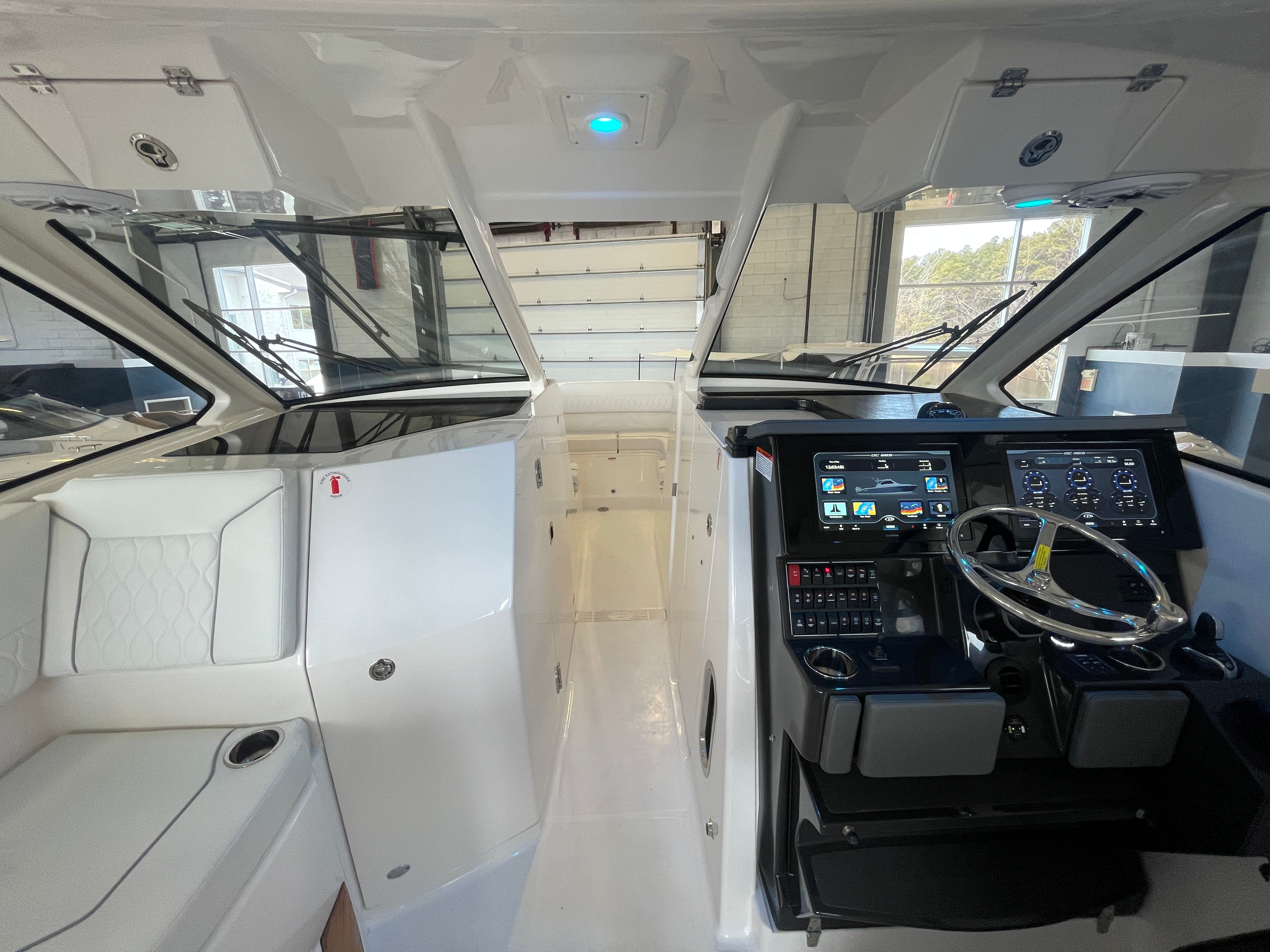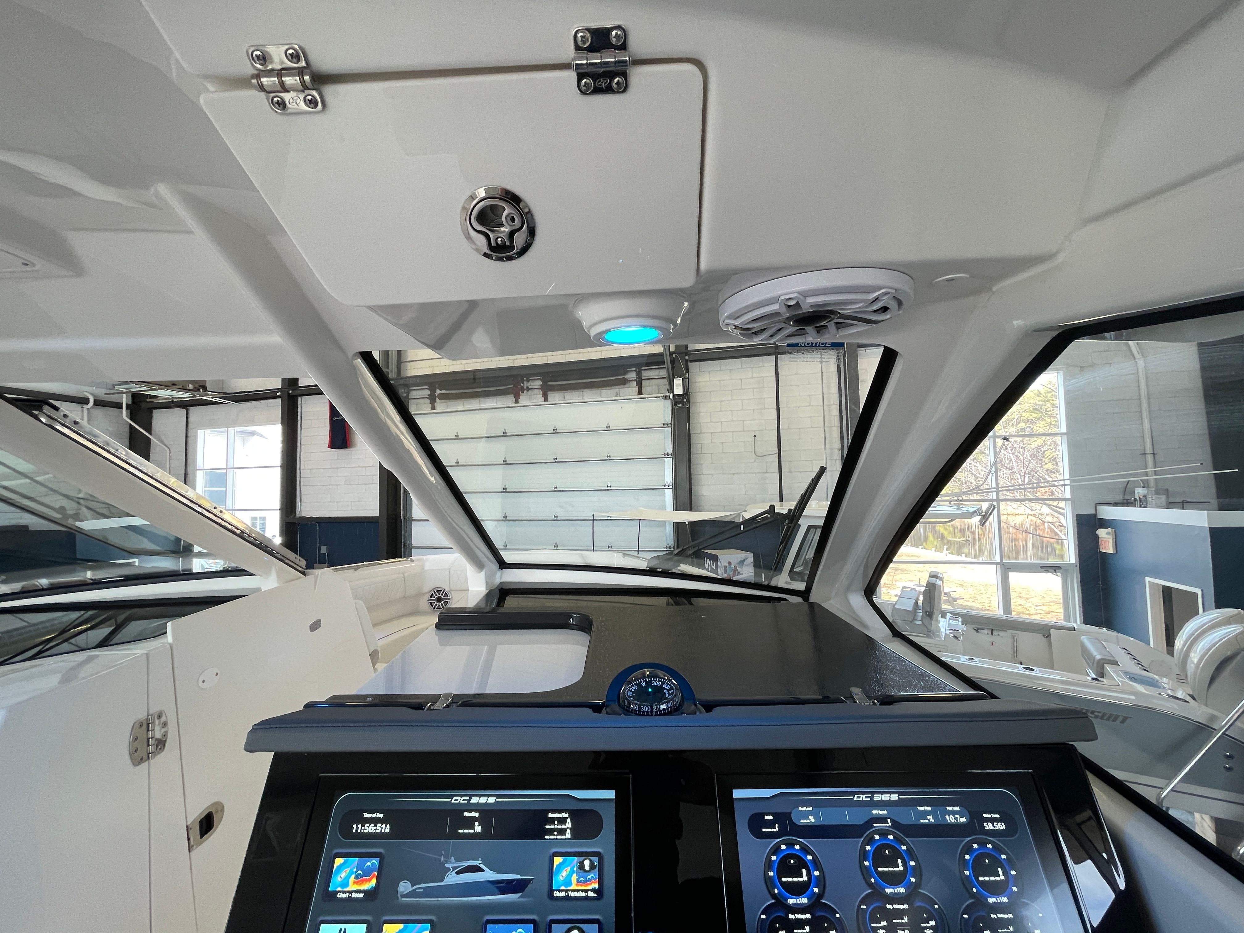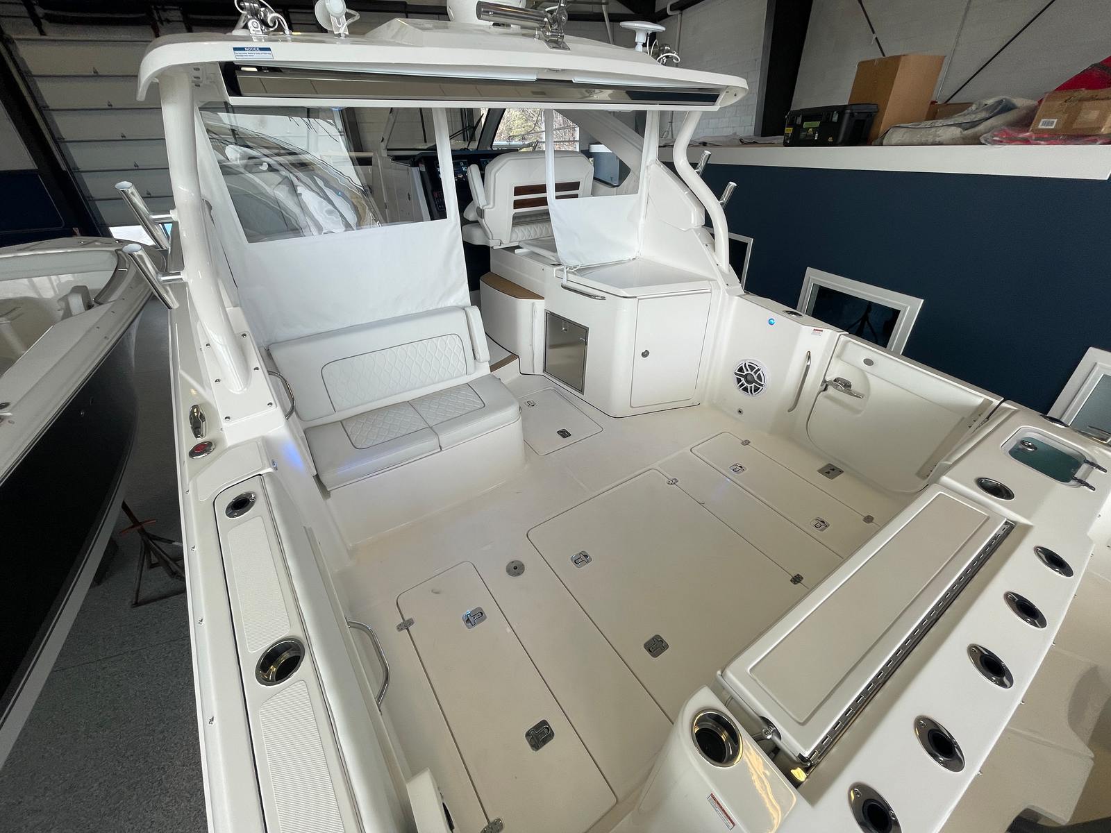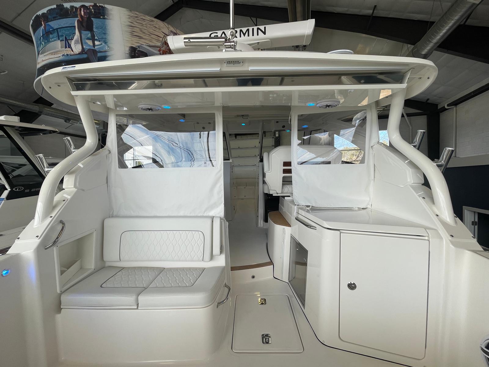The 2026 Pursuit 365 DC is loaded with premium features designed to enhance your boating lifestyle. Enjoy the convenience of a 12v, 2.3 cu. ft. cooler with a chill plate located under the aft-facing seat, perfect for keeping refreshments cold during long days on the water. The 240v/60Hz cockpit air conditioning system with 16,000 BTU ensures you and your guests remain cool and comfortable, even on the hottest summer days. Navigation and control are elevated with a second Garmin widescreen 16" display, providing advanced technology at your fingertips for safer and more enjoyable voyages.For those who appreciate both style and function, the boat features a white aft curtain Stamoid and a matching bow tonneau cover, offering protection from the elements while maintaining a crisp, elegant appearance. The bridgedeck teak table with dedicated storage adds a touch of luxury and provides a perfect setting for onboard dining or socializing. The cadet gray instrument cover protects your helm from the sun and weather, ensuring your controls remain in pristine condition. A custom retractable Makefast sunshade with one-touch operation allows you to easily create shade or bask in the sun as you please. The forward poly table offers additional space for entertaining or relaxing at the bow.