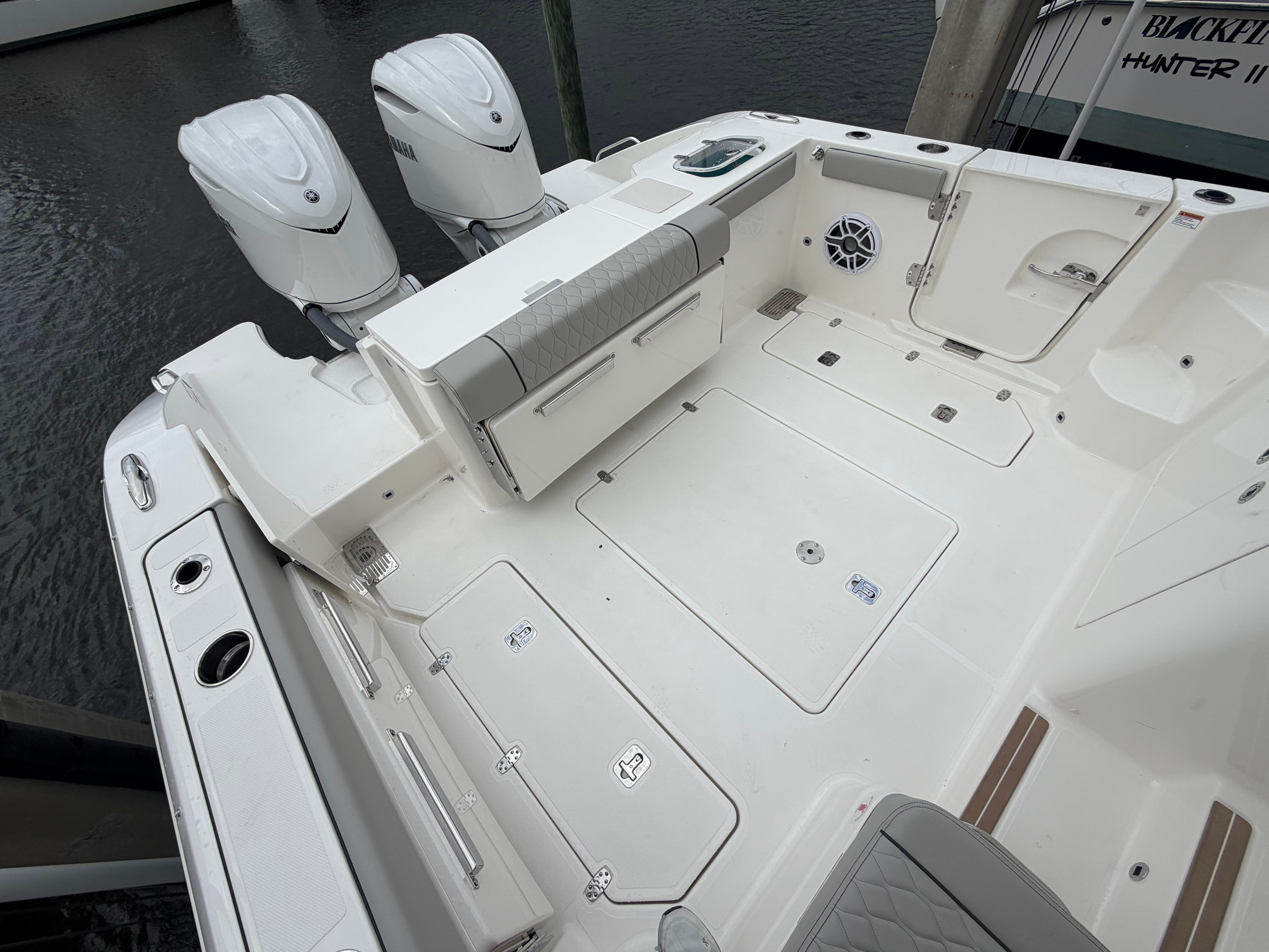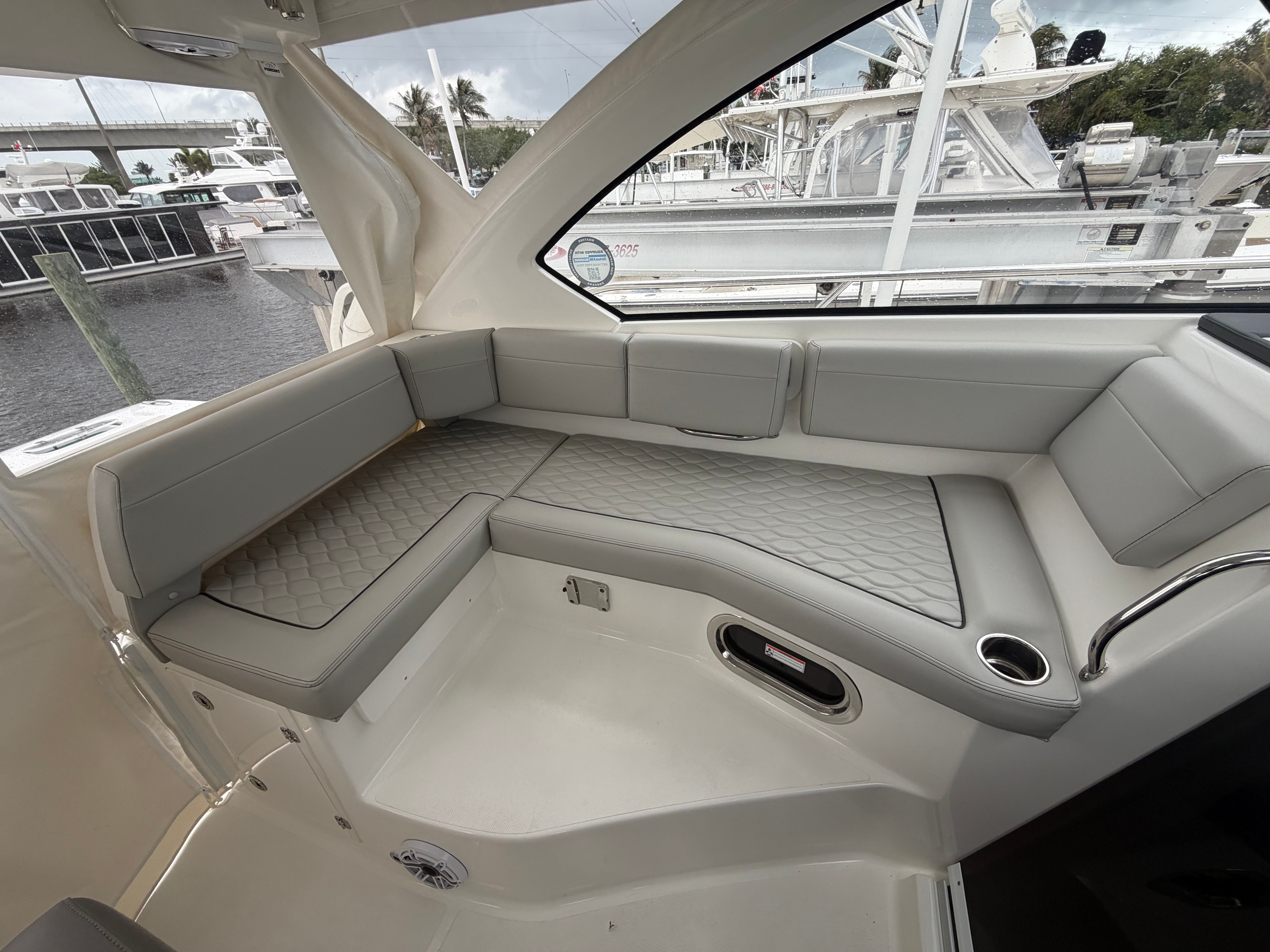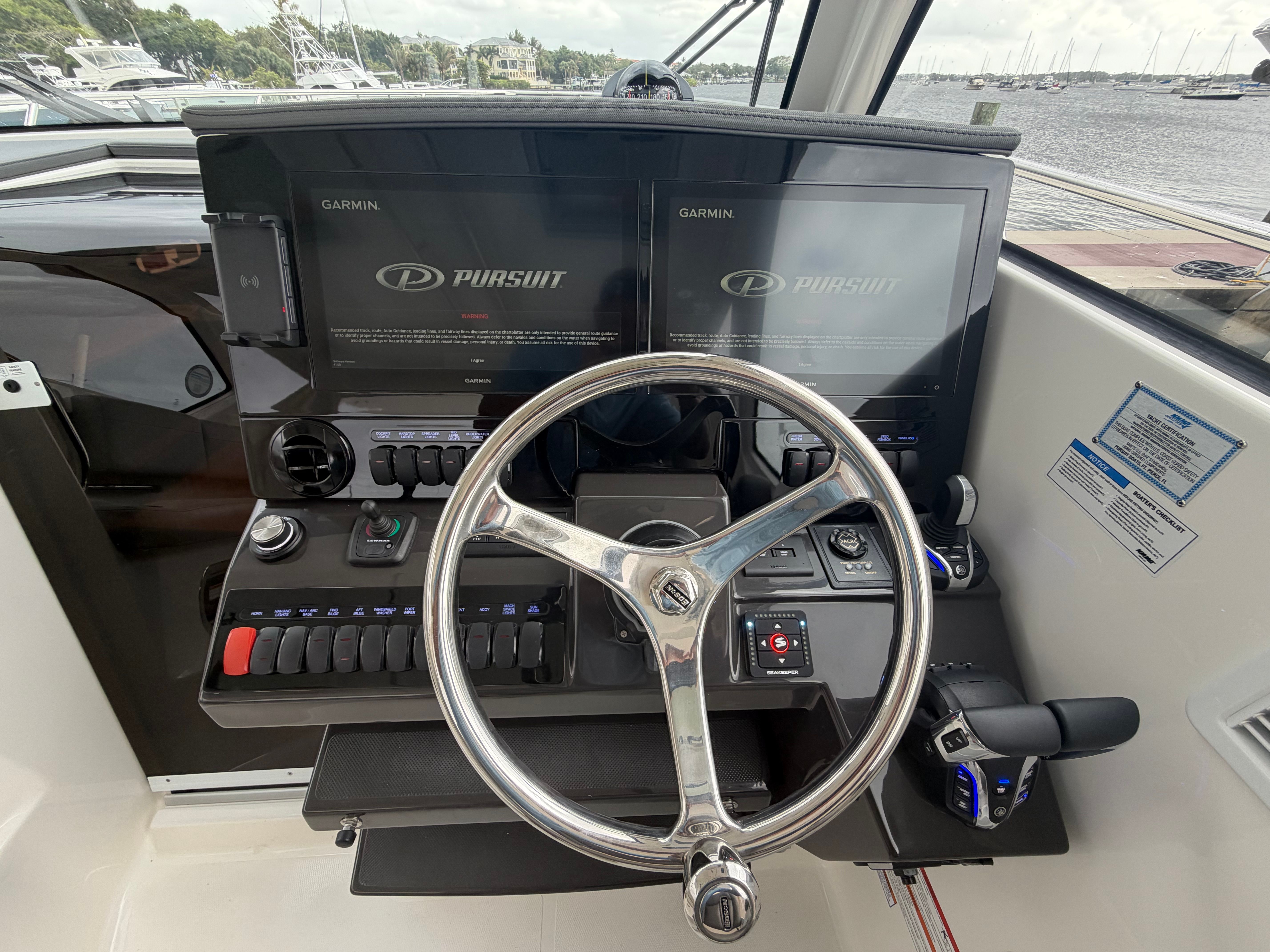 Powering the Pursuit OS 325 are twin Yamaha Pearlescent White F350 engines, delivering a combined 700 horsepower. This dynamic duo ensures exhilarating acceleration, smooth cruising, and reliable performance, whether you are navigating coastal waters or embarking on longer offshore adventures. The advanced Helm Master Full Maneuverability system provides precise control and effortless docking, making every outing stress-free and enjoyable. The Seakeeper Ride Attitude Control System further enhances stability and ride comfort, allowing you to confidently tackle varying sea conditions with ease.