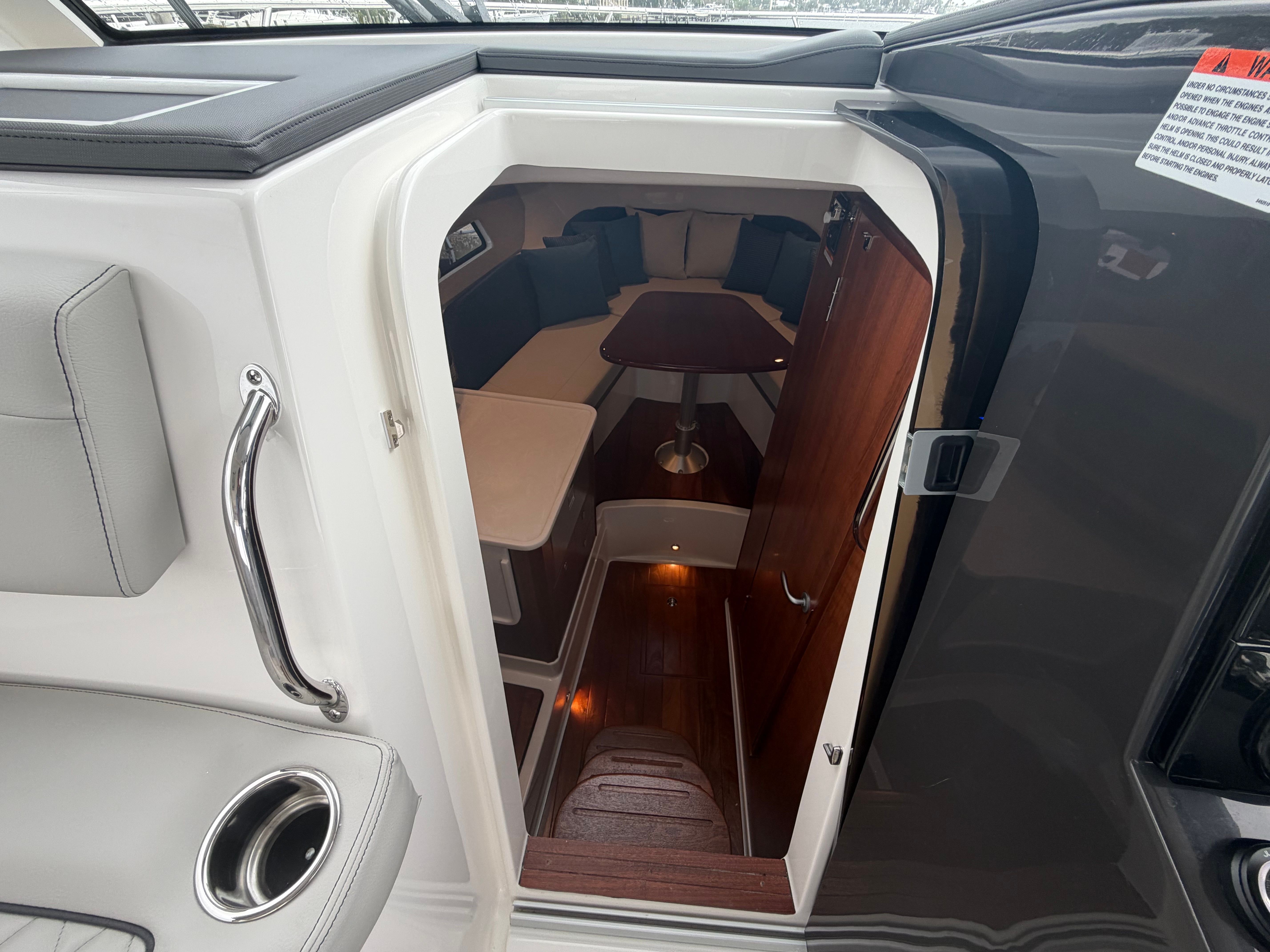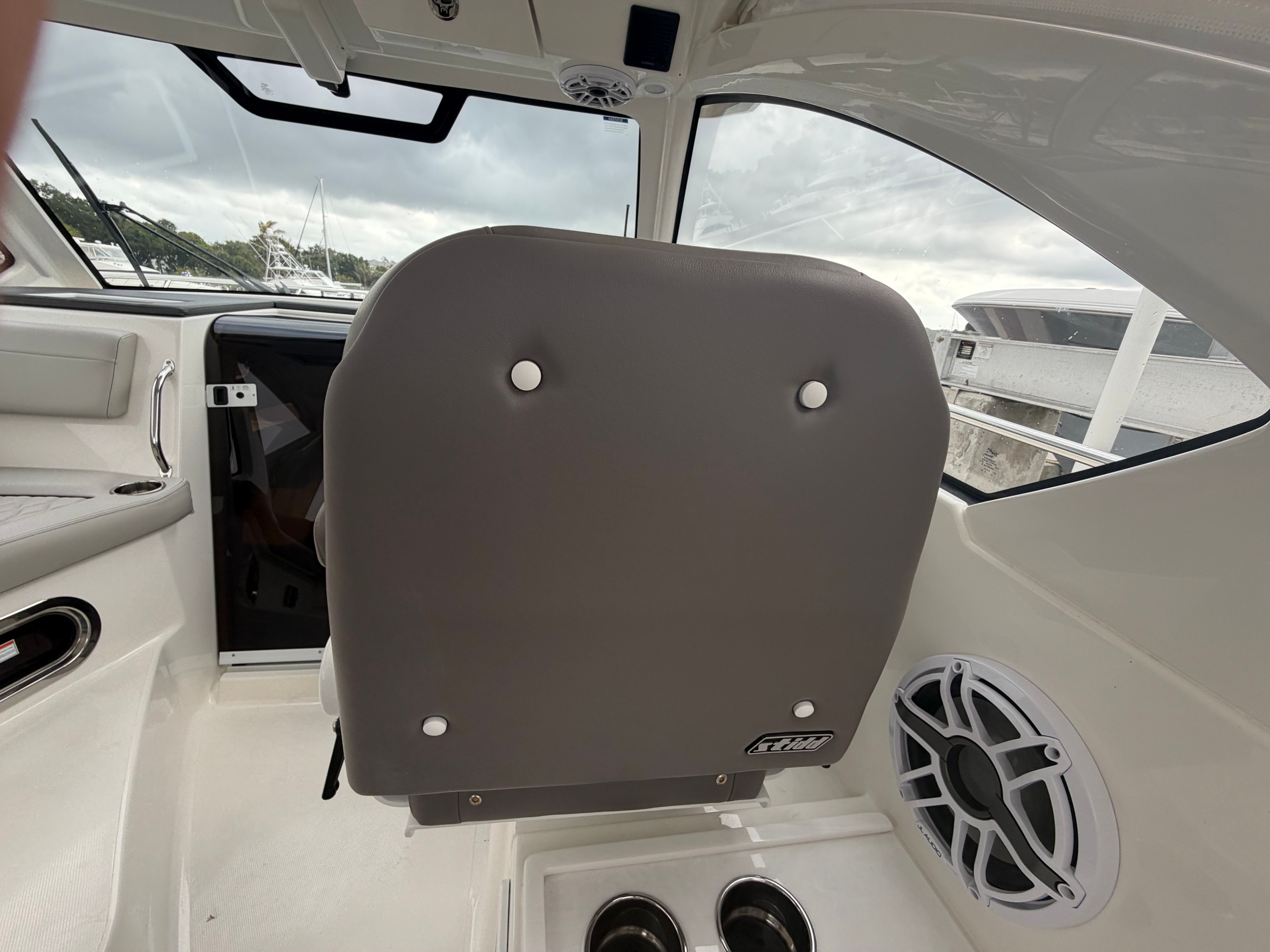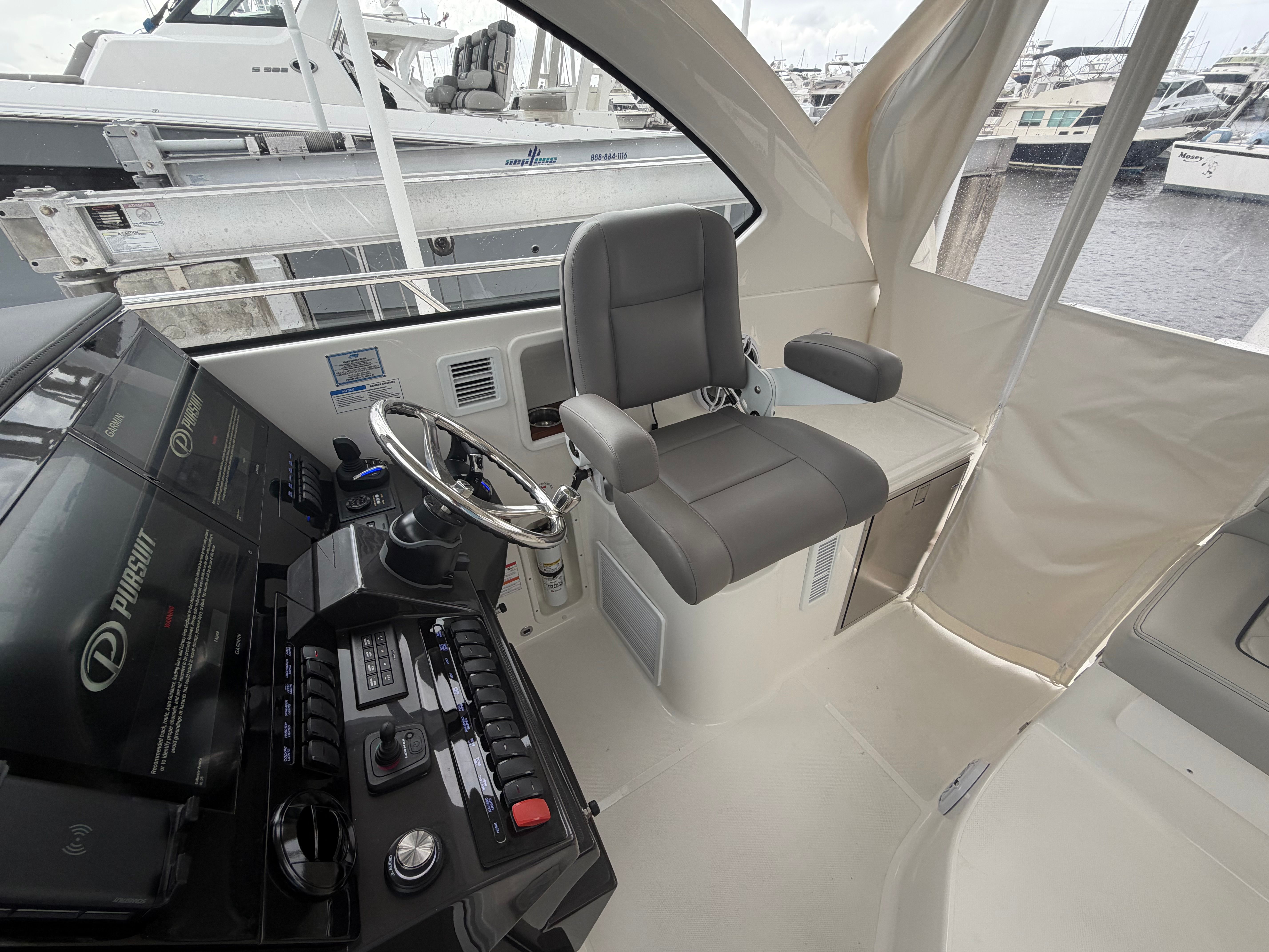This Pursuit OS 325 cruiser boat for sale is loaded with premium features designed to elevate your time on the water. The Neptune Gray hull color, complemented by a black bootstripe with black accent, gives the boat a modern and sophisticated look. The helm and footrest are finished in Carbon, offering a sleek and comfortable command center for the captain. The Tranquil Sea Interior Package creates an inviting and relaxing atmosphere throughout the cabin, making every journey a pleasure.The upgraded Stidd Seat in gray at the helm provides exceptional comfort and support, ensuring the captain enjoys every moment at sea. For extended trips and overnight stays, the diesel genset supplies reliable onboard power, while the cabin air conditioning system keeps the interior cool and comfortable, no matter the weather outside.