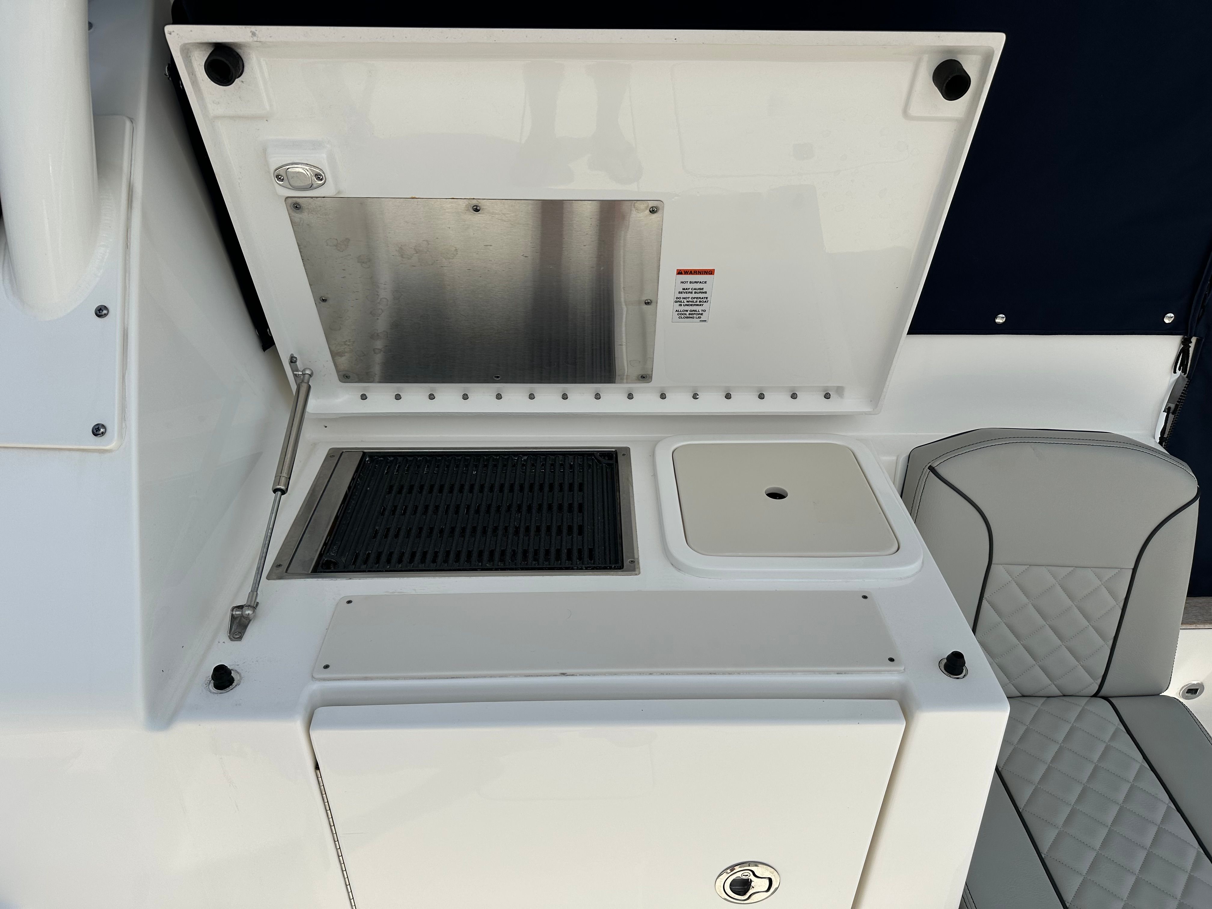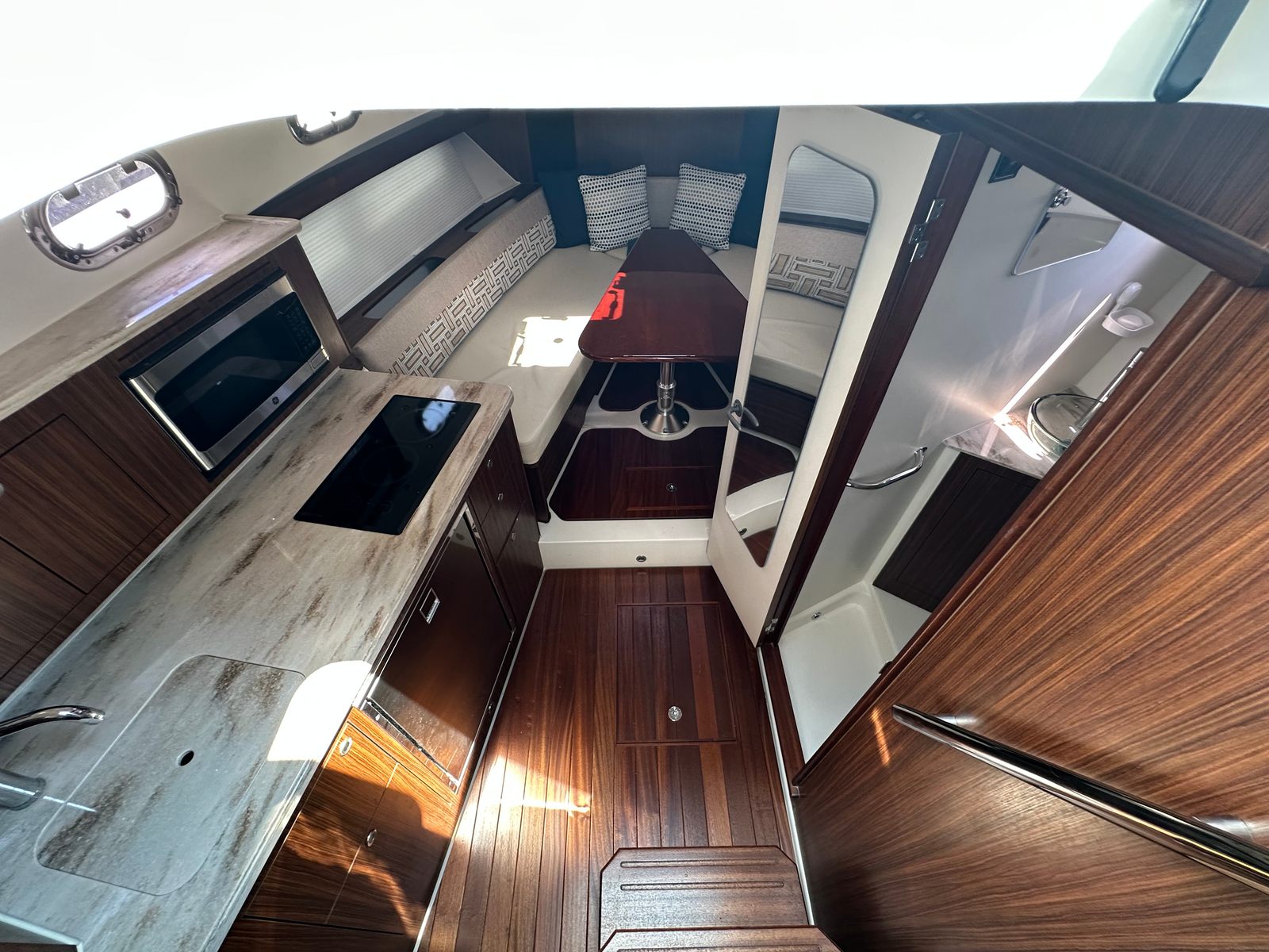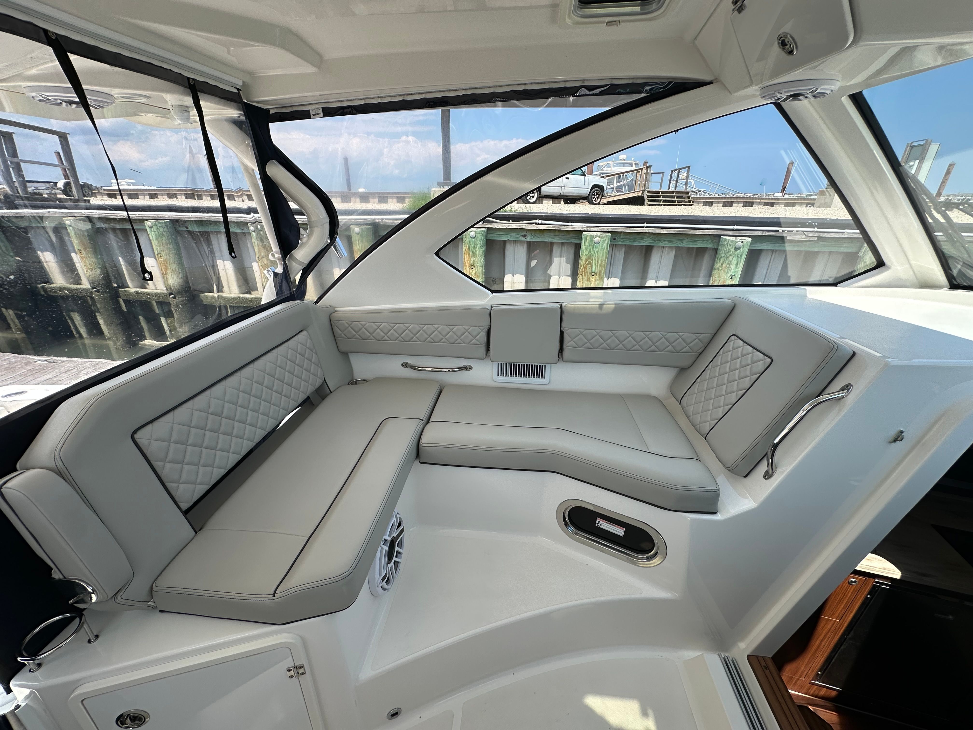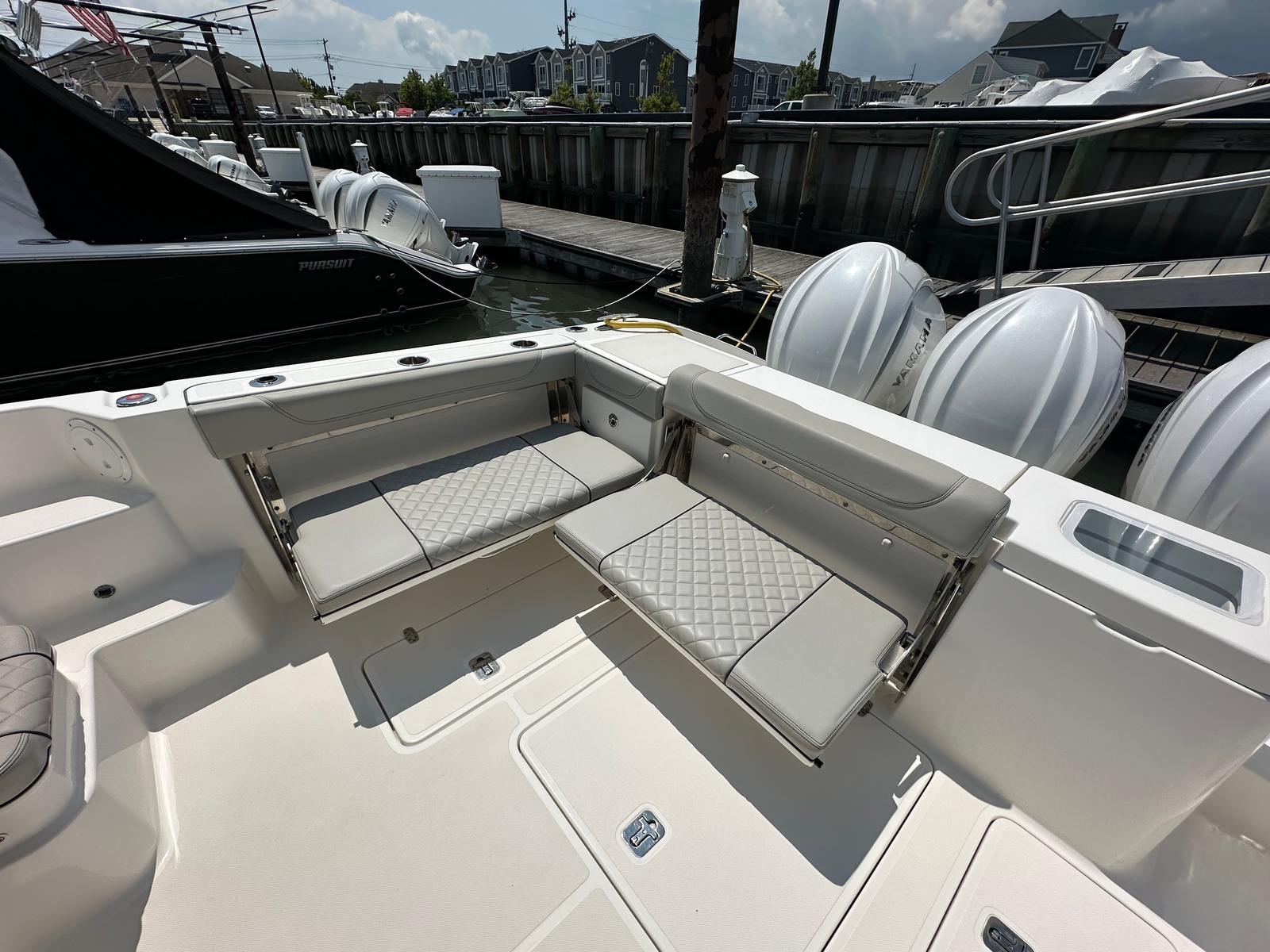 The Pursuit 355 OS is designed with both luxury and functionality in mind. Its spacious layout provides plenty of room for guests, making it ideal for social gatherings and extended trips. The cruiser’s thoughtful design maximizes comfort, with well-appointed seating areas and ample deck space for sunbathing, dining, or simply enjoying the view. The helm station is ergonomically designed for ease of use, offering excellent visibility and intuitive controls for a stress-free boating experience. Every detail of this Pursuit boat for sale reflects the brand’s commitment to quality craftsmanship and innovative design.