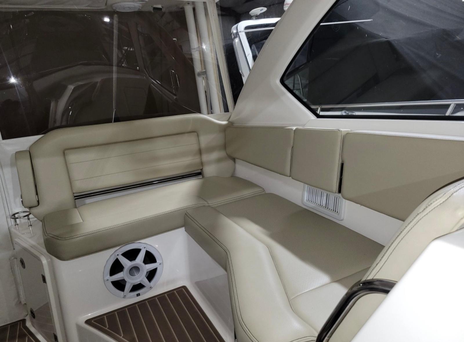 Beyond its luxurious features, the Pursuit 355 OS excels in practicality. The ample storage options allow you to keep your gear organized and easily accessible, whether you’re packing for a day trip or an extended voyage. The cockpit cover and drop curtain offer protection from sun and rain, helping to maintain the boat’s condition and ensuring comfort for all aboard. Docking and maneuvering are made easier thanks to the responsive twin engines and advanced controls, giving you confidence in tight spaces and busy marinas. The battery charger ensures your onboard systems remain operational, while the Sea Deck carpet provides a non-slip surface that’s both comfortable and safe. The inclusion of a cockpit grill and wet bar means you can enjoy gourmet meals and refreshing beverages without ever leaving the water, enhancing the overall boating experience.