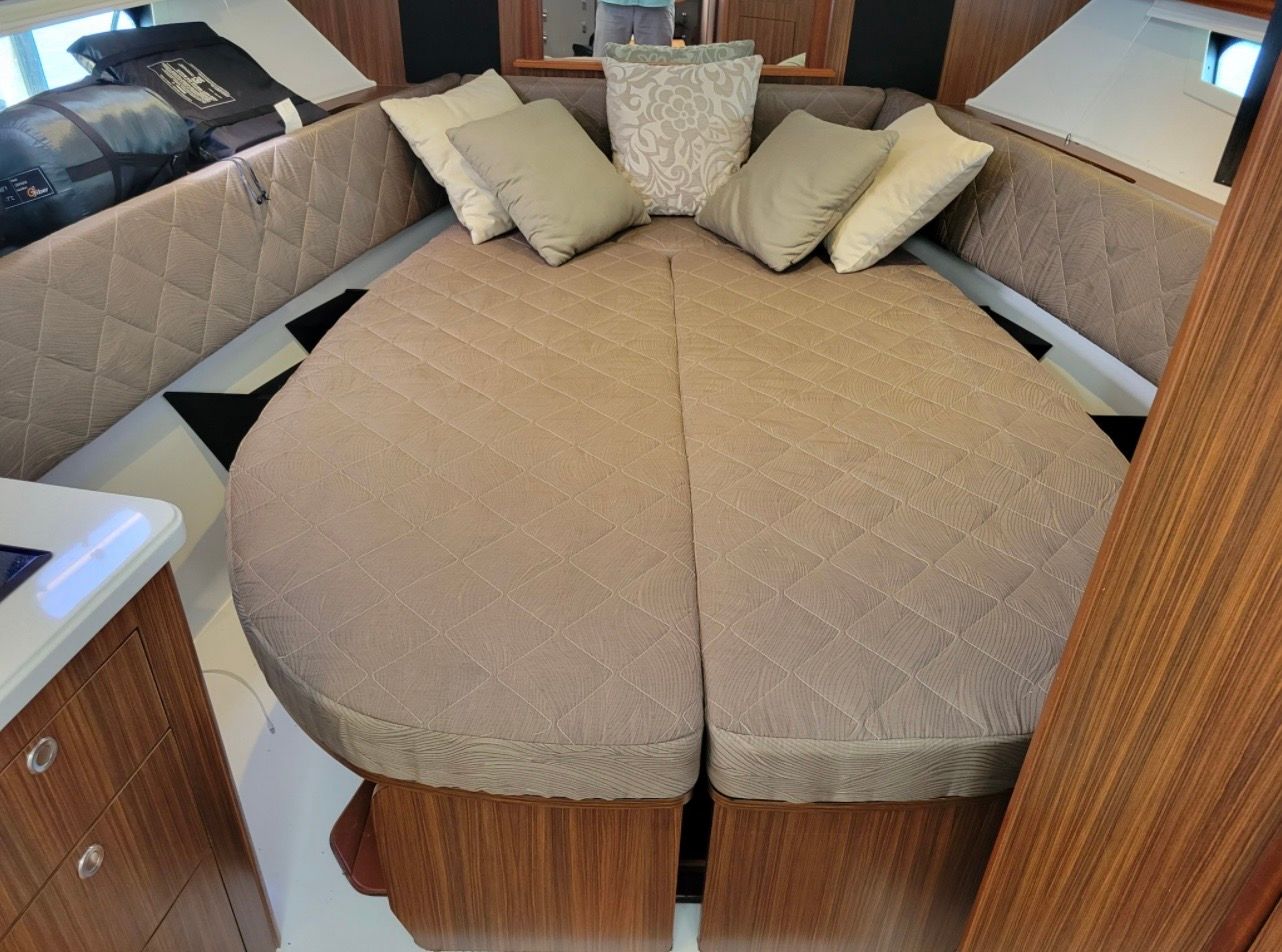 Step aboard the Pursuit 355 OS and you’ll immediately notice the attention to detail in its features and specifications. The aft bench seat provides a comfortable spot for guests to relax and take in the views, while the aft drop curtain offers protection from the elements, ensuring your outings remain enjoyable regardless of the weather. The cockpit is a true highlight, featuring a Sea Deck carpet that adds both style and comfort underfoot. The cockpit cover keeps your boat protected when not in use, preserving its pristine condition. For those who love to entertain, the cockpit grill is perfect for preparing delicious meals on the water, and the cockpit wet bar makes serving drinks a breeze. Ample cockpit storage ensures you have plenty of space to stow gear and supplies, keeping the deck clutter-free. The elegant cabinetry adds a touch of luxury to the interior, providing both functionality and aesthetic appeal. With a battery charger included, you can rest assured that your electronics and systems will remain powered throughout your adventures.