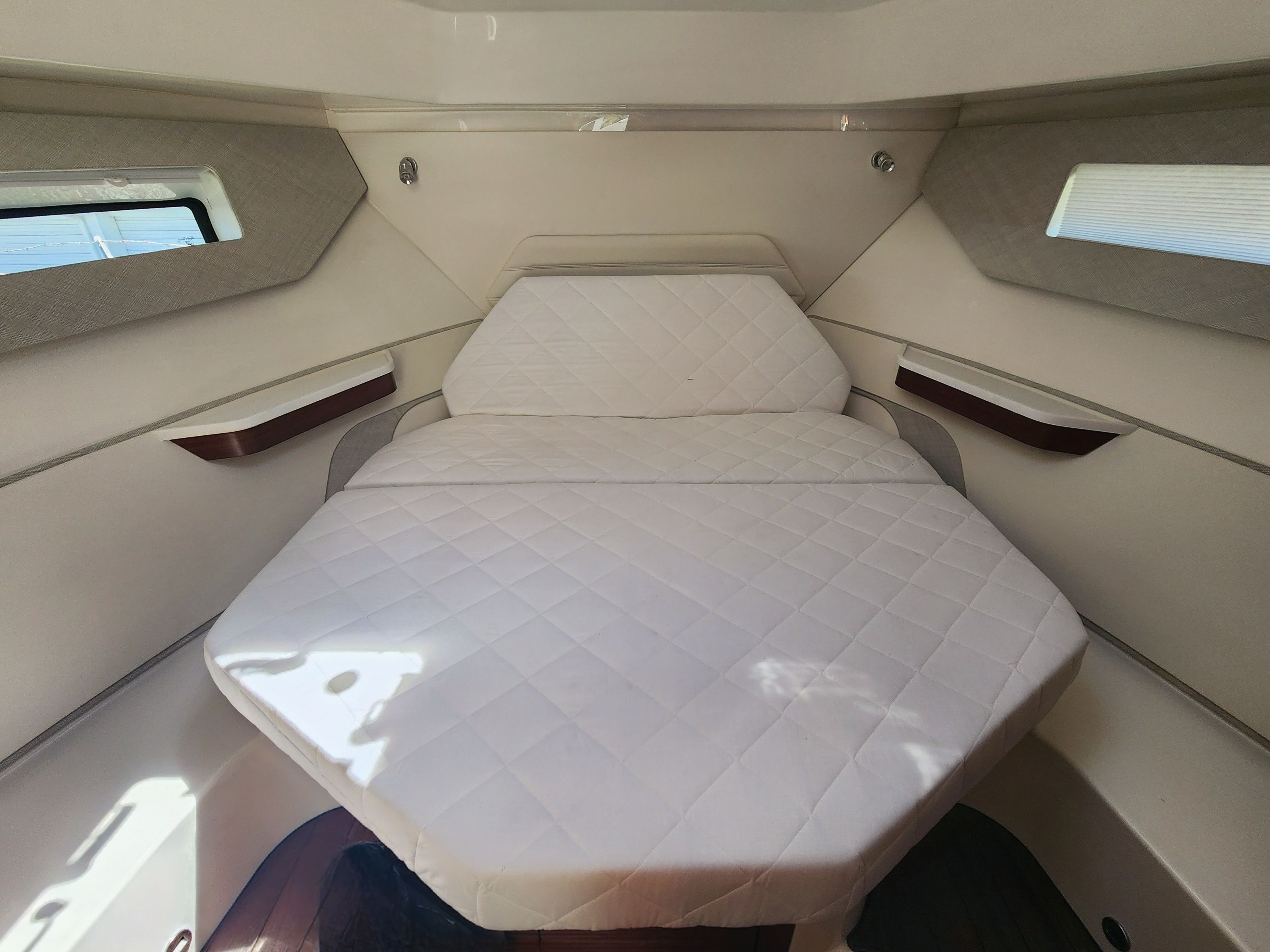 The Pursuit OS 405 is as practical as it is luxurious. Its 43-foot length provides ample storage for gear, water toys, and provisions, making it ideal for extended trips or spontaneous outings. The intuitive helm layout, enhanced by dual Garmin widescreen displays, simplifies navigation and monitoring, allowing you to focus on enjoying your time on the water. Docking and maneuvering are made easier with the responsive triple-engine configuration, giving you confidence in tight spaces and busy marinas. The protective Stamoid curtains and sunpad cover help safeguard your investment and keep the boat looking pristine, season after season.