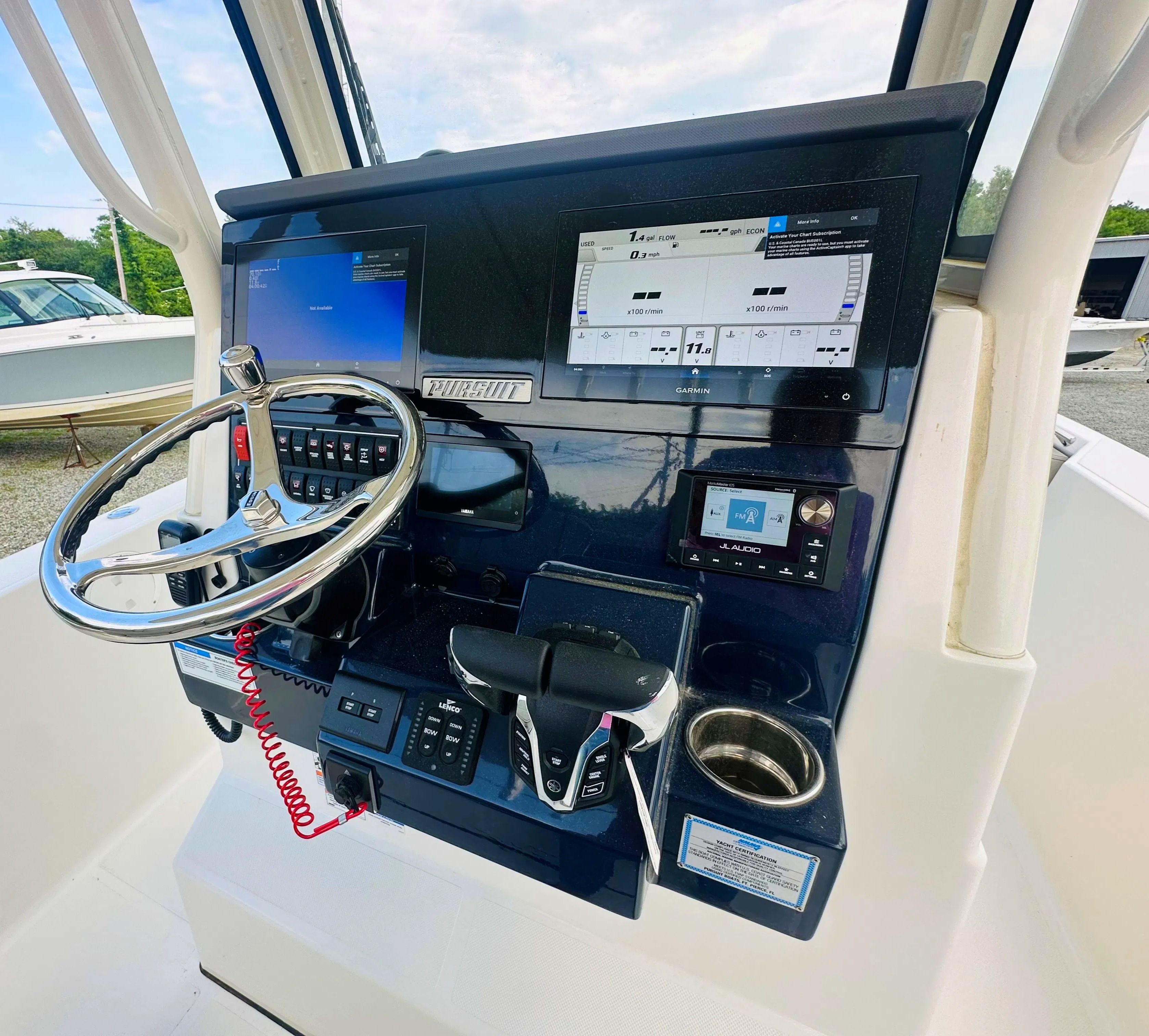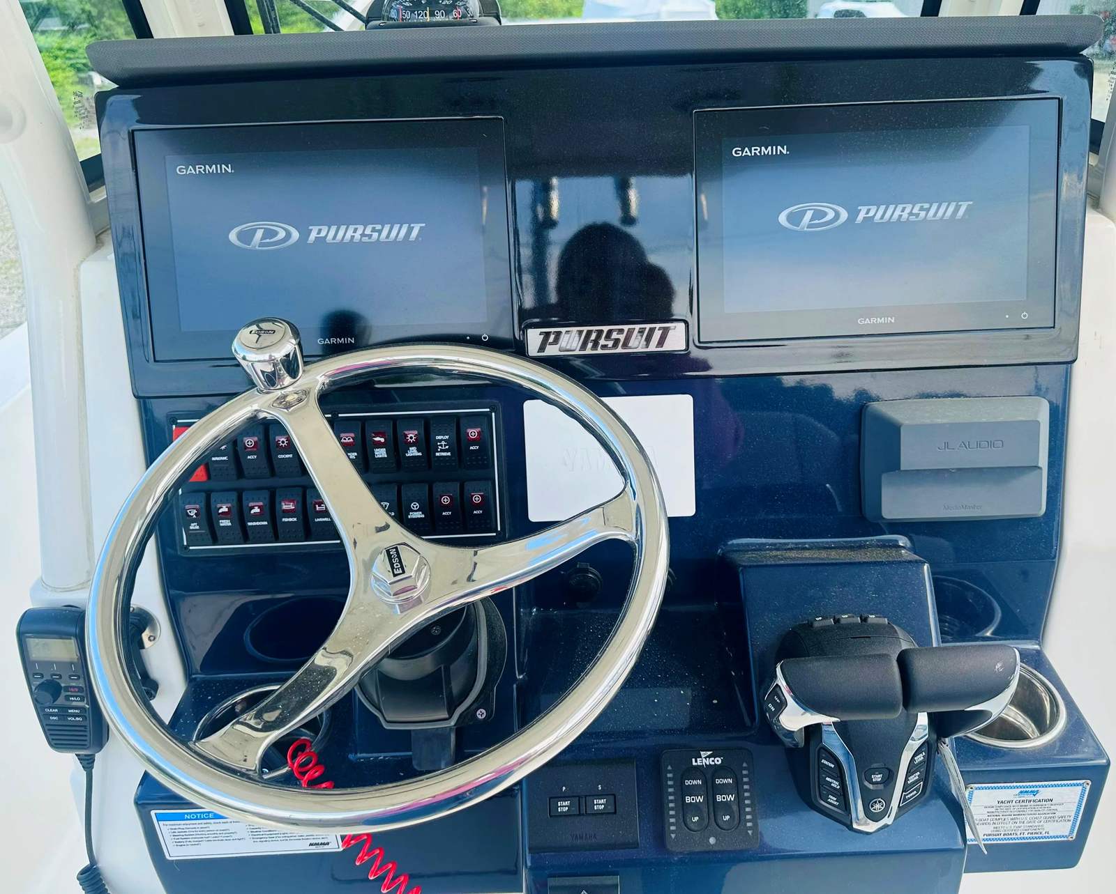 - Garmin Electronics Package (GPSMAP 8612XSV, Airmar B75M 20 Degree 600 watt CHIRP Transducer, NMEA 2000 Starter kit, Pursuit Custom Dash Panel, VHF Radio)