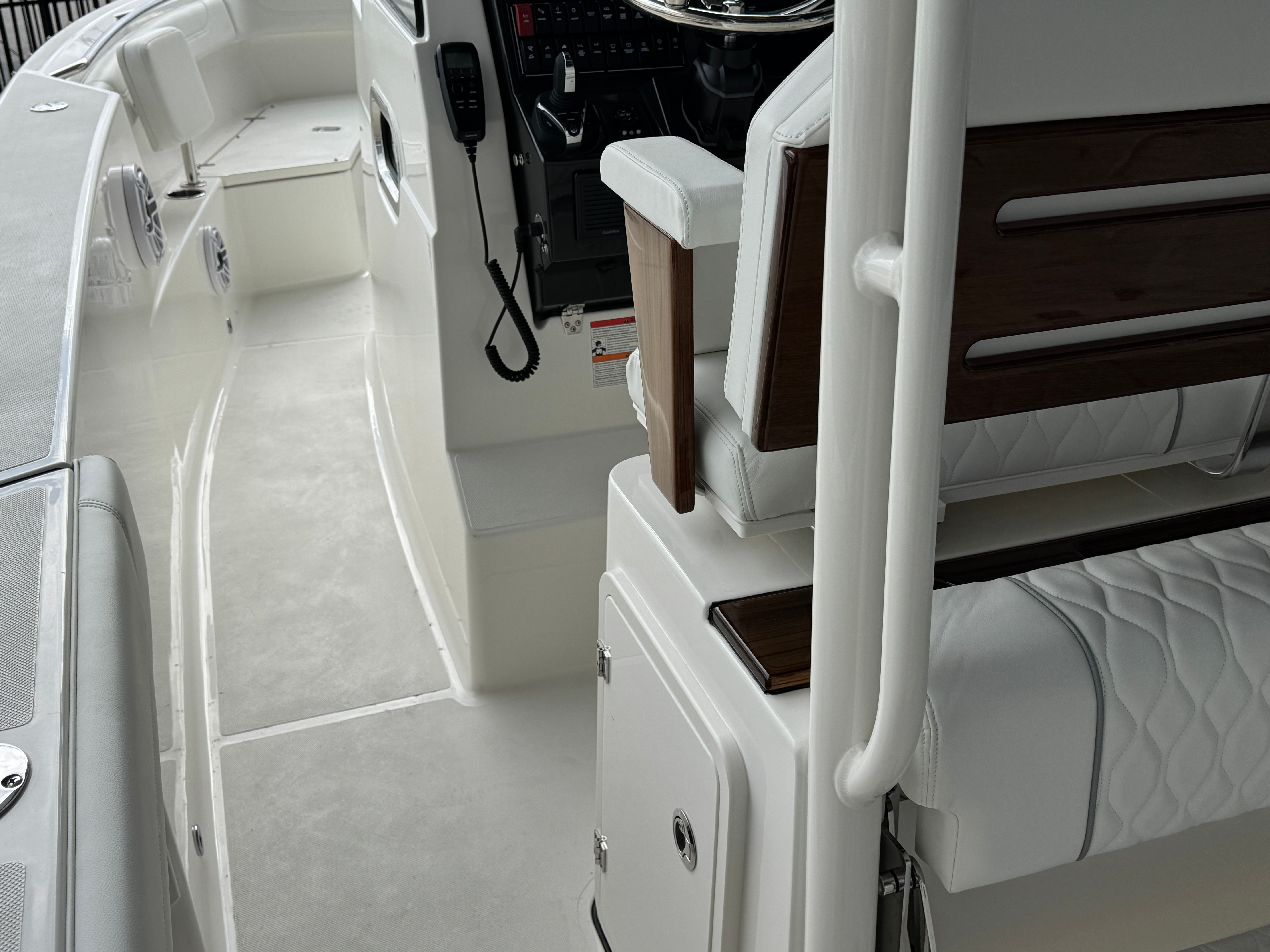 This Pursuit boat for sale is loaded with premium features that enhance both functionality and comfort. The hull, bootstripe, helm, and hardtop underside are finished in Carbon, creating a modern and sophisticated aesthetic. The hardtop is equipped with six mounted rod holders, perfect for anglers who want to keep their gear organized and accessible. The Bow/Cockpit Table, crafted from fiberglass and featuring dedicated storage, provides a versatile space for dining, socializing, or preparing gear. For those sunny days on the water, the Bow Mediterranean Style Sunshade is stowable, offering shade and comfort when you need it most. Dockside Power (110V/60Hz 30 AMP) with cord ensures you have reliable access to electricity for all your onboard needs.