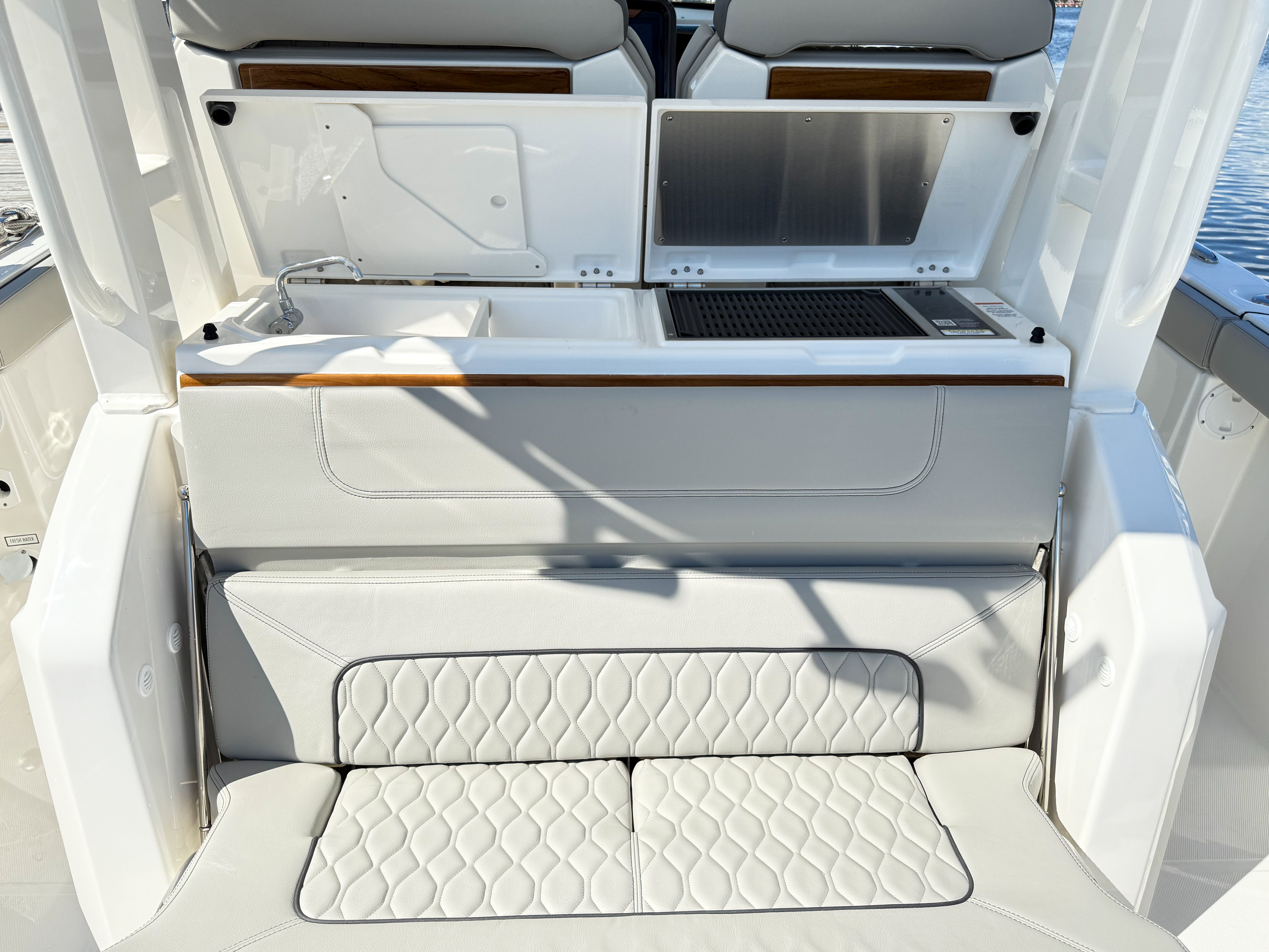 At the heart of the Pursuit S 328 are twin Yamaha F350 engines, finished in a striking pearlescent white. Together, these engines deliver a combined 700 horsepower, providing the muscle you need for swift acceleration, smooth cruising, and confident handling in a variety of conditions. The Yamaha Joystick Control system offers intuitive maneuverability, making docking and tight turns effortless, even for less experienced captains. With this powerful and responsive setup, the S 328 is ready to tackle offshore runs, coastal cruising, or quick trips to your favorite sandbar.