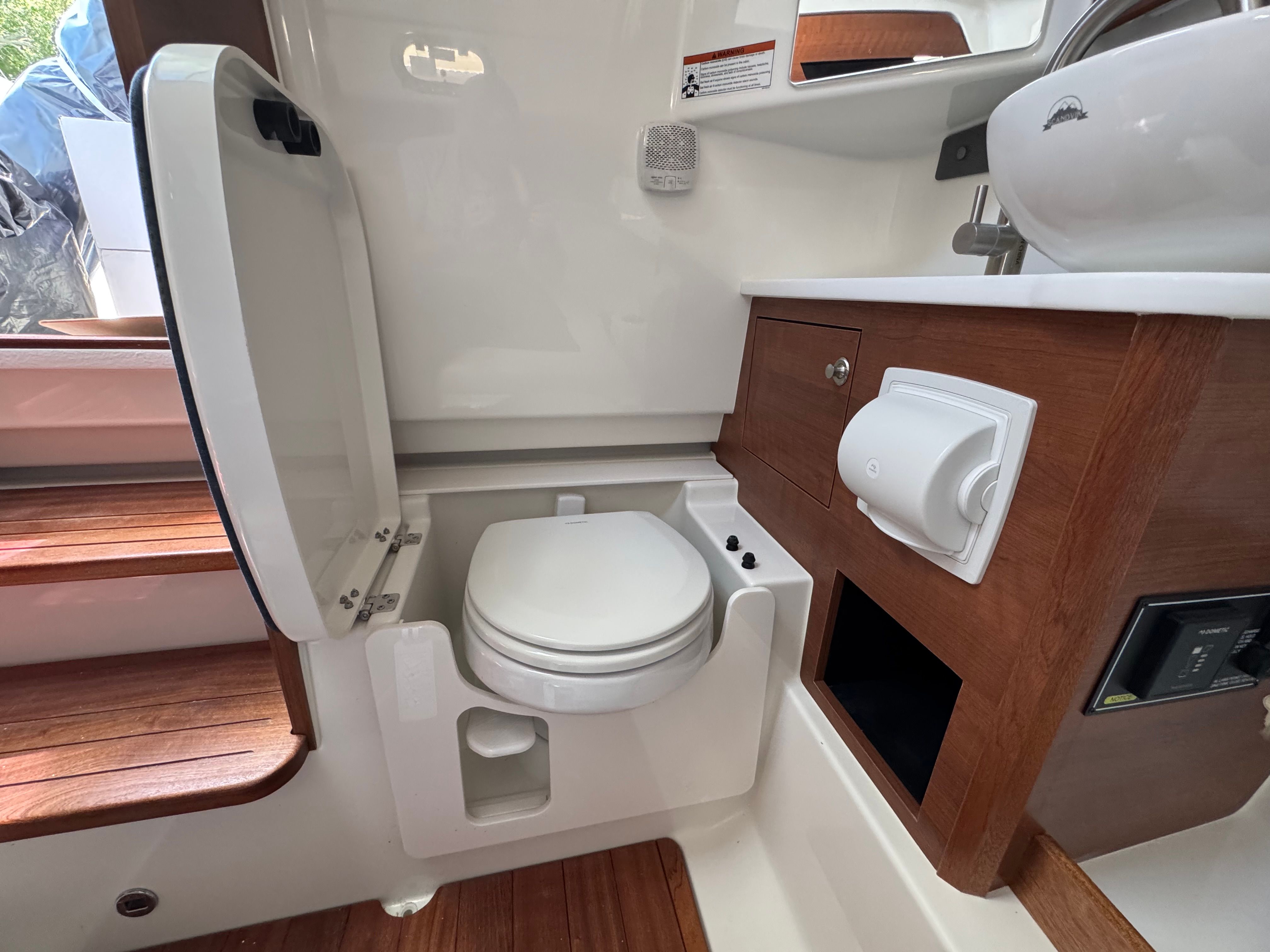 - Helm - Premium Upgrade: Edson Solid Teak Steering Wheel with Power Knob, Leather-Wrapped Dash Pad (Black), Synthetic Teak Flooring on Helm Footrest Treads and Teak Accents on Dash Storage Pockets and Entertainment Center