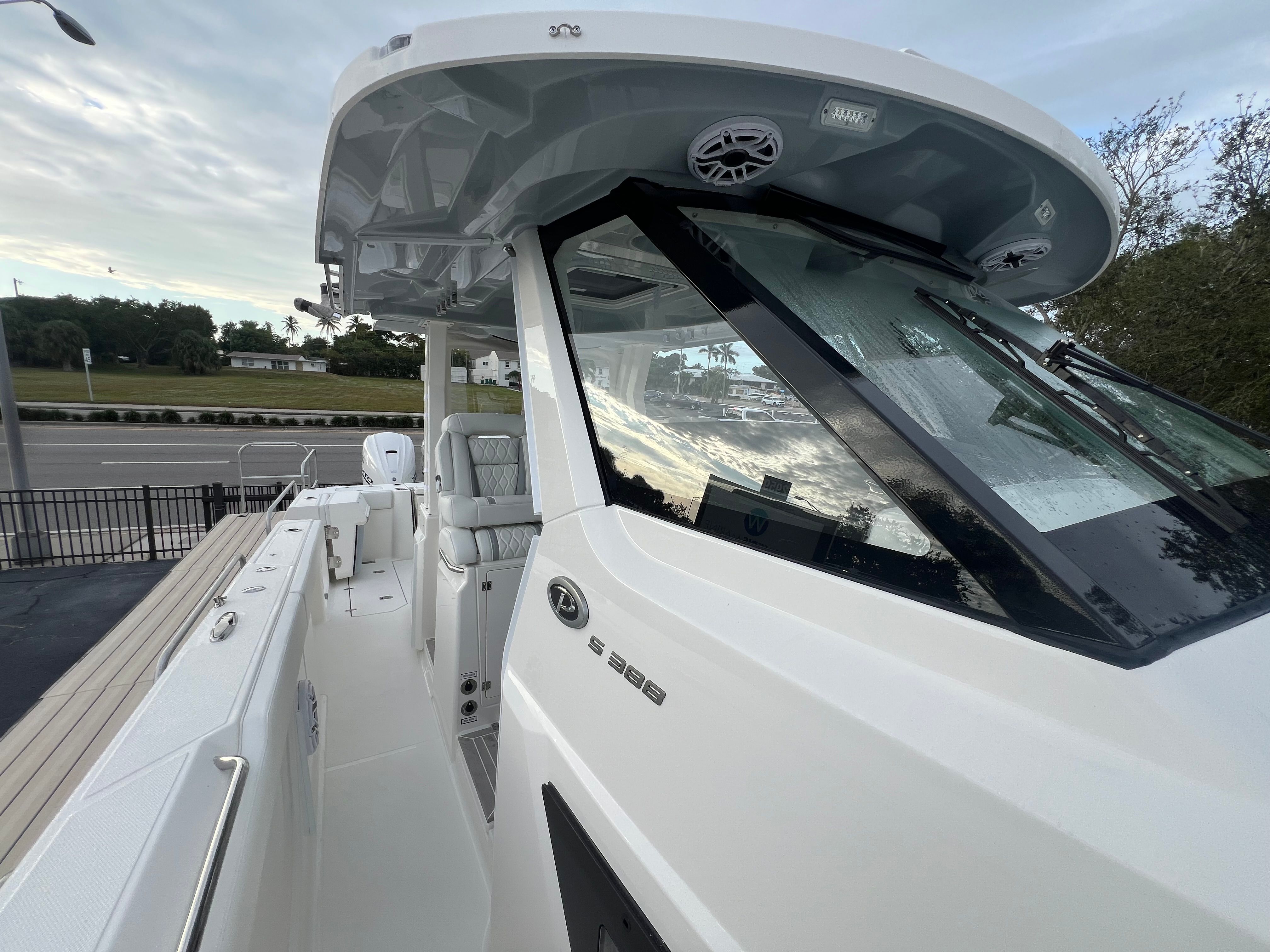 The Pursuit S 388 is packed with premium features designed to elevate your boating experience. The hardtop is equipped with corner-mounted rod holders (six in total) and two kingfish rod holders, making it an angler’s dream for organizing gear and maximizing fishing opportunities. The custom hardtop also features an integrated electric retractable sunshade, allowing you to effortlessly adjust your level of comfort and protection from the sun. For those seeking relaxation, the bow Mediterranean style sunshade is stowable, providing flexible options for lounging in the shade or soaking up the sun.Comfort is further enhanced by the 240v/60Hz cockpit air conditioning system with a windshield defogger vent (16,000 BTU), ensuring a cool and pleasant environment even on the hottest days. The helm’s Carbon color and the inviting Coastal Sunrise interior fabric create a refined and welcoming space for both captain and guests. Every detail has been thoughtfully designed to provide a seamless blend of functionality and luxury.