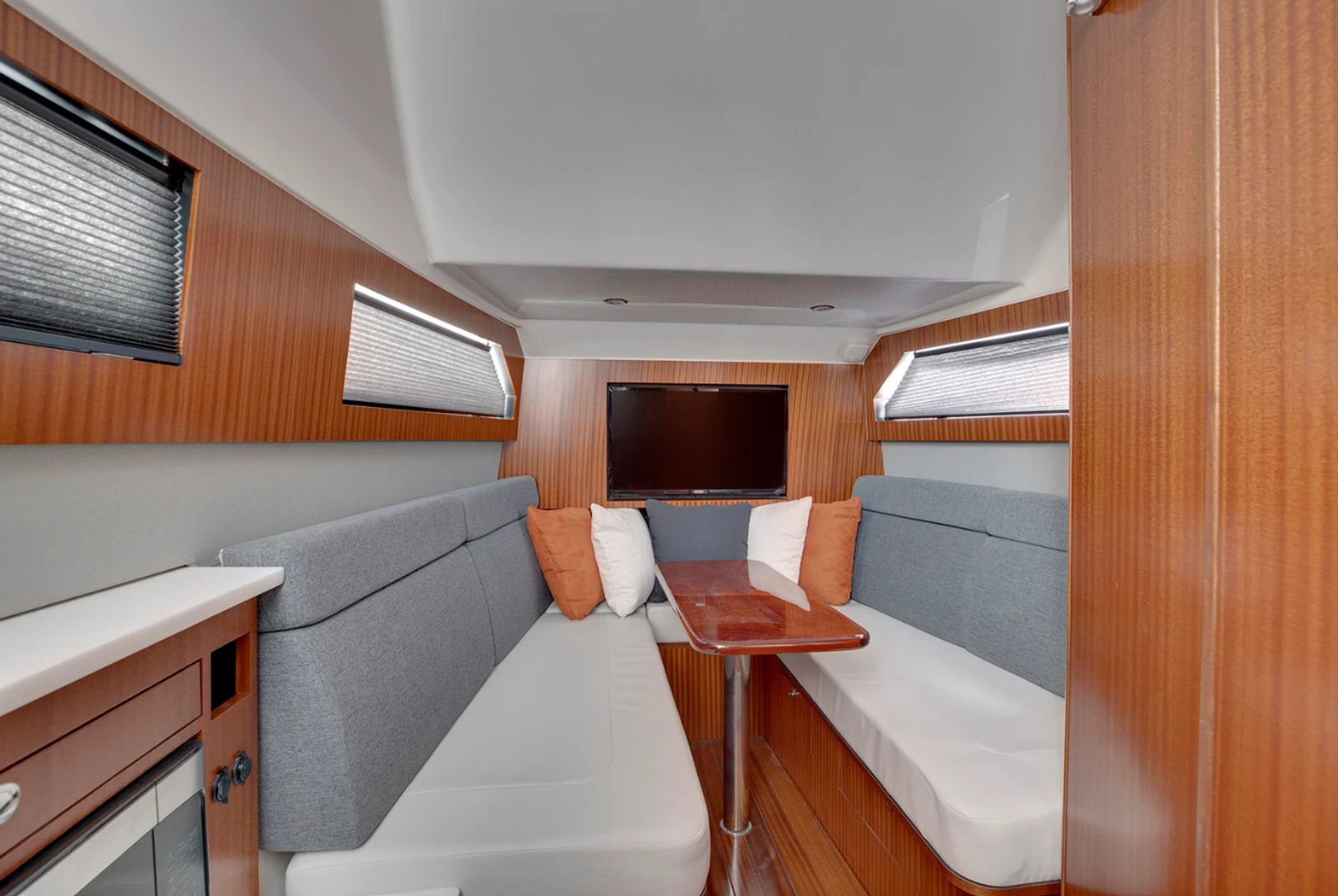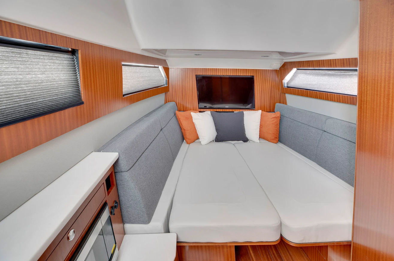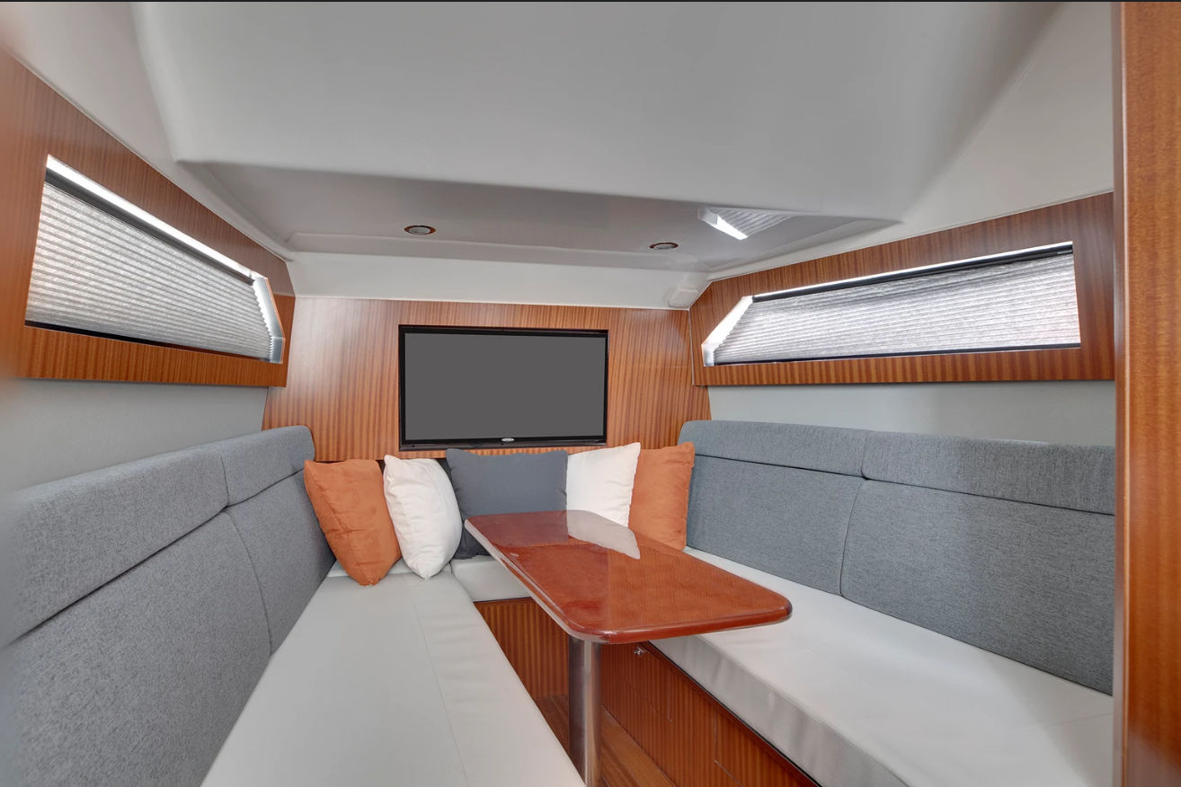 Practicality meets luxury in the Pursuit S 428. The generous storage solutions throughout the boat keep gear, supplies, and personal items neatly stowed yet easily accessible. The advanced helm layout, with intuitive controls and remote spotlight operation, makes docking and navigation straightforward, even for less experienced boaters.Fuel efficiency is enhanced by the boat’s modern design and powerful yet efficient engines, allowing you to cover more water with fewer stops at the fuel dock. The synthetic teak flooring at the helm is not only visually appealing but also easy to clean and maintain, ensuring your boat looks pristine with minimal effort.