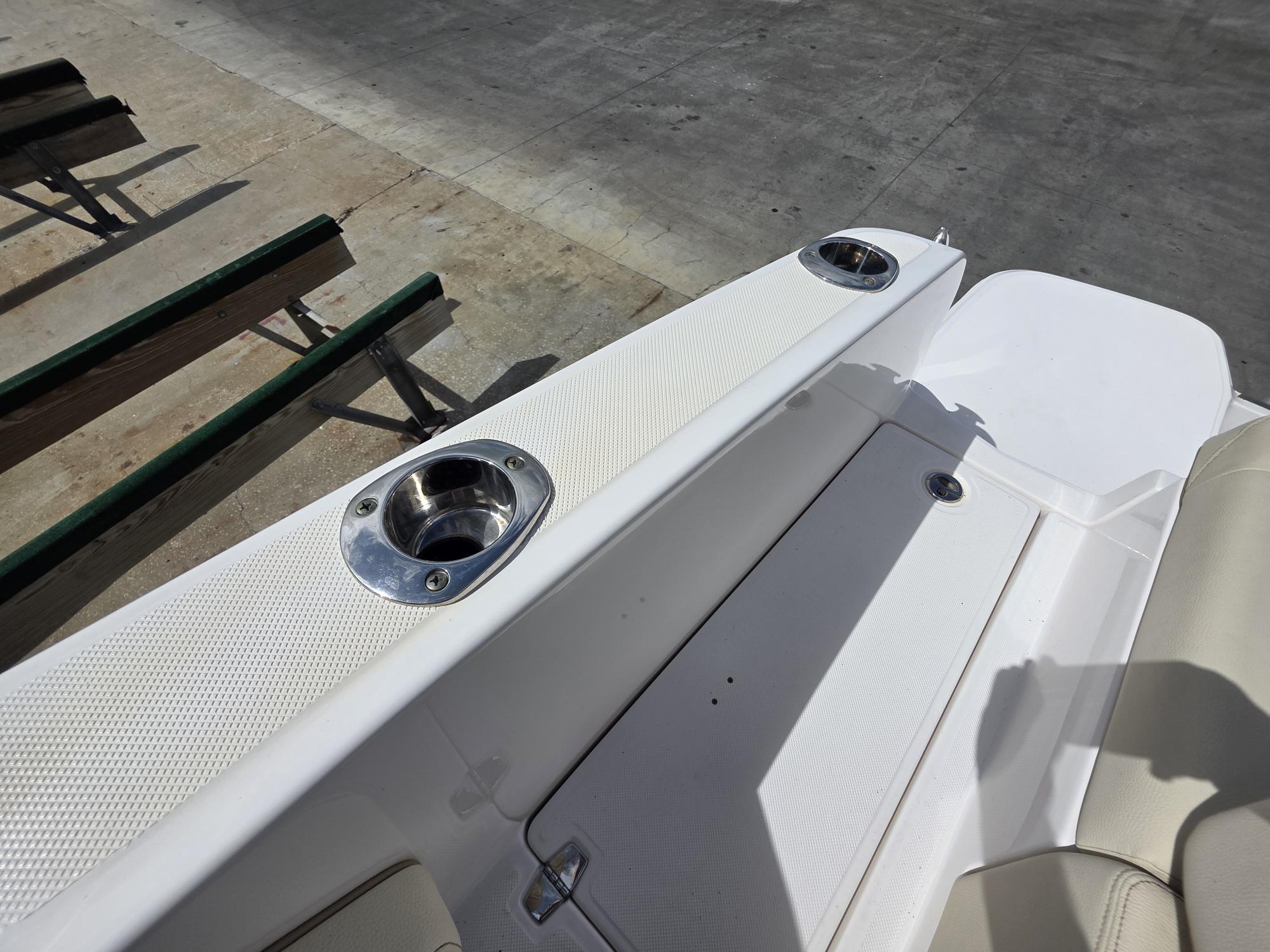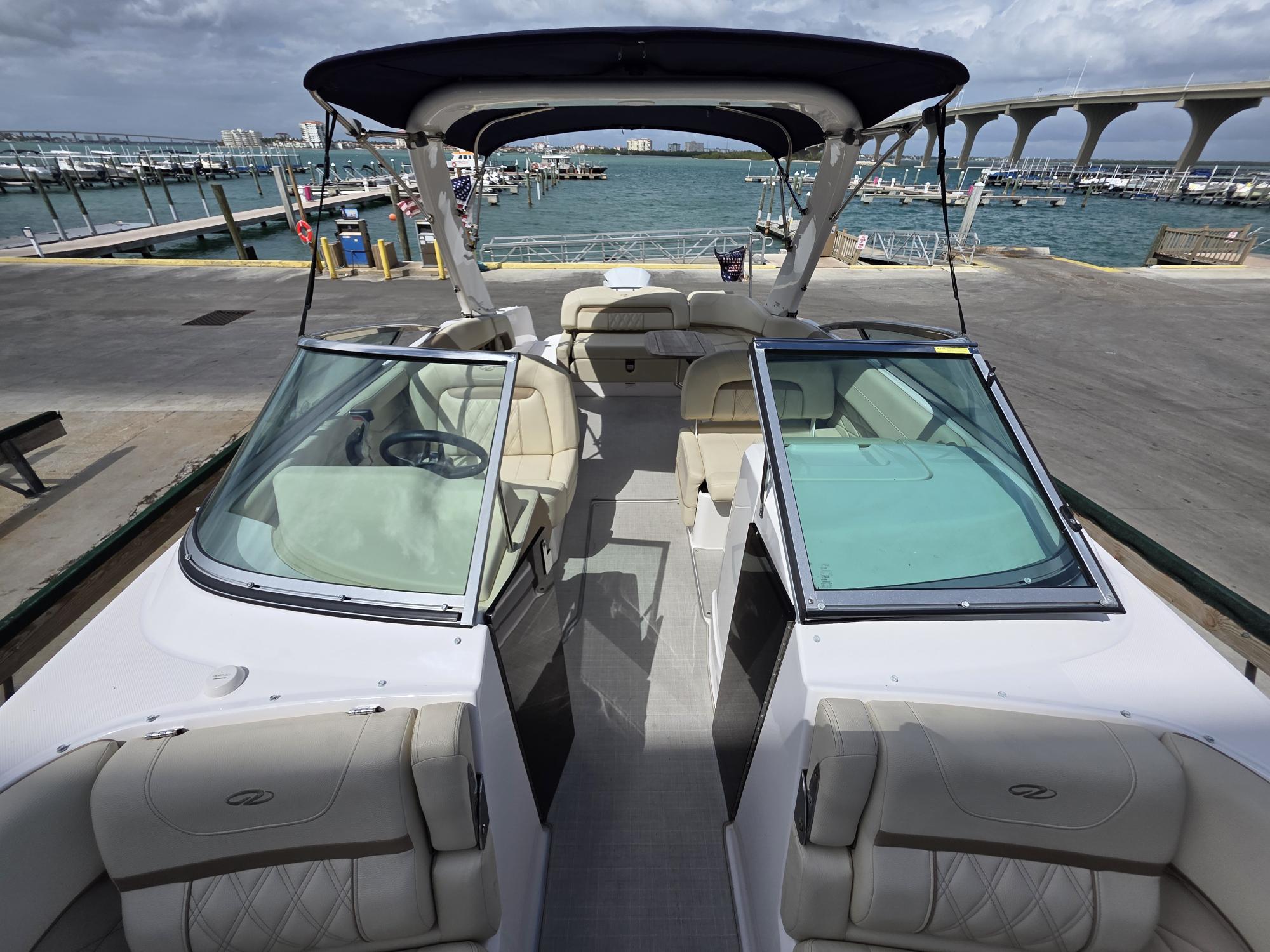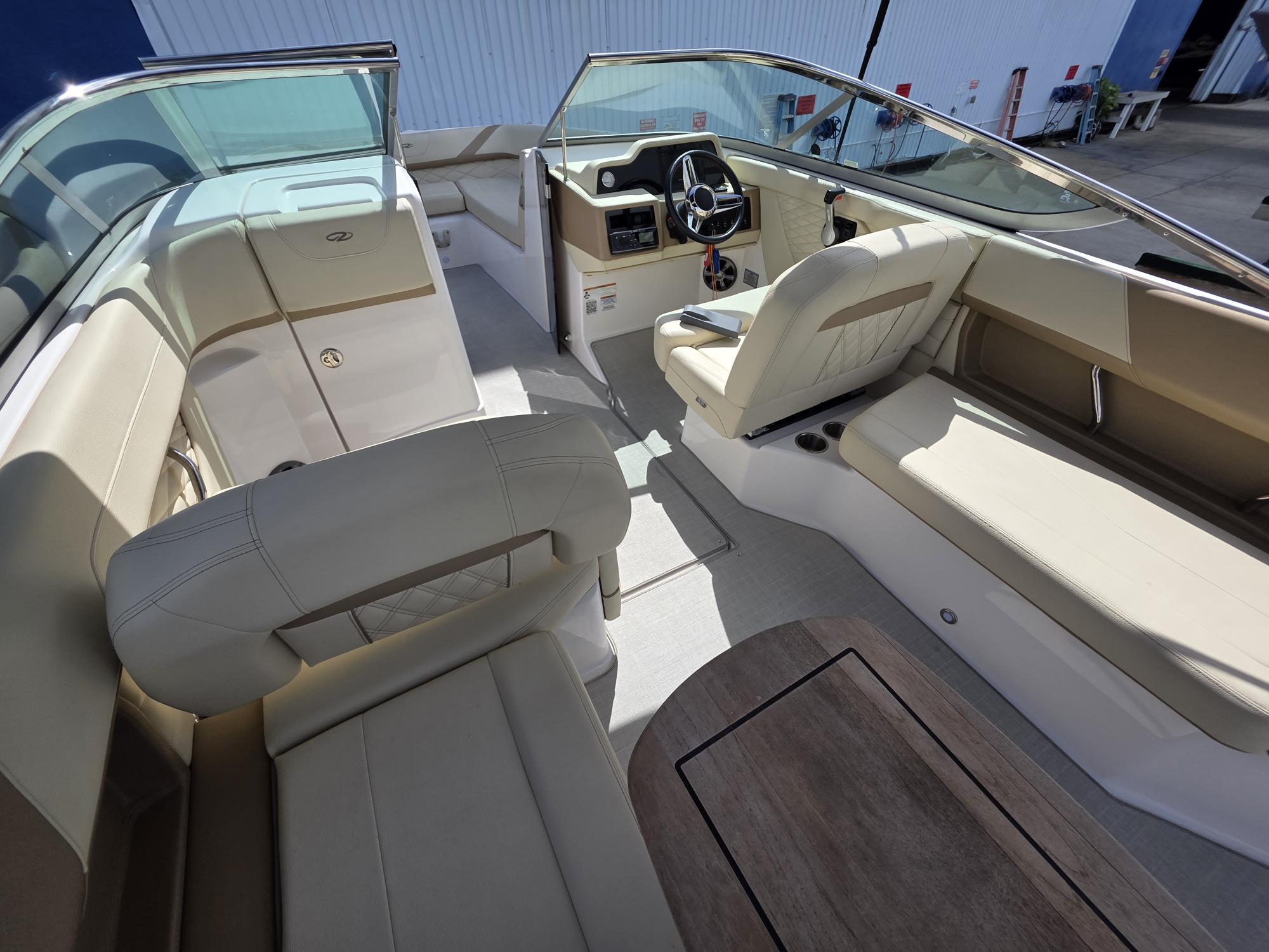 This particular 2020 model has been meticulously maintained and shows pride of ownership throughout. The gel coat retains a deep, glossy shine, and the upholstery remains in excellent condition, reflecting the care it has received. With low engine hours and high-end features, it presents as a standout option in its class.