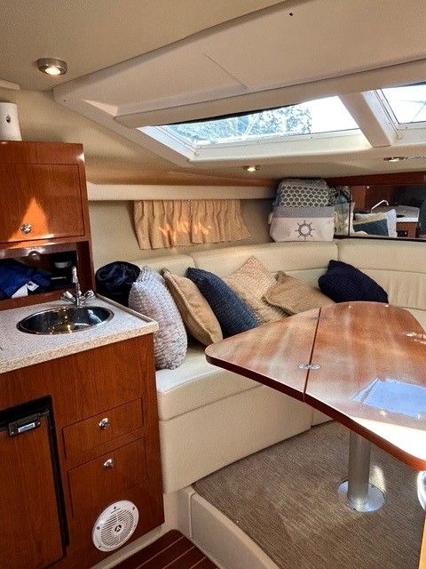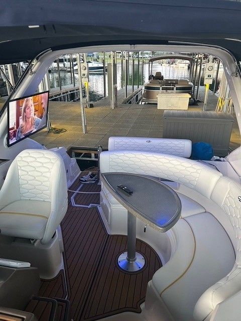 Over the past two seasons, this boat has seen extensive updates that truly set it apart. In 2024, $13,500 was invested including bottom paint, outdrives removed and resealed, new batteries, SeaDek flooring, transom service, and interior carpet. In 2025, it received brand new upholstery, a full mechanical service including impellers, new A/C thermostat, flat screen TV with cover, and LED cockpit lighting. The upgraded Bluetooth stereo with subs and platform controls is a major bonus with over $5K invested.