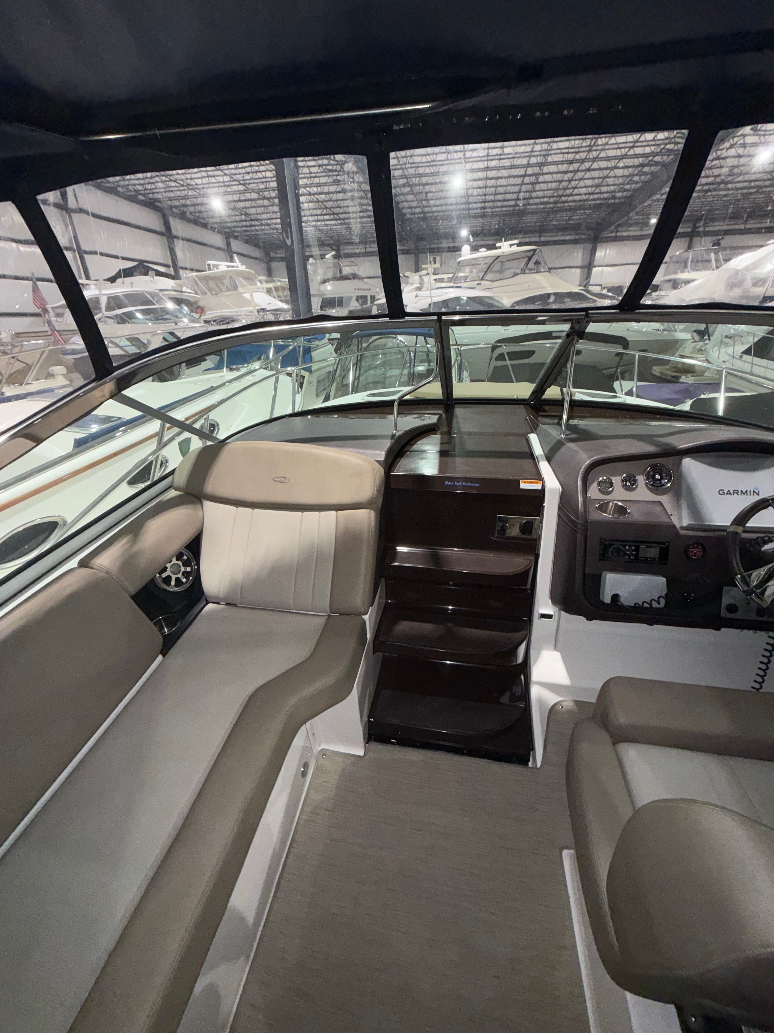 This cruiser boat for sale is equipped with a range of special features that enhance both comfort and convenience. The four onboard batteries ensure reliable power for all your electronics and amenities, while the battery charger keeps everything running smoothly during extended trips. The aft bench seat and aft cabin stateroom provide versatile seating and sleeping options, making it easy to accommodate family and friends for overnight stays or day cruises. Elegant cabinetry adds a touch of sophistication to the interior, offering practical storage solutions for your gear and personal items.The camper enclosure, featuring navy canvas that is only three years old, offers protection from the elements and extends your boating season. The cockpit carpet adds a layer of comfort underfoot, while the ample cockpit storage keeps your space organized and clutter-free. These features combine to create a welcoming environment that’s perfect for entertaining, relaxing, or simply enjoying the beauty of the water.